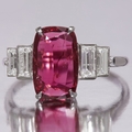 RUBY AND DIAMOND RING, Set to the center with a large ruby of approx. 11.2 x 7.14 mm. Flanked with 2 baguette cut diamonds on each shoulder. Size N 1/2. 4.5 grams.
