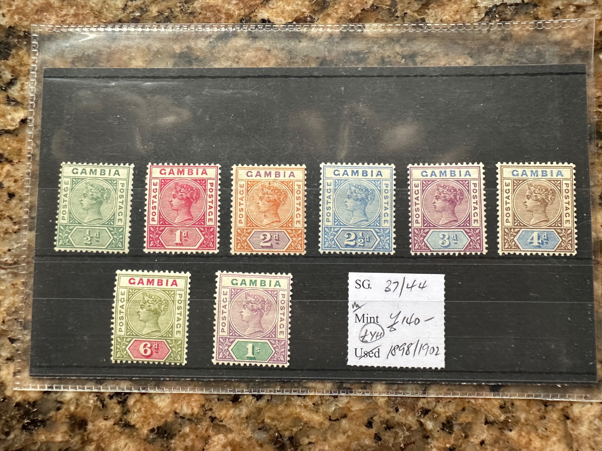 Gambia 1898/1902 1/2d to 1/- (8), m/m. (SG 37/44). Cat £140
