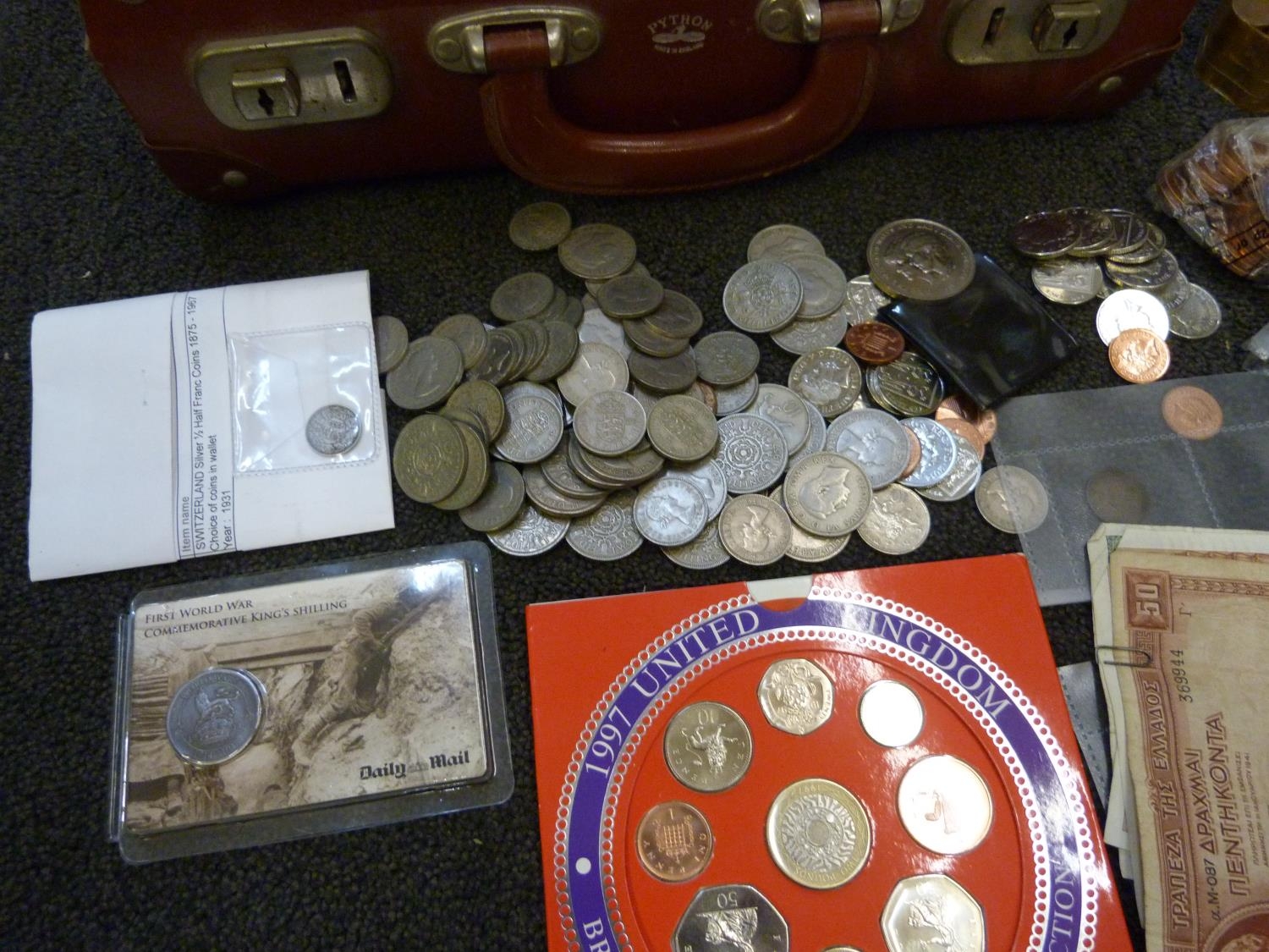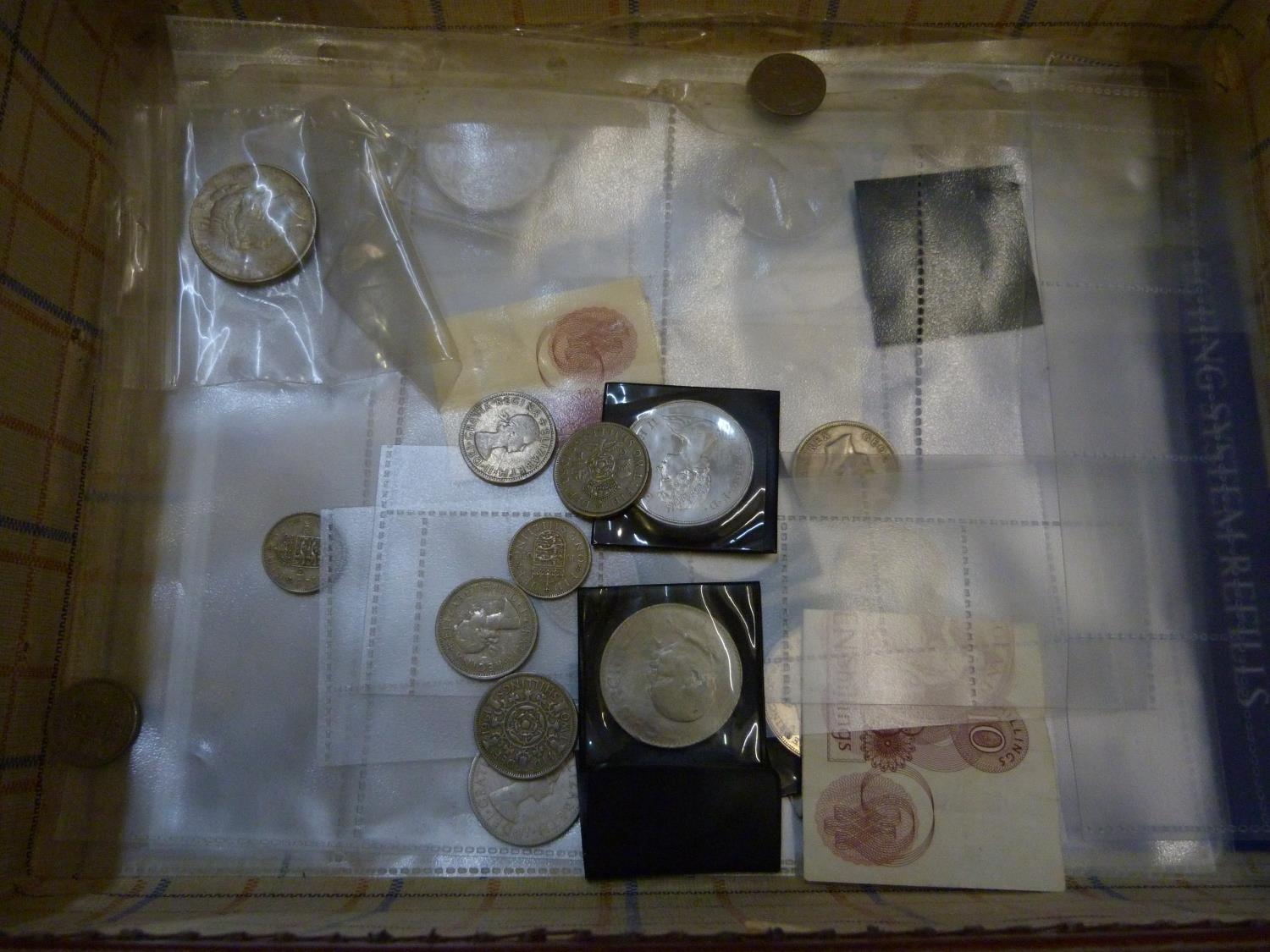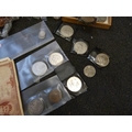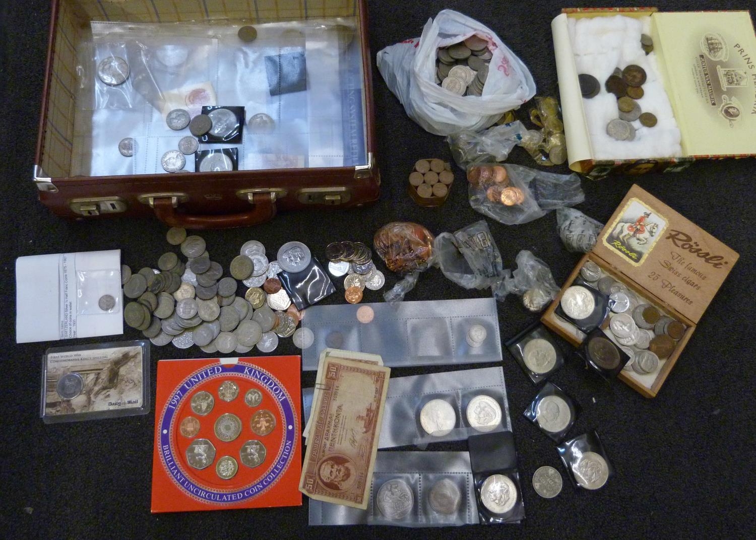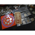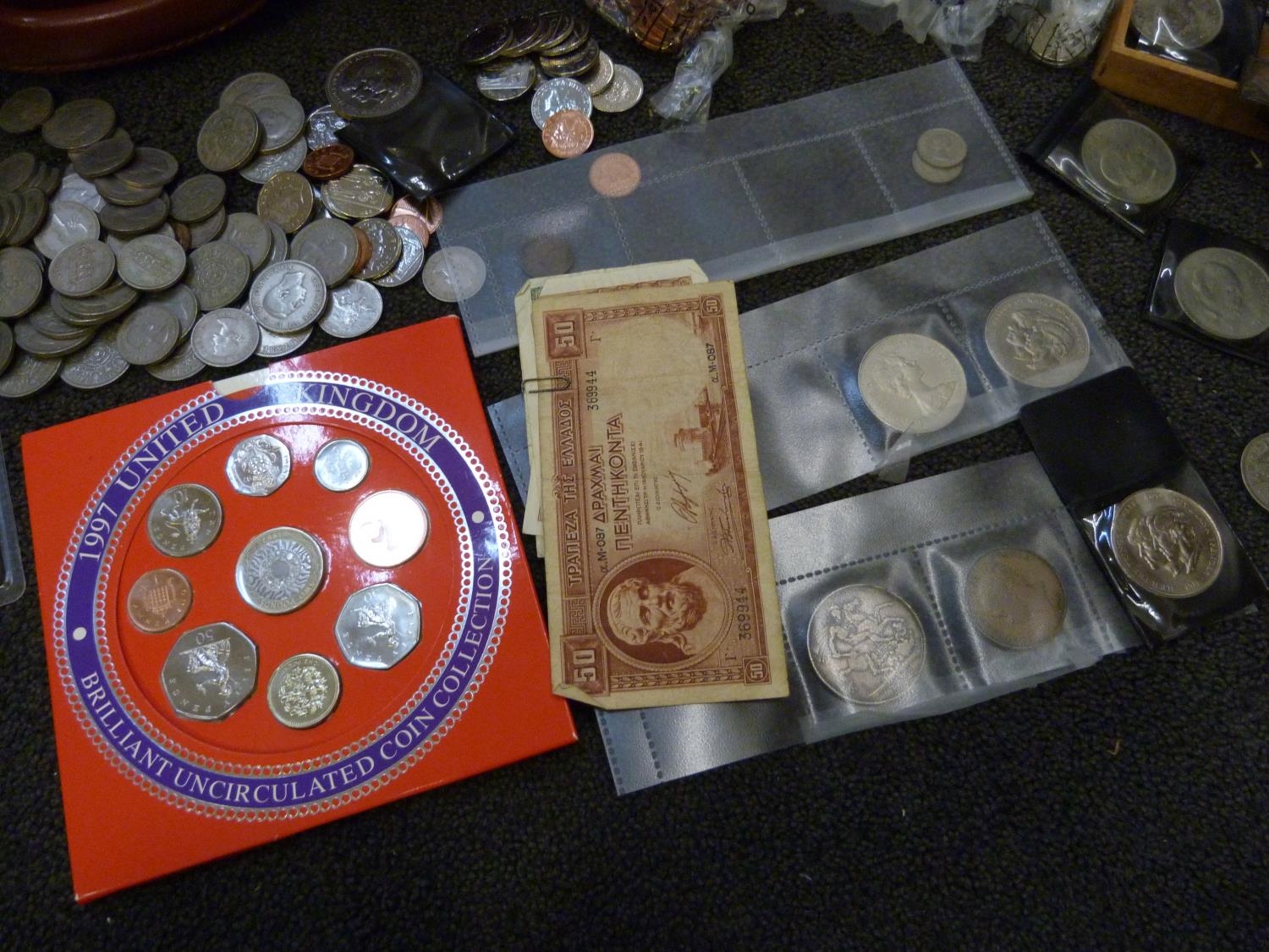 A collection of coins, mainly British including commemorative and a 1997 UK Brilliant Uncirculated Coin Collection, two $1 coins, both 1925 and some bank notes