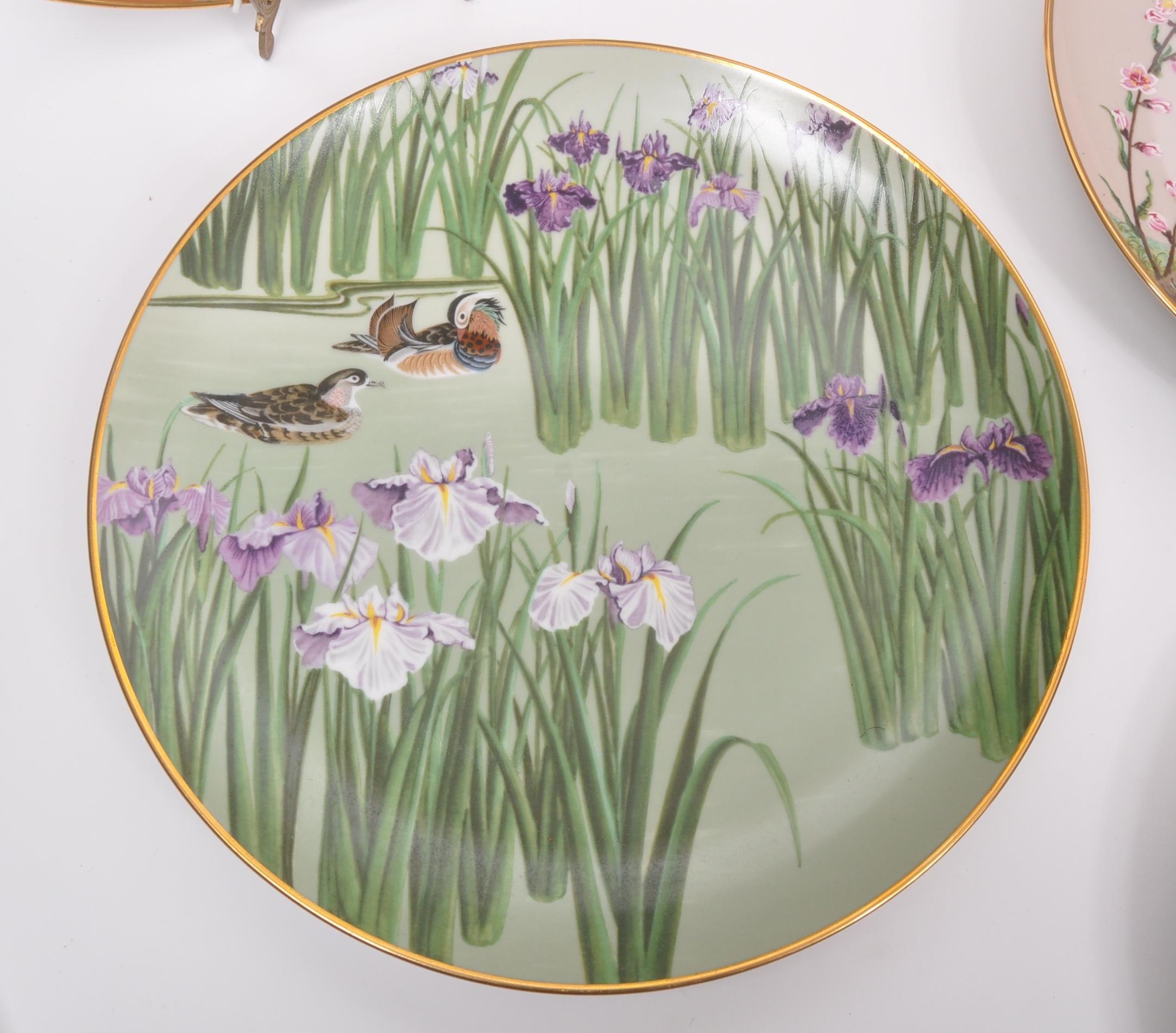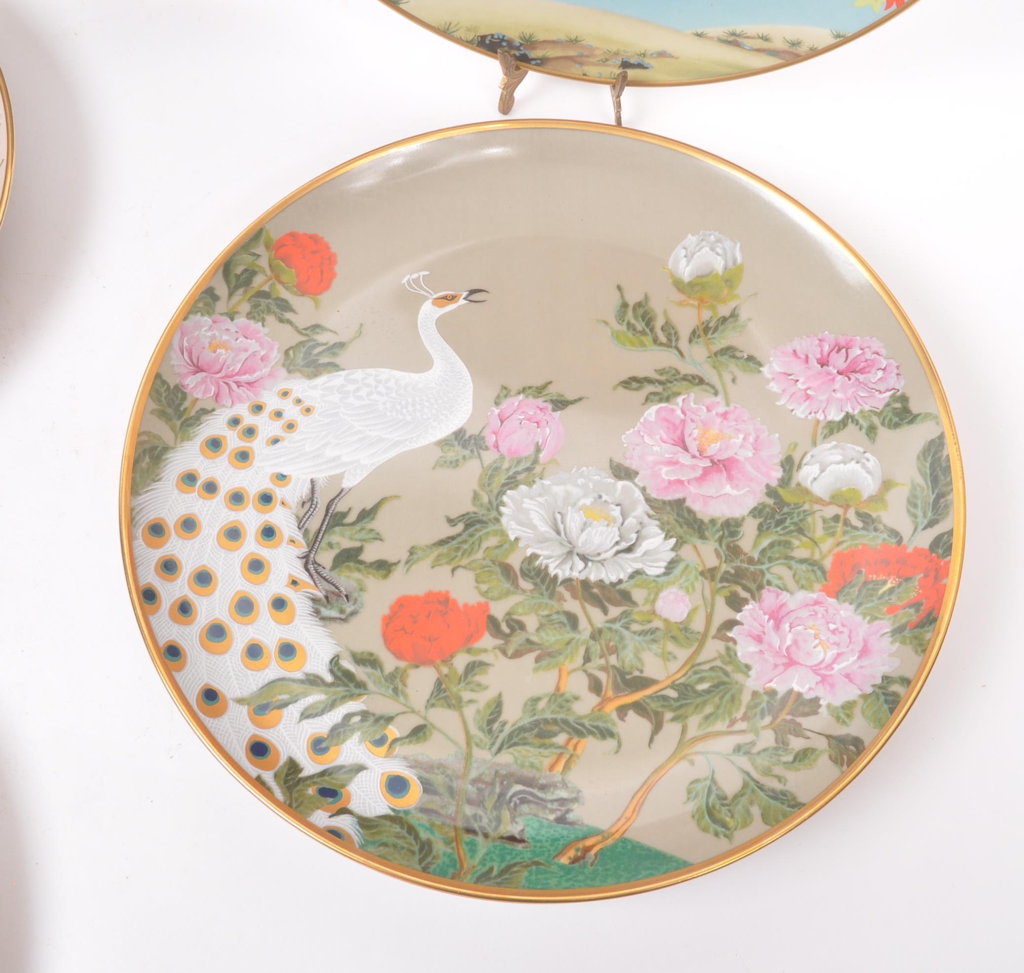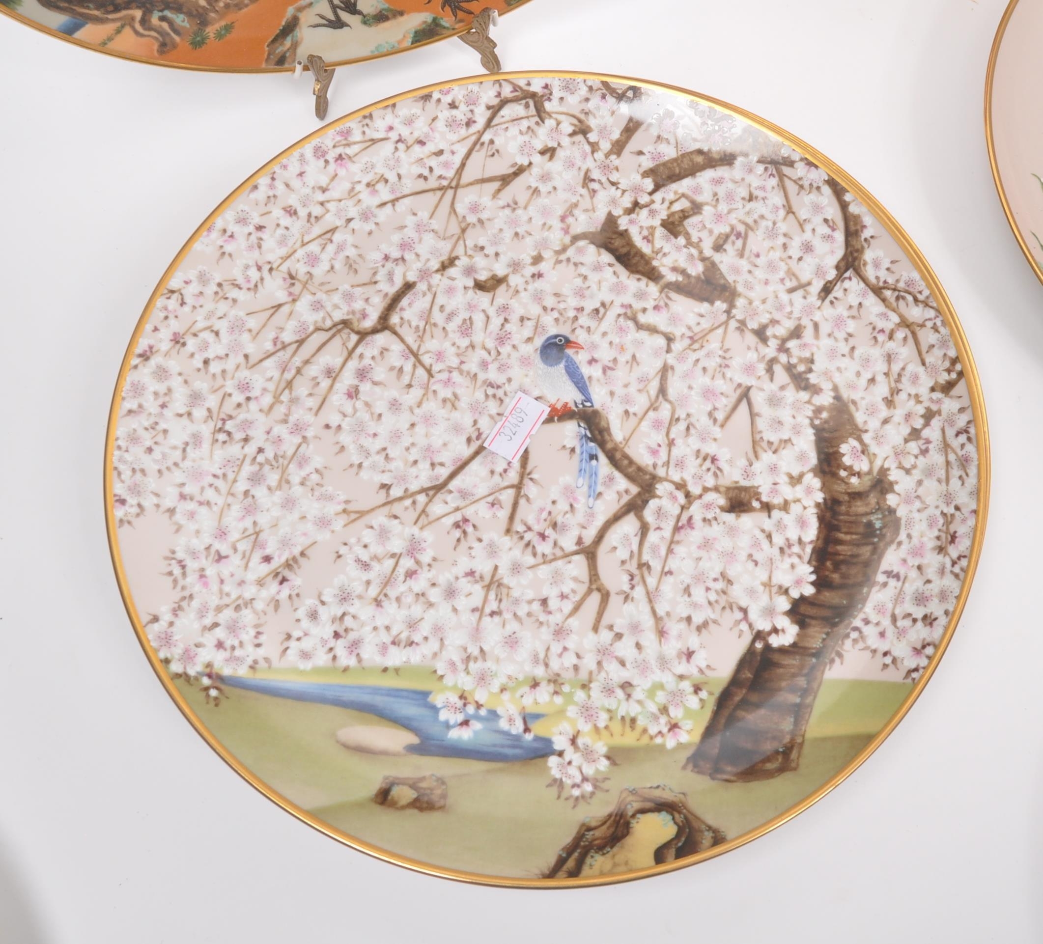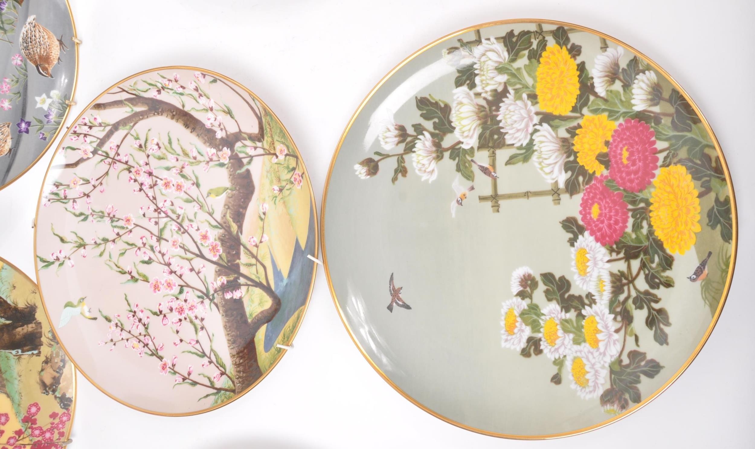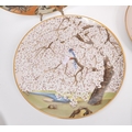 A collection of Japanese porcelain china vintage 20th century circa 1970s display / wall plates. With hand painted scenes of cherry blossoms, crane birds and foliate designs. Franklin porcelain within the flowers and birds. Limited edition premium porcelain. Measures approx. 27 diameter.