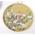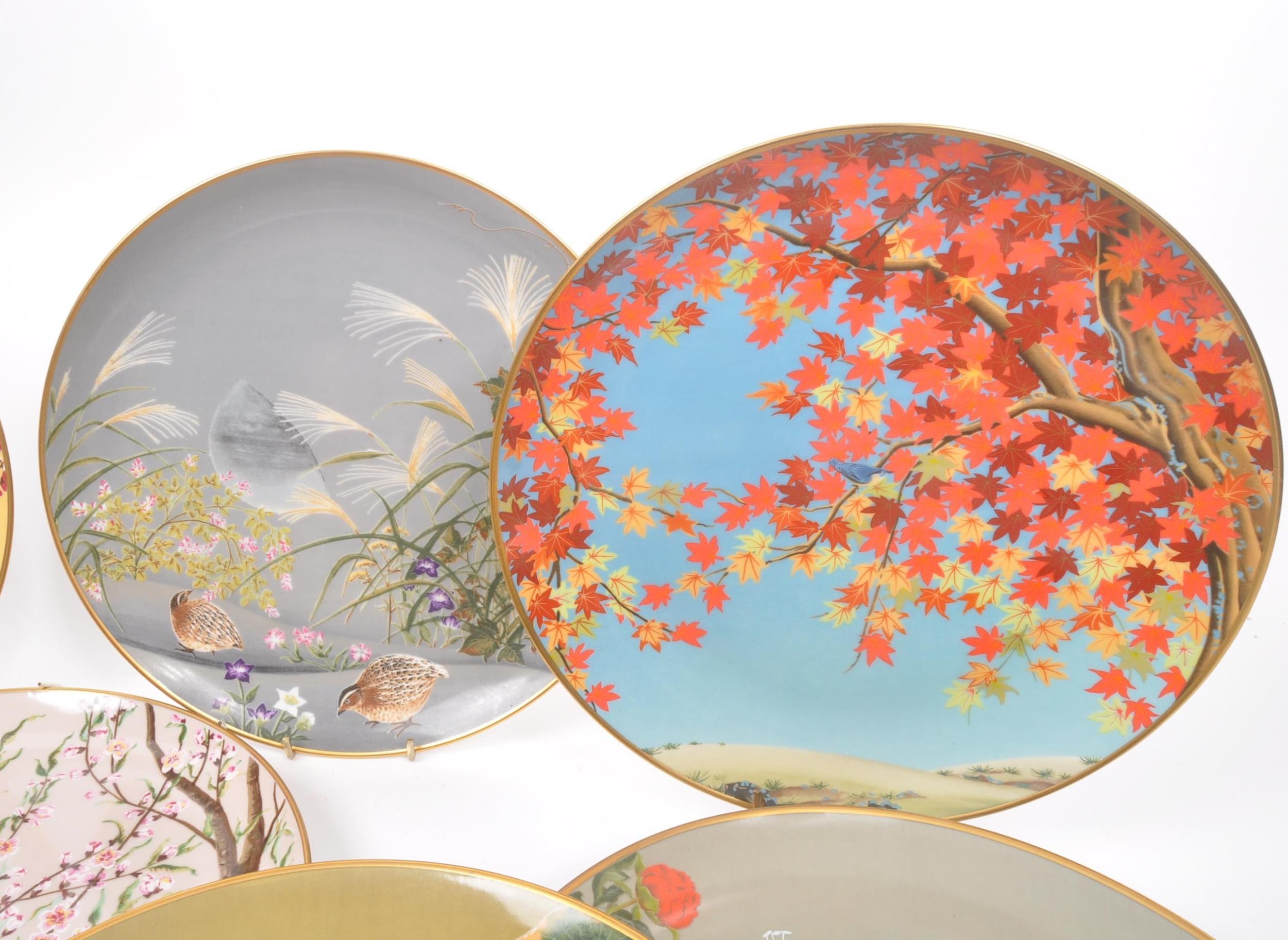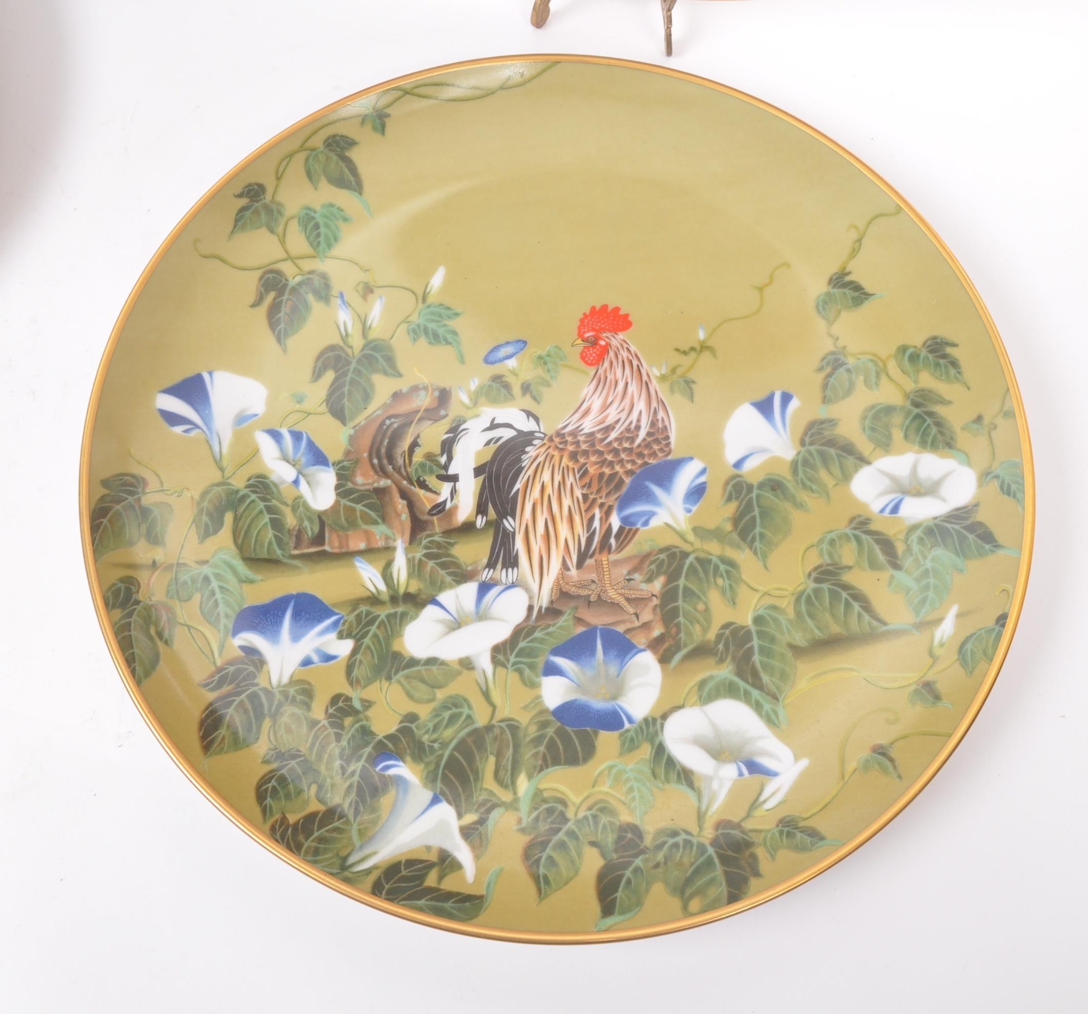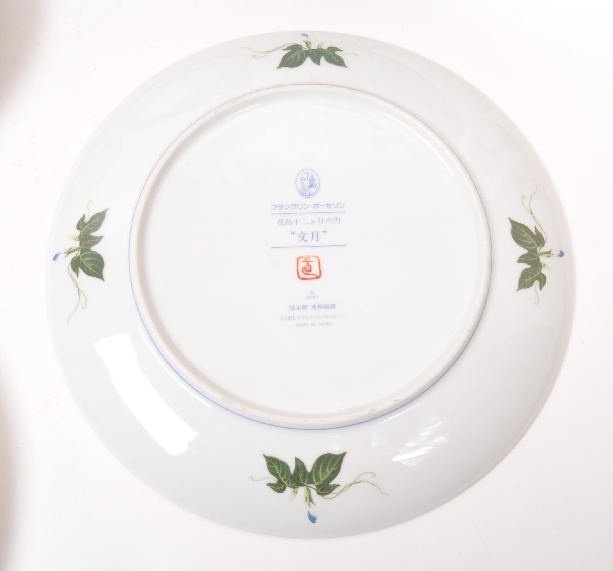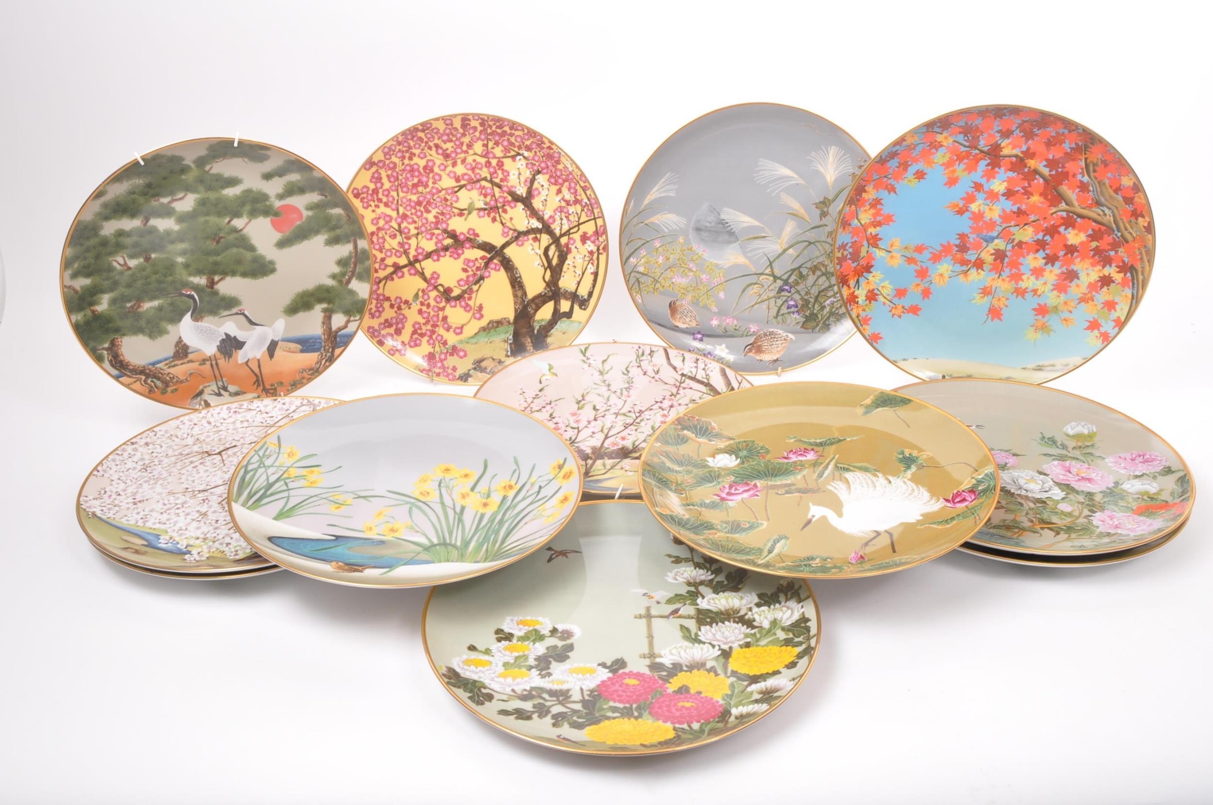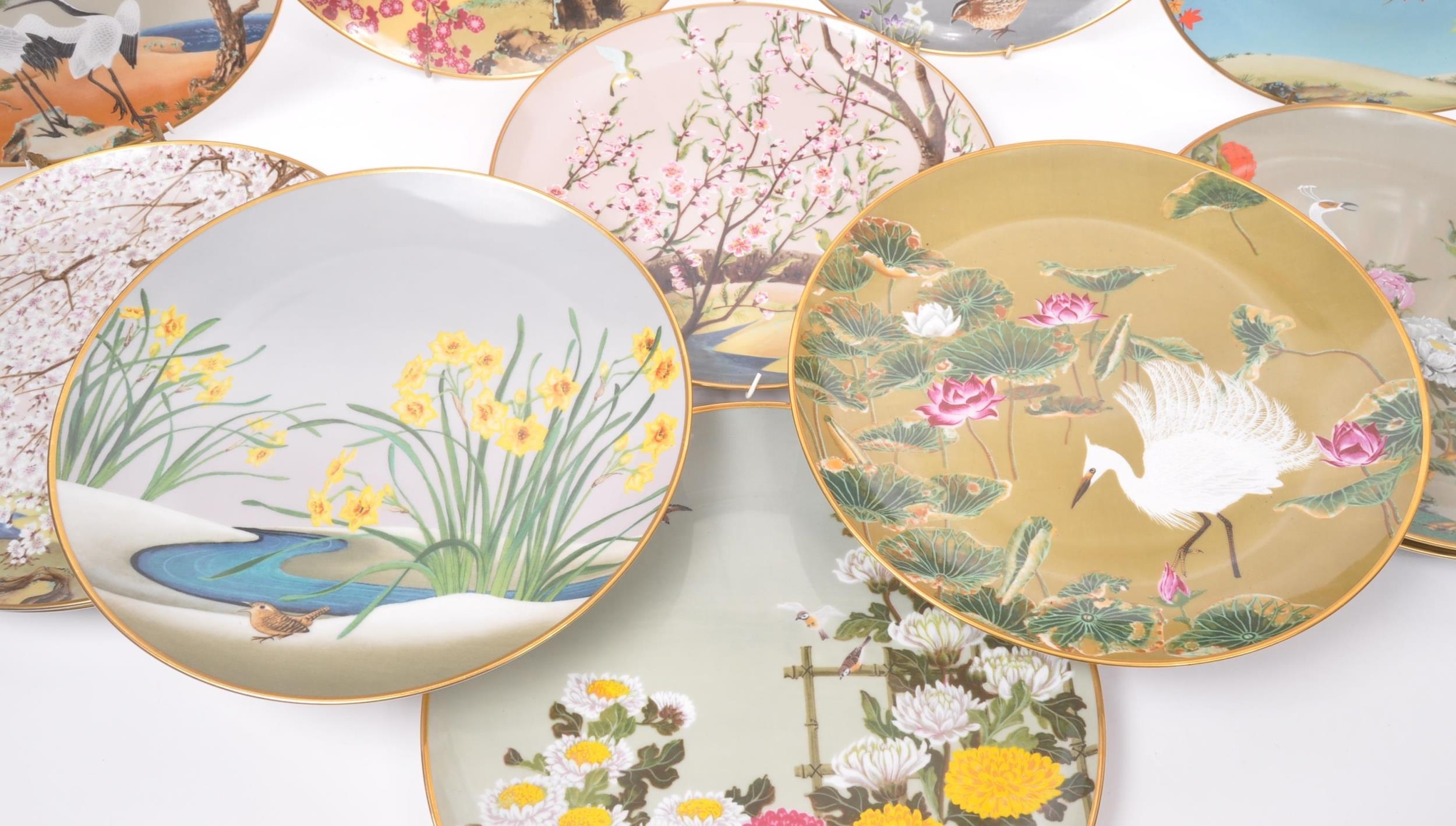 A collection of Japanese porcelain china vintage 20th century circa 1970s display / wall plates. With hand painted scenes of cherry blossoms, crane birds and foliate designs. Franklin porcelain within the flowers and birds. Limited edition premium porcelain. Measures approx. 27 diameter.