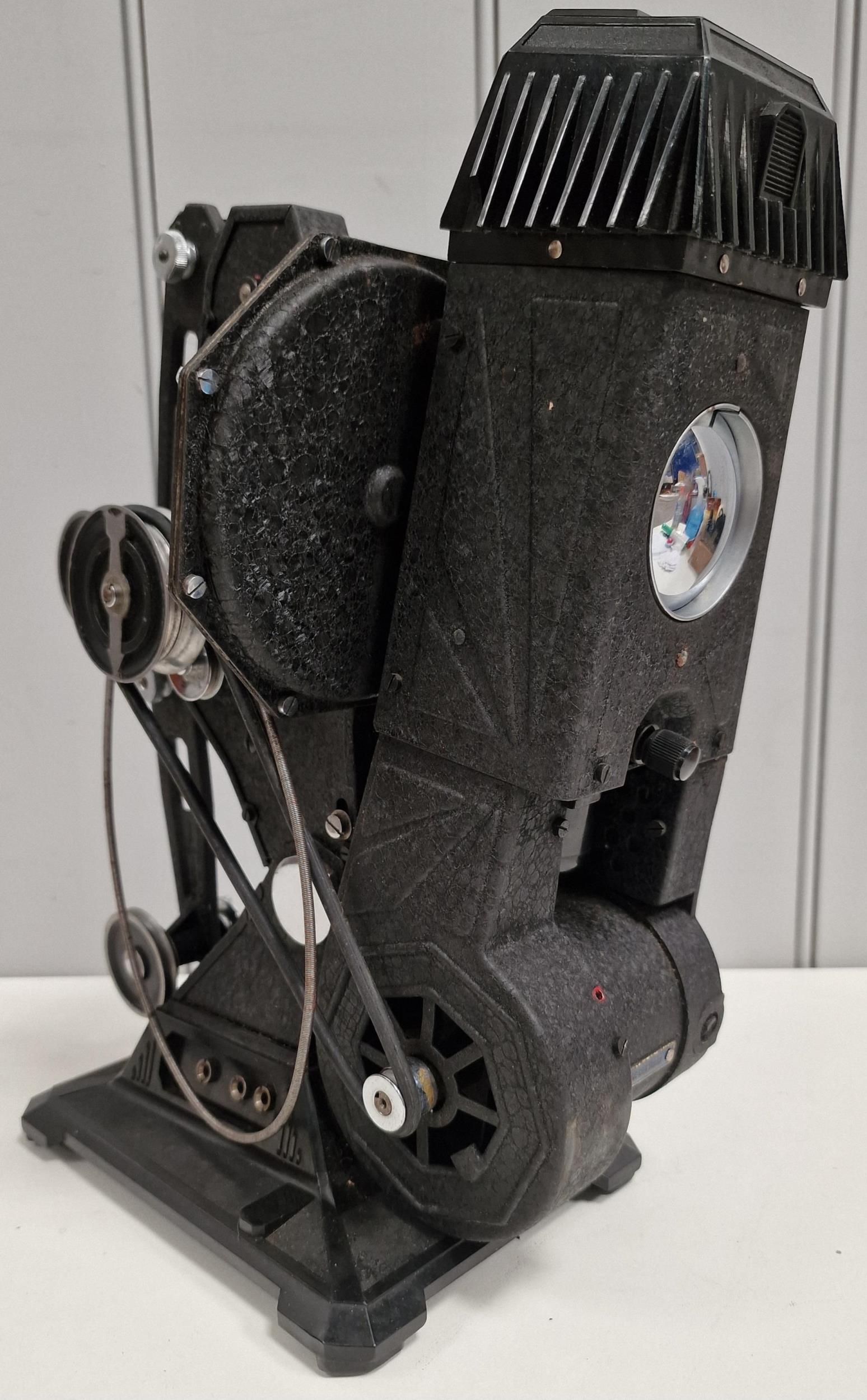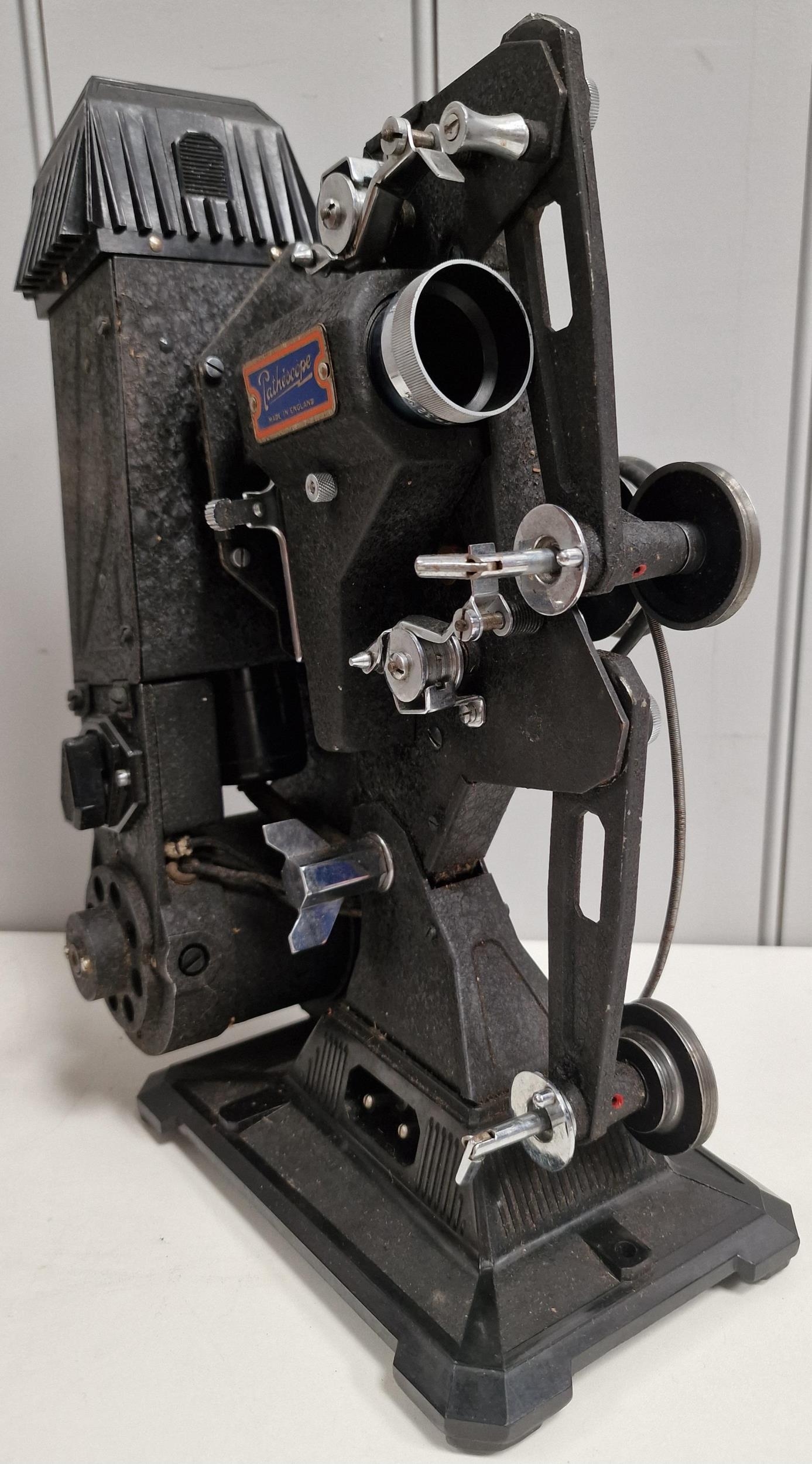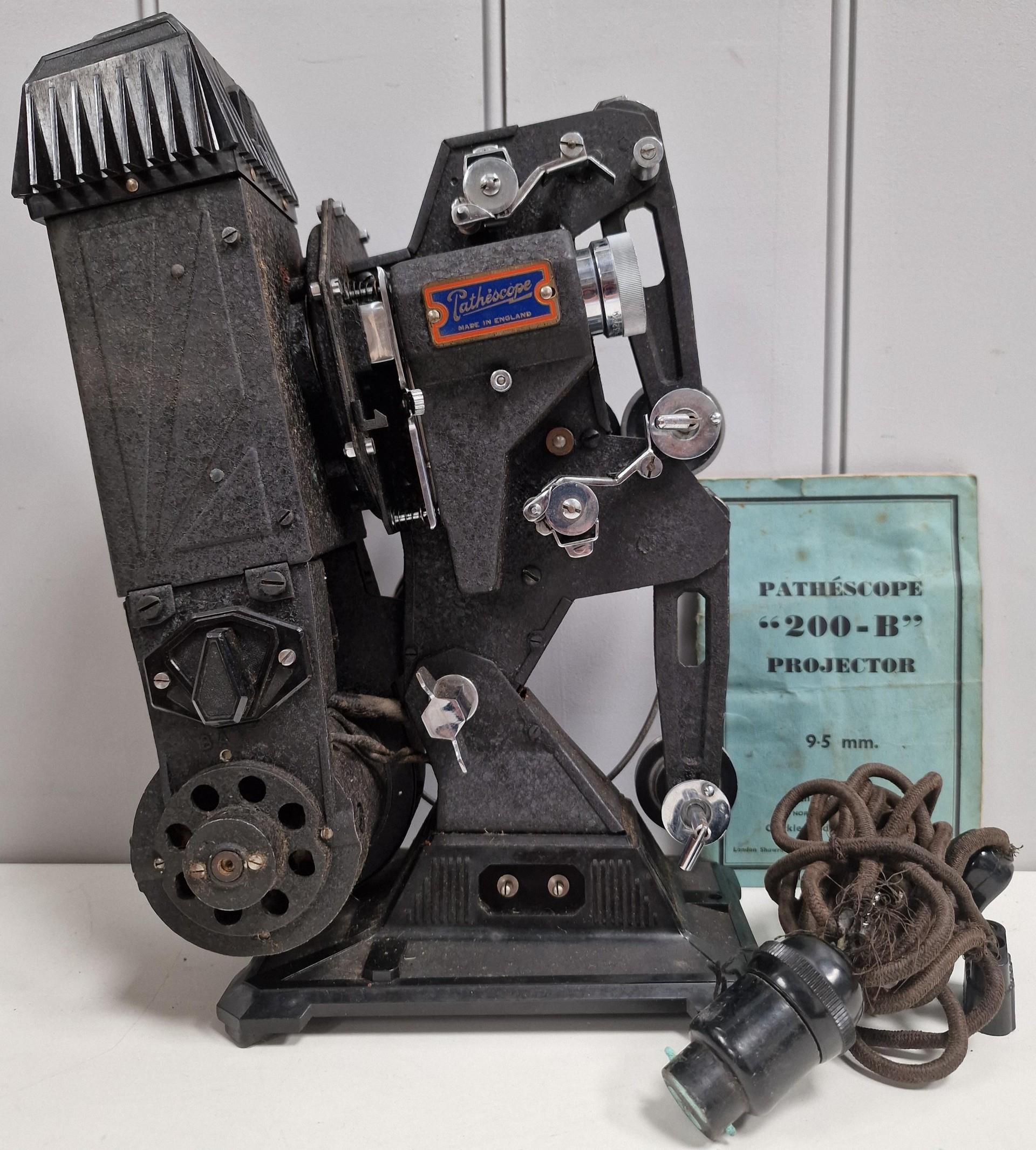 A Pathescope 9.5mm projector, c.1930's. Complete with attractive wooden case. PAT test fail & will require re-wiring if use considered.