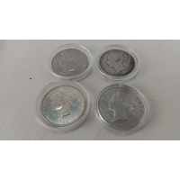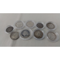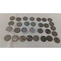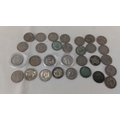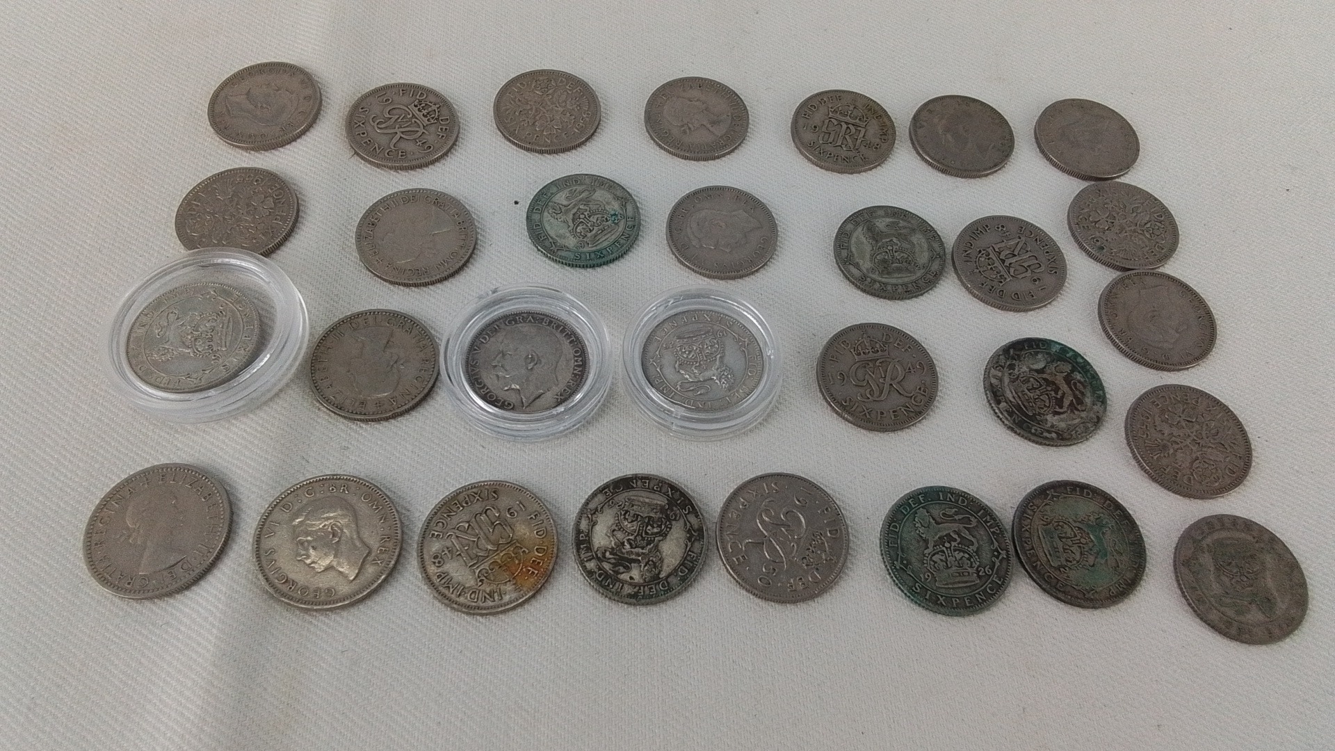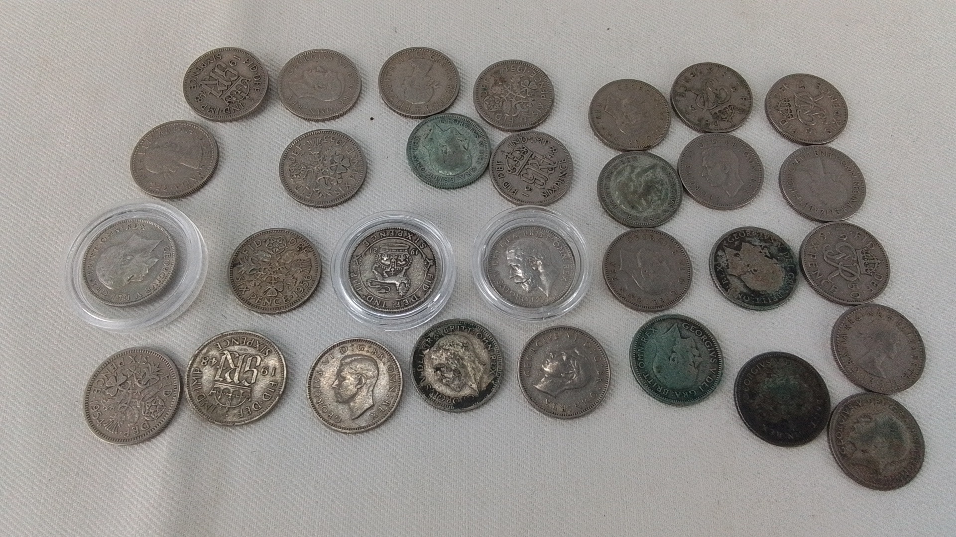 Group of approximately British coins, chiefly George V and George VI issues including florins and sixpences, several with patinated surfaces; some housed in clear plastic capsules.