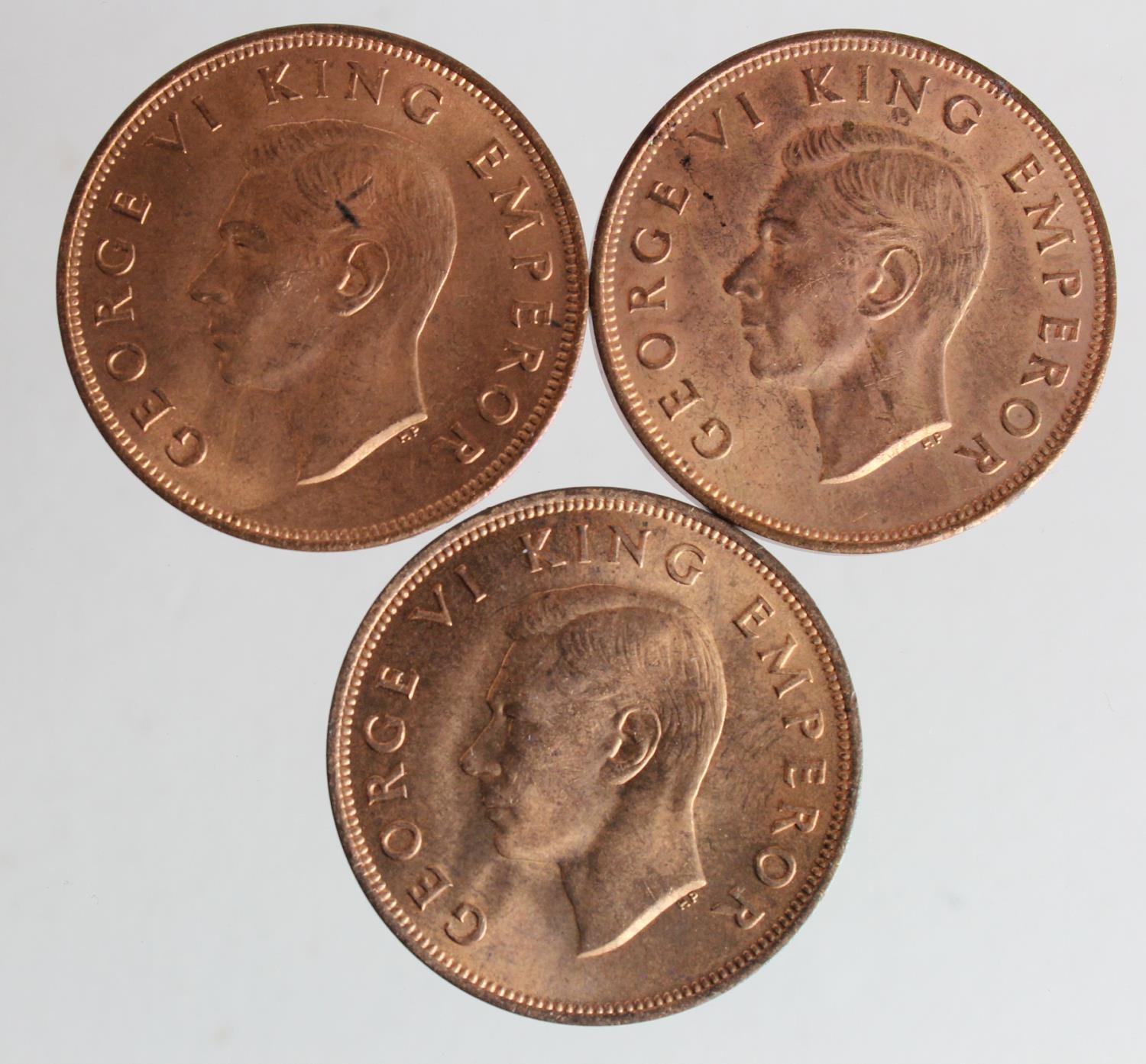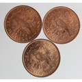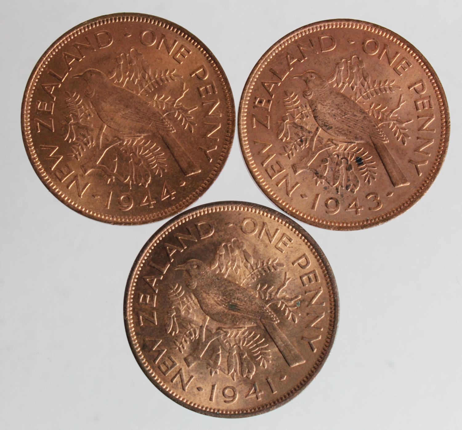 New Zealand Pennies (3): 1941, 1943, and 1944; BU, a few spots.