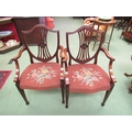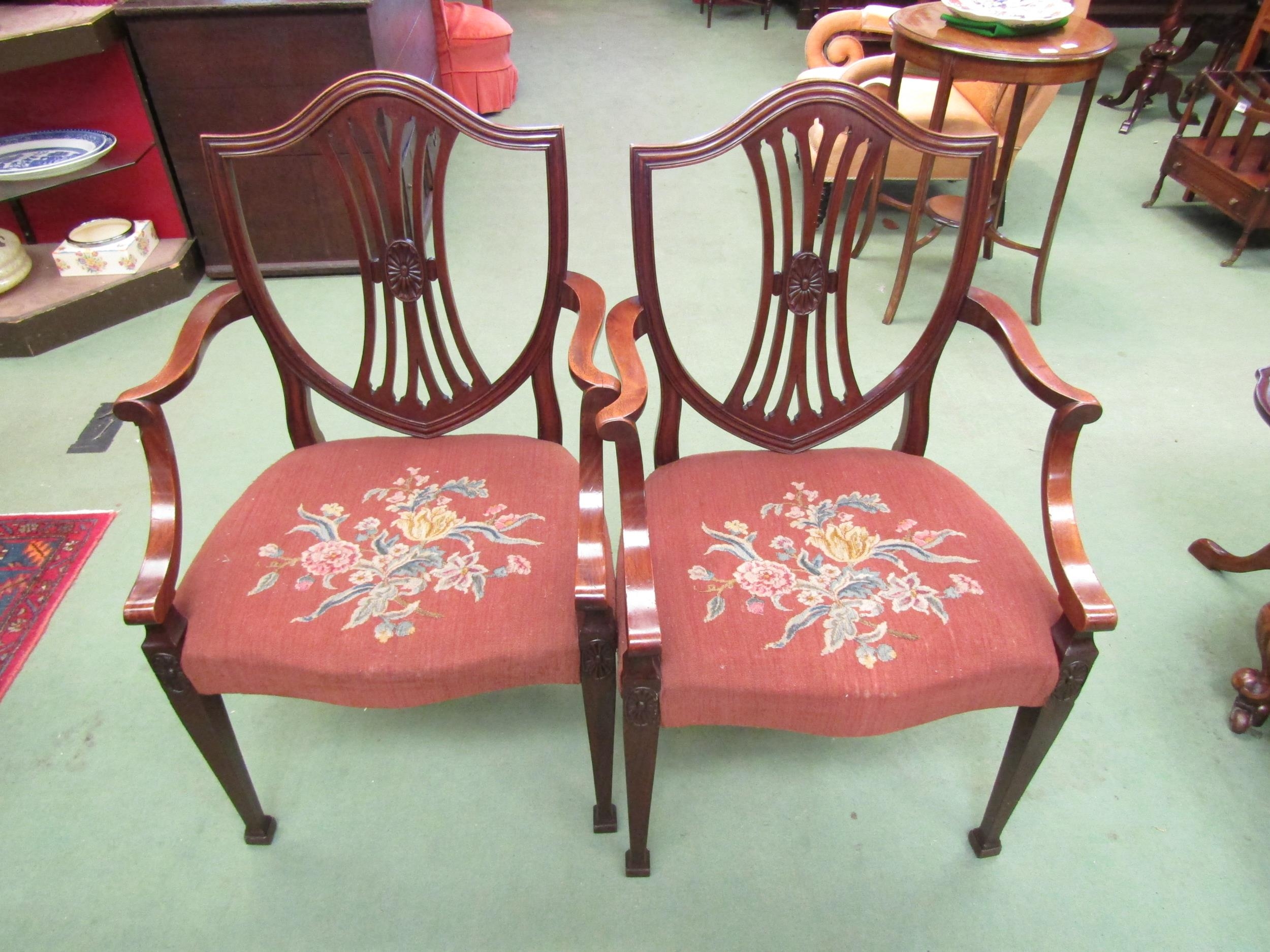 A pair of Georgian Hepplewhite style shield-back armchairs the fretted central splat and outswept scroll arms over a floral needlepoint serpentine front seat (R) £60