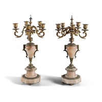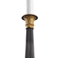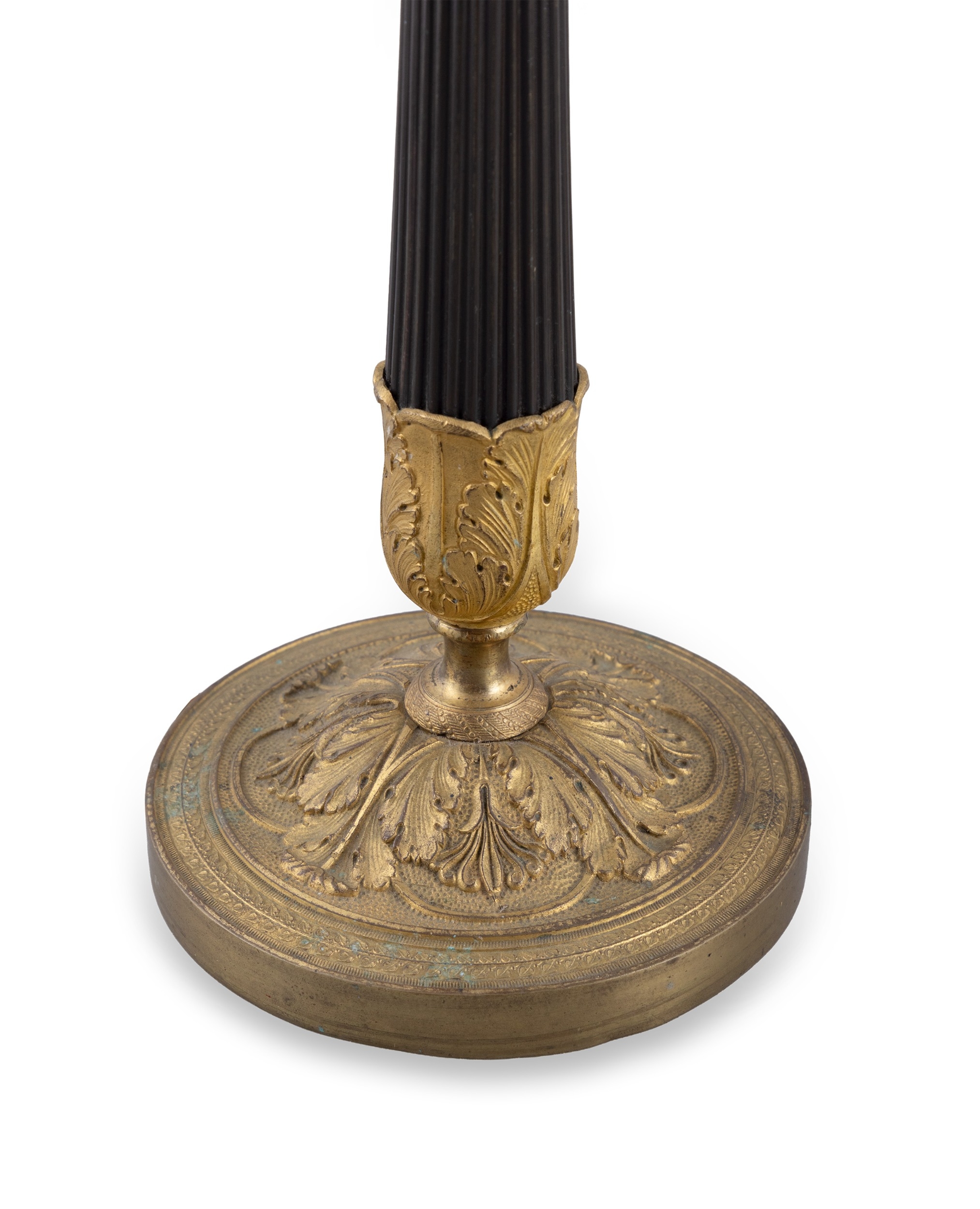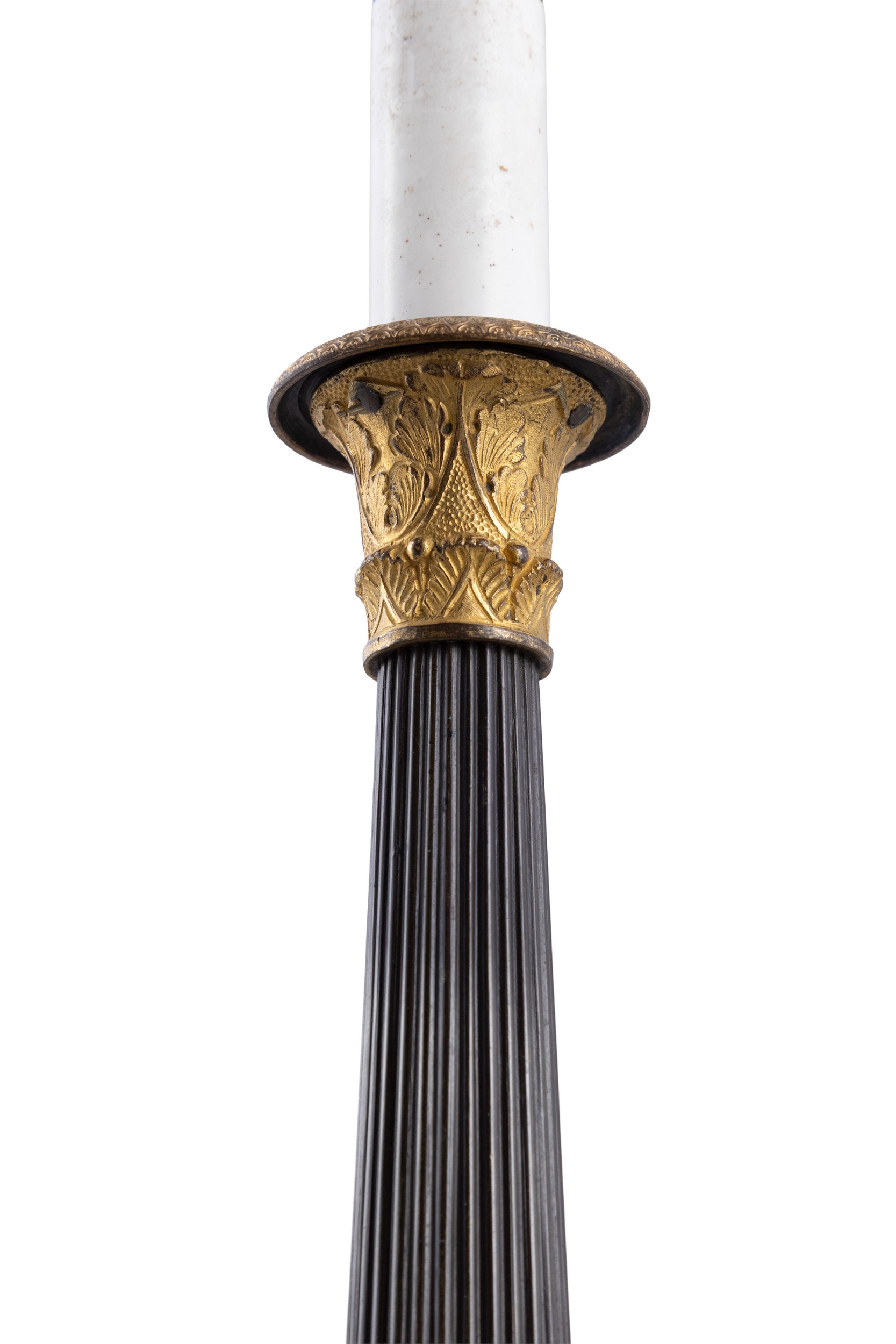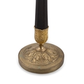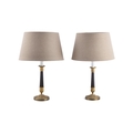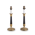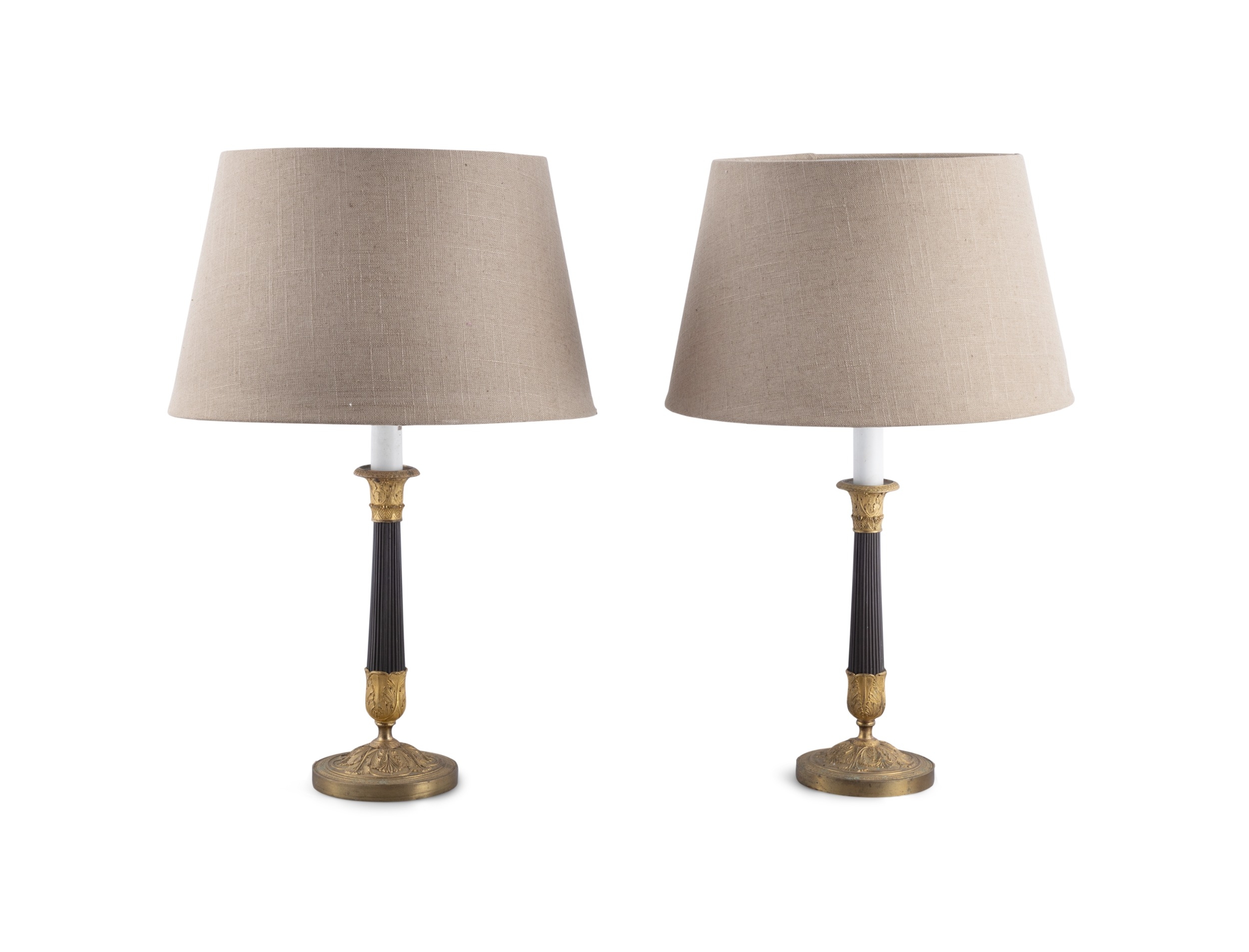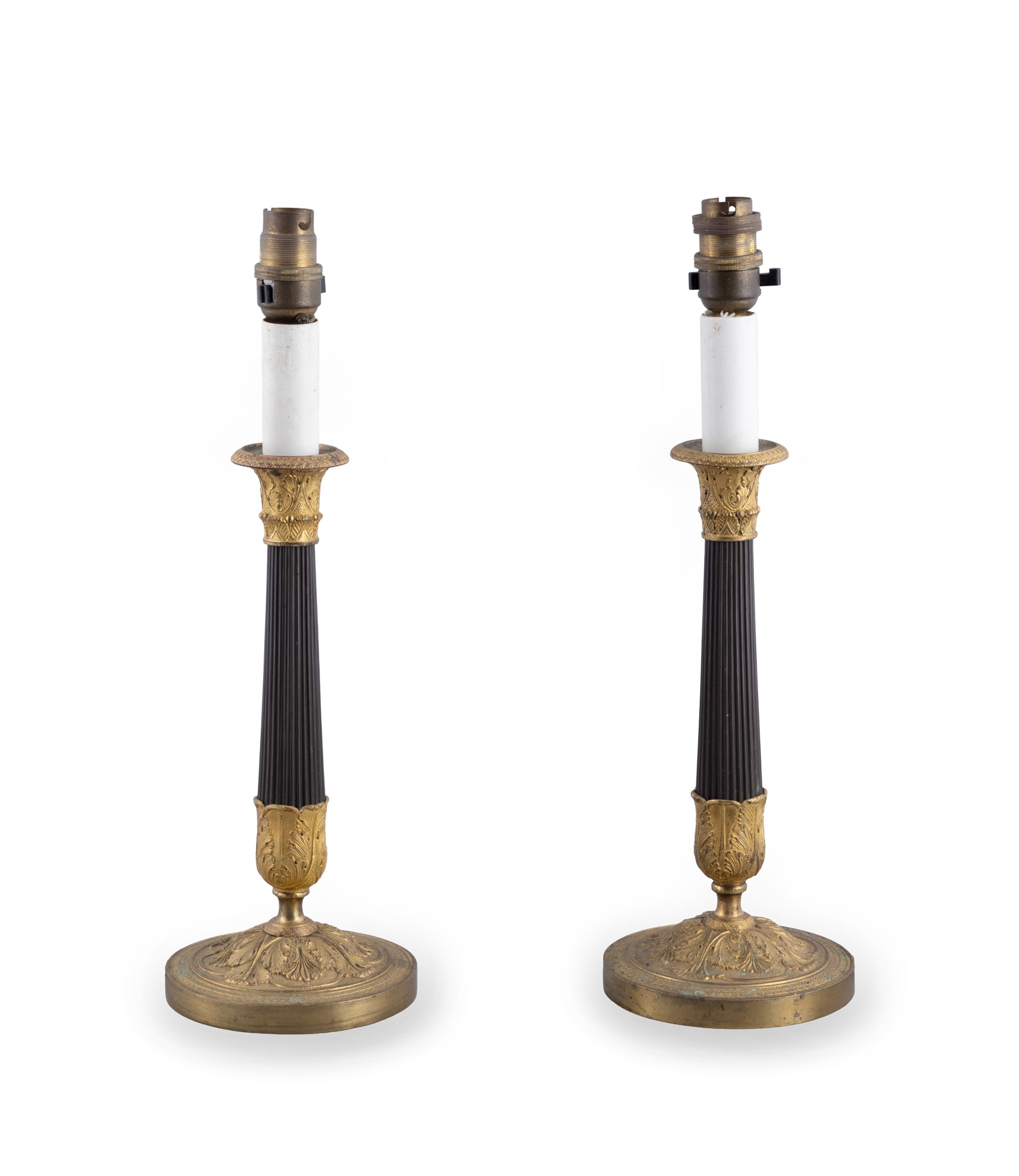 A PAIR OF ORMOLU AND BLACK PAINTED TABLE LAMPS (E) fluted central column, on acanthus capped circular bases, with cream linen Vaughan shades. Each 39cm high ELECTRICAL GOOD IN NEED OF REWIRING ARE INDICATED BY THE SYMBOL **'(E)'** These are sold as 'antiques' only and if bought for use, buyers must have them checked over for compliance with safety regulations by a qualified electrician before you use them. Adam's does not take responsibility for non-functioning electrical goods as most second-hand electrical items sold at auction require re-wiring even if functioning at the time of the auction viewing.