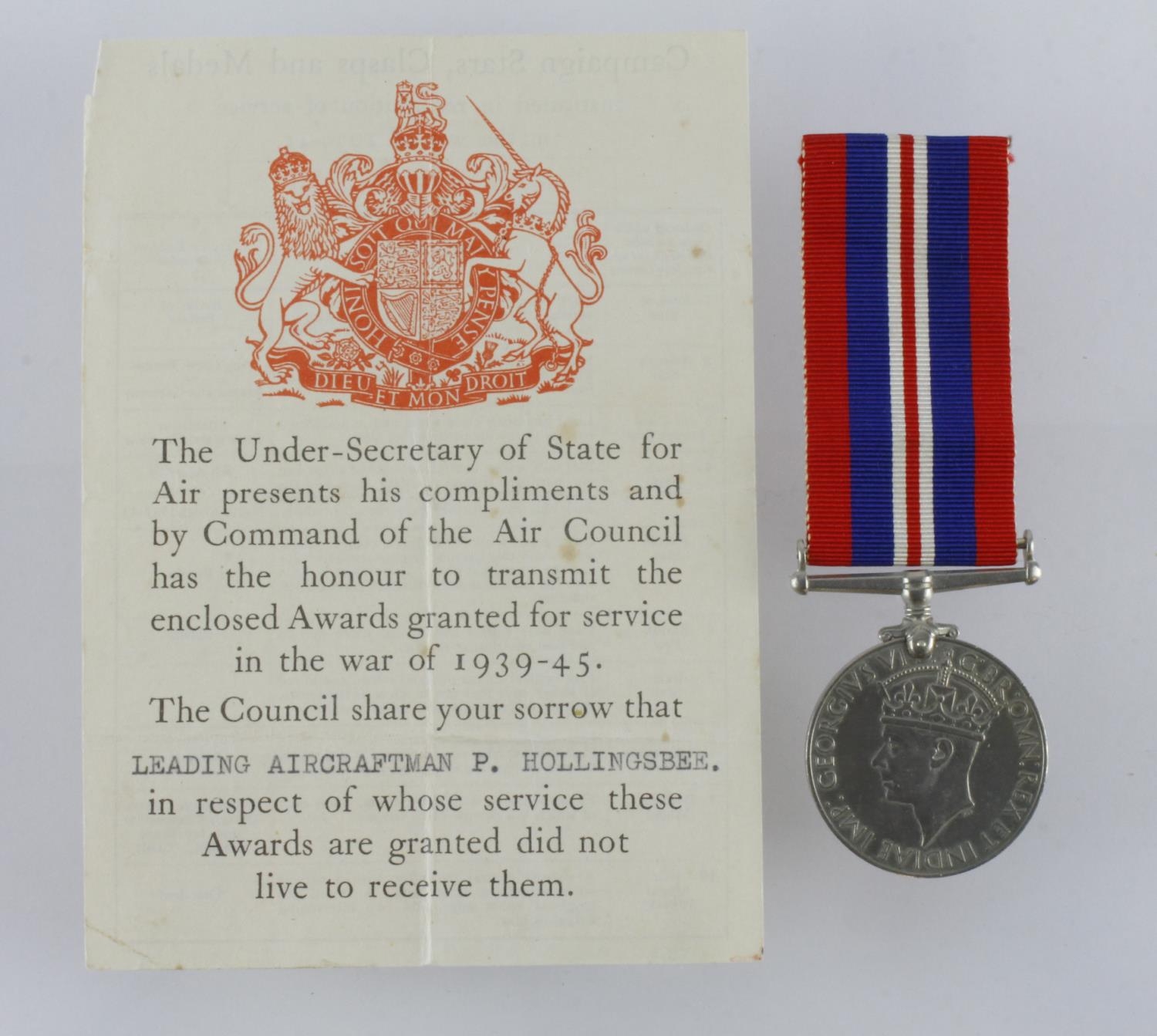 RAF WW2 casualty slip and medals to 1805644 LAC Peter Hollinggsbee RAF died 24-12-1944 (Christmas eve). Buried Winnipeg Brookside, Cemetery Canada. Born Canterbury.