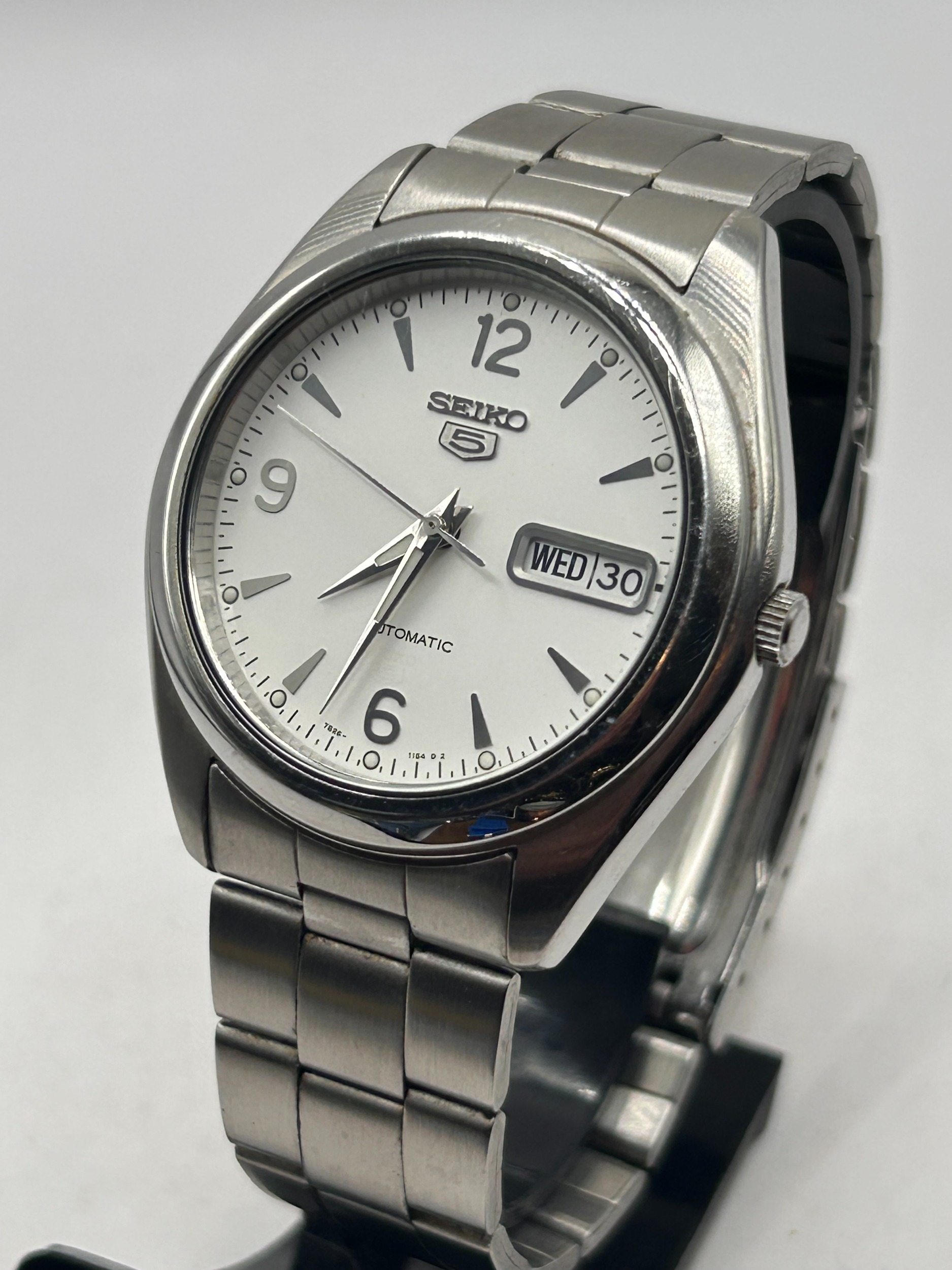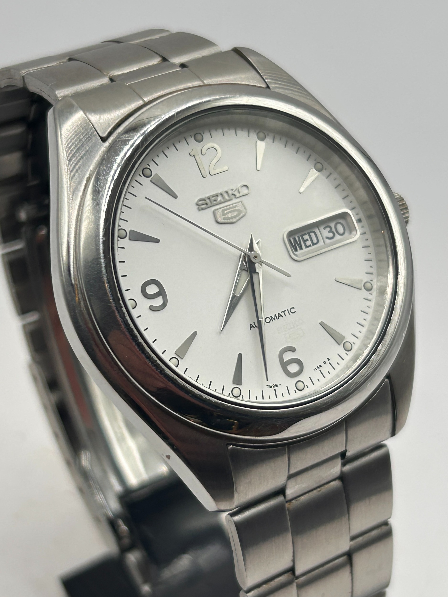 An automatic analog wrist watch identified by market consensus as a Seiko 5 model, utilizing the 7S26 caliber movement. The watch features a round stainless steel case and an integrated three-link stainless steel bracelet secured by a fold-over deployant clasp signed SEIKO. The dial is white/silver with applied baton indices and Arabic numerals at the 12, 9, and 6 positions. A day/date complication window is located at the 3 o'clock position, currently displaying WED 30. Dial markings include SEIKO, the 5 logo, AUTOMATIC, and the small text 7S26- 11S4 R 2. The caseback is marked SEIKO, STAINLESS STEEL, and WATER RESISTANT, along with various manufacturing codes.