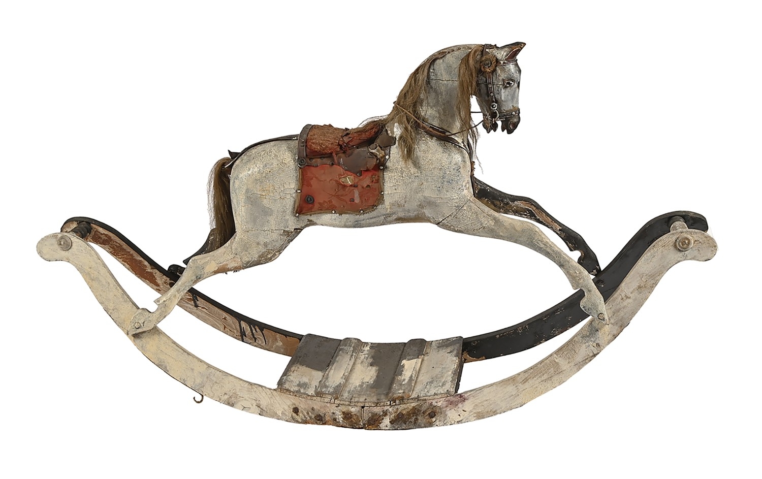 An English carved wooden rocking horse, F H Ayres, early 20th c, with head down in a 'racing' position, on bow rockers, 102cm h, 190cm l