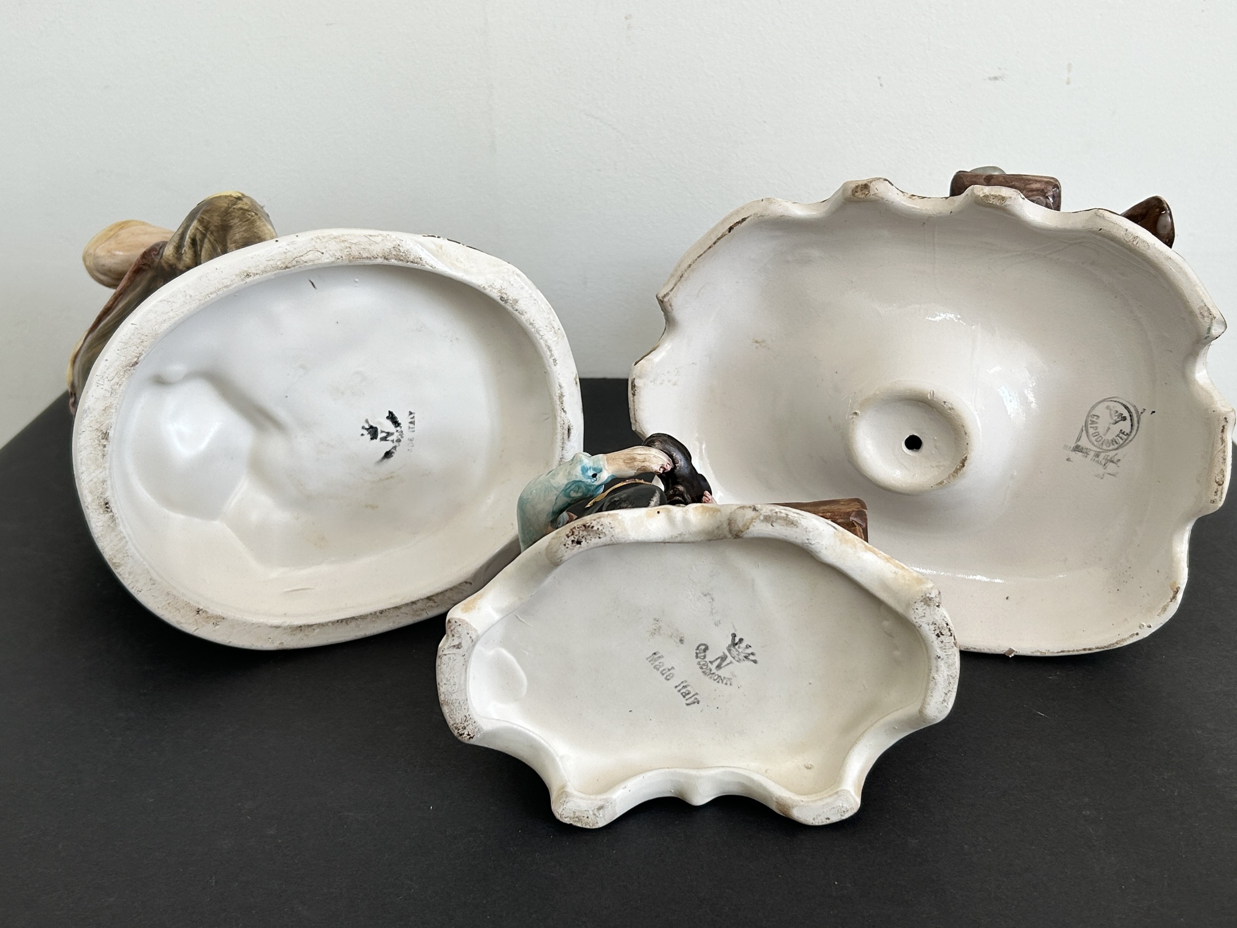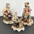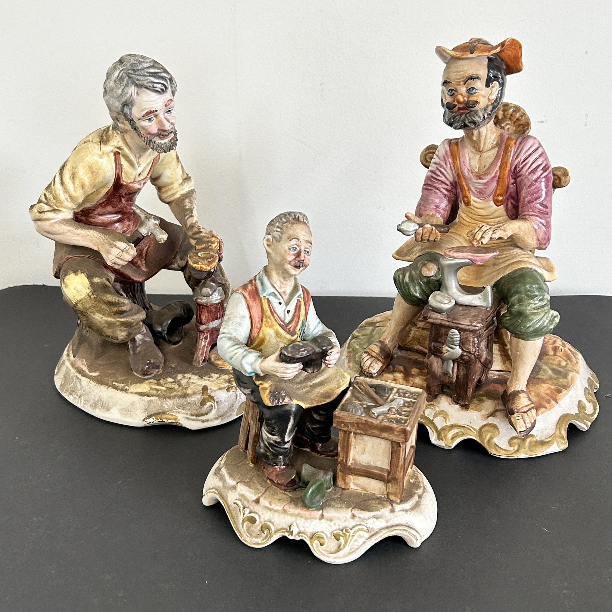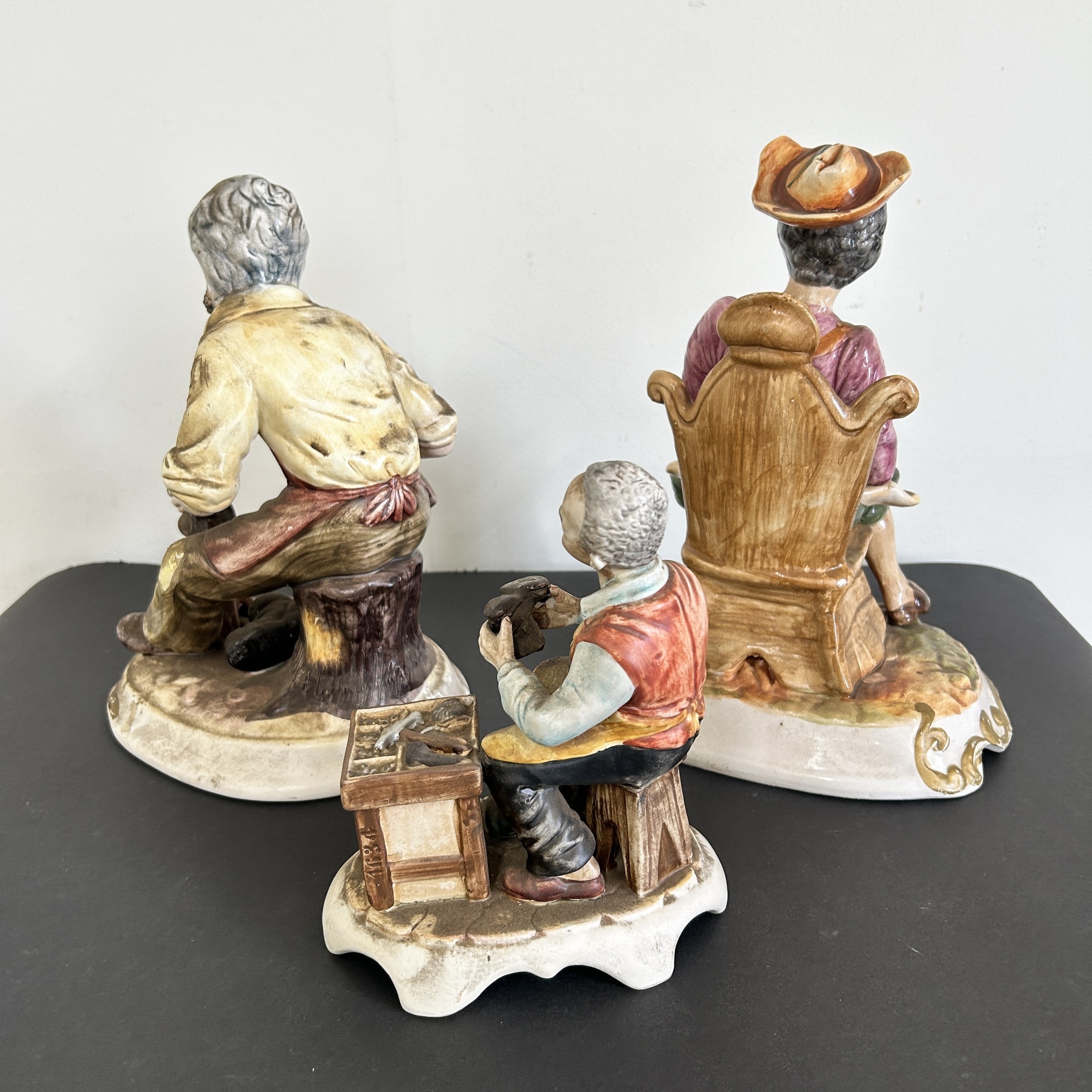 Two large Naples Capodimonte style ceramic cobbler figurines, approx. 12" tall plus one other