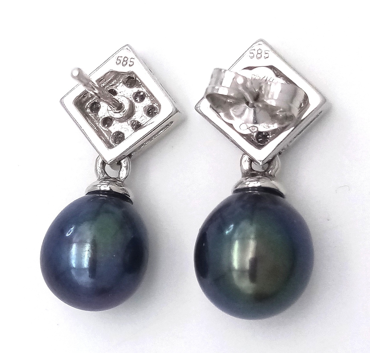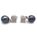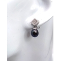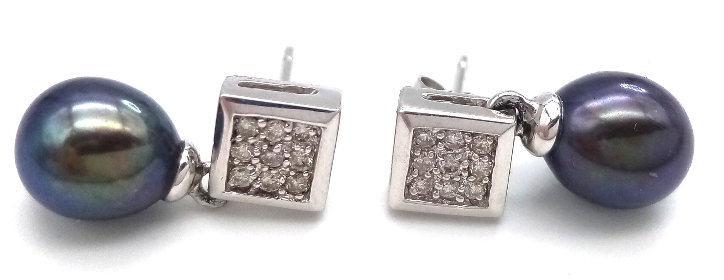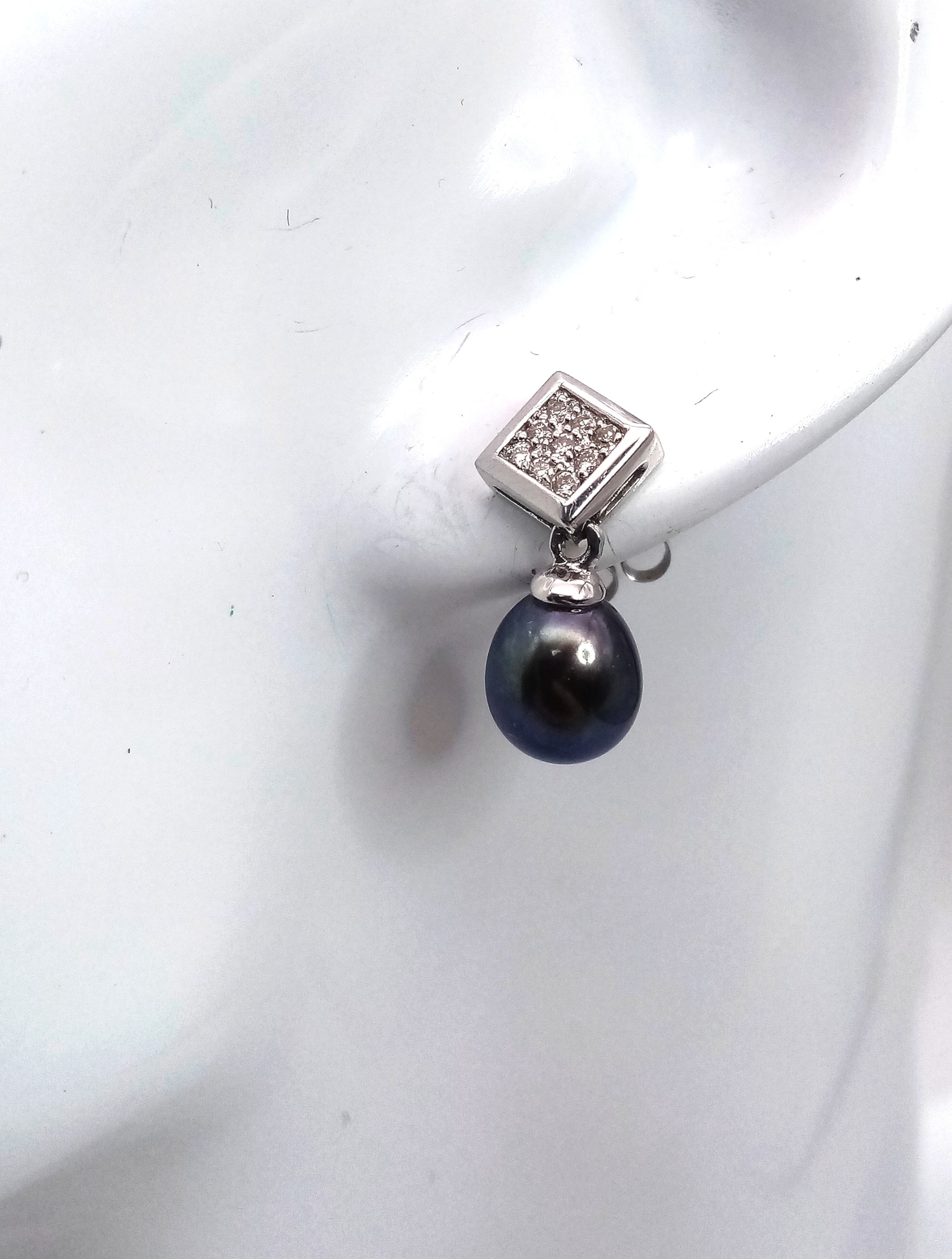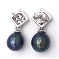 A PAIR OF 14K WHITE GOLD, DIAMOND AND PEARL, DROP EARRINGS. 3.7G. NEEDS ONE BUTTERFLY BACK. MS RED 1008