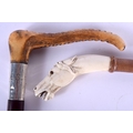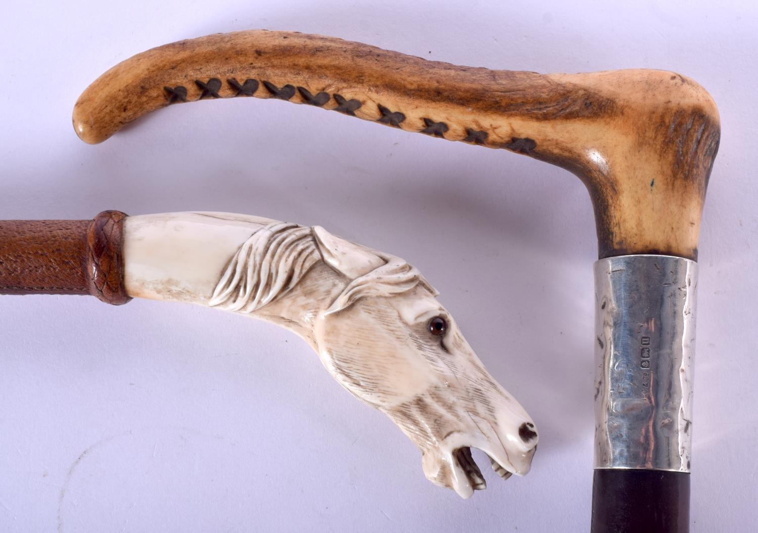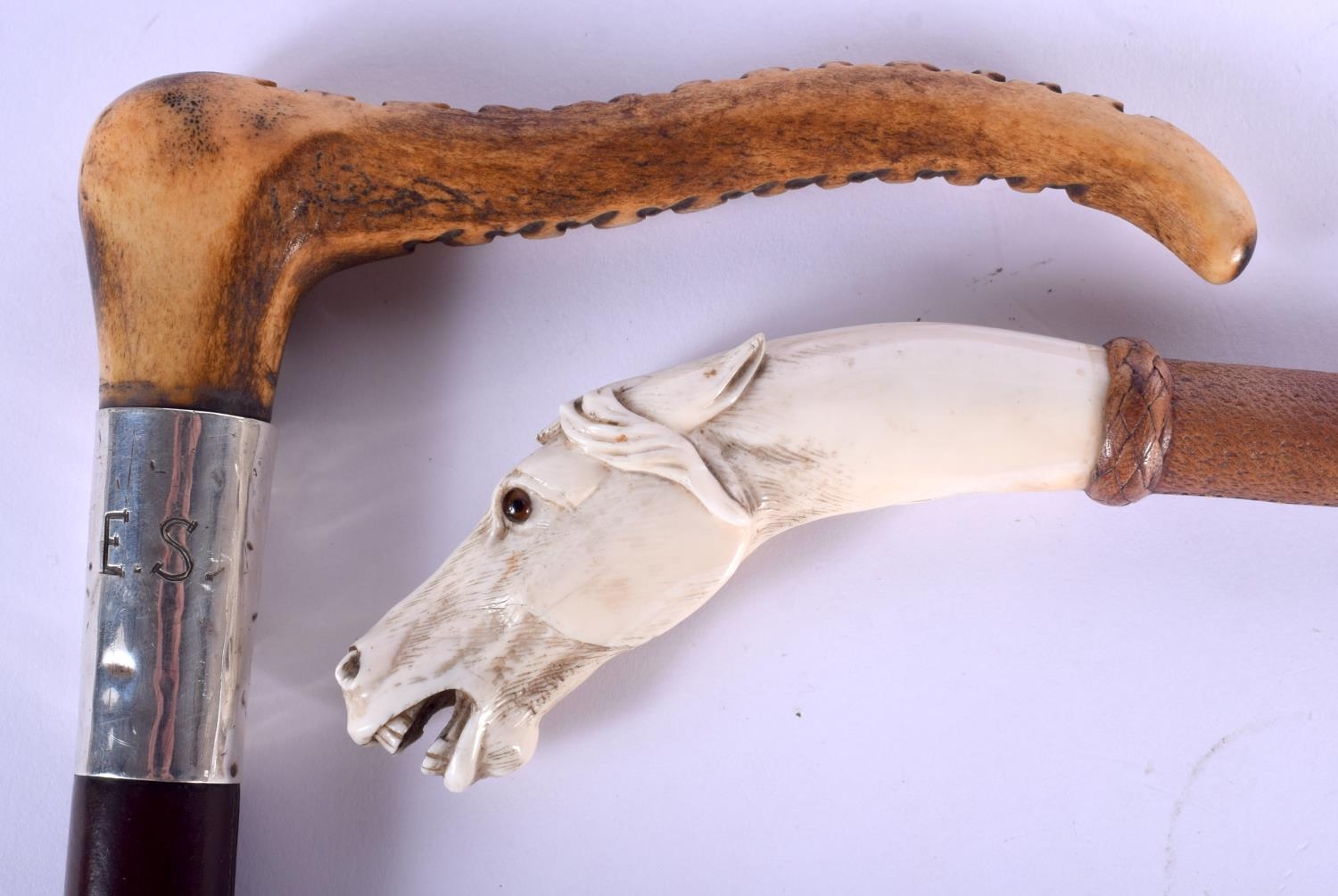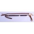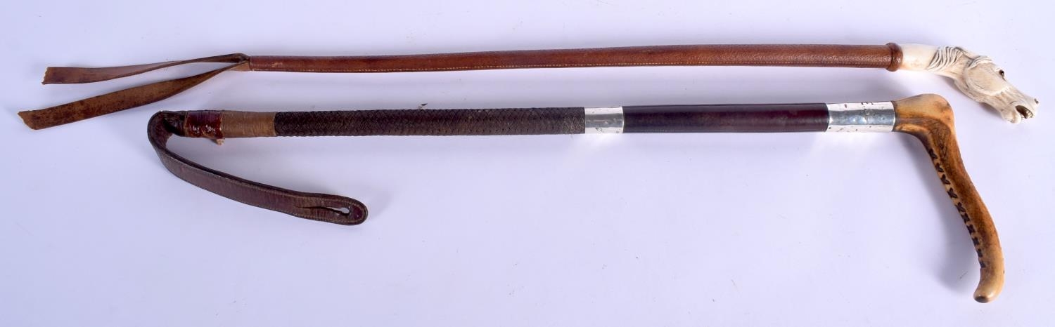 A 19TH CENTURY EUROPEAN IVORY HANDLED HORSE HEAD RIDING CROP together with a 1940s silver mounted crop. 65 cm long. (2)