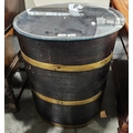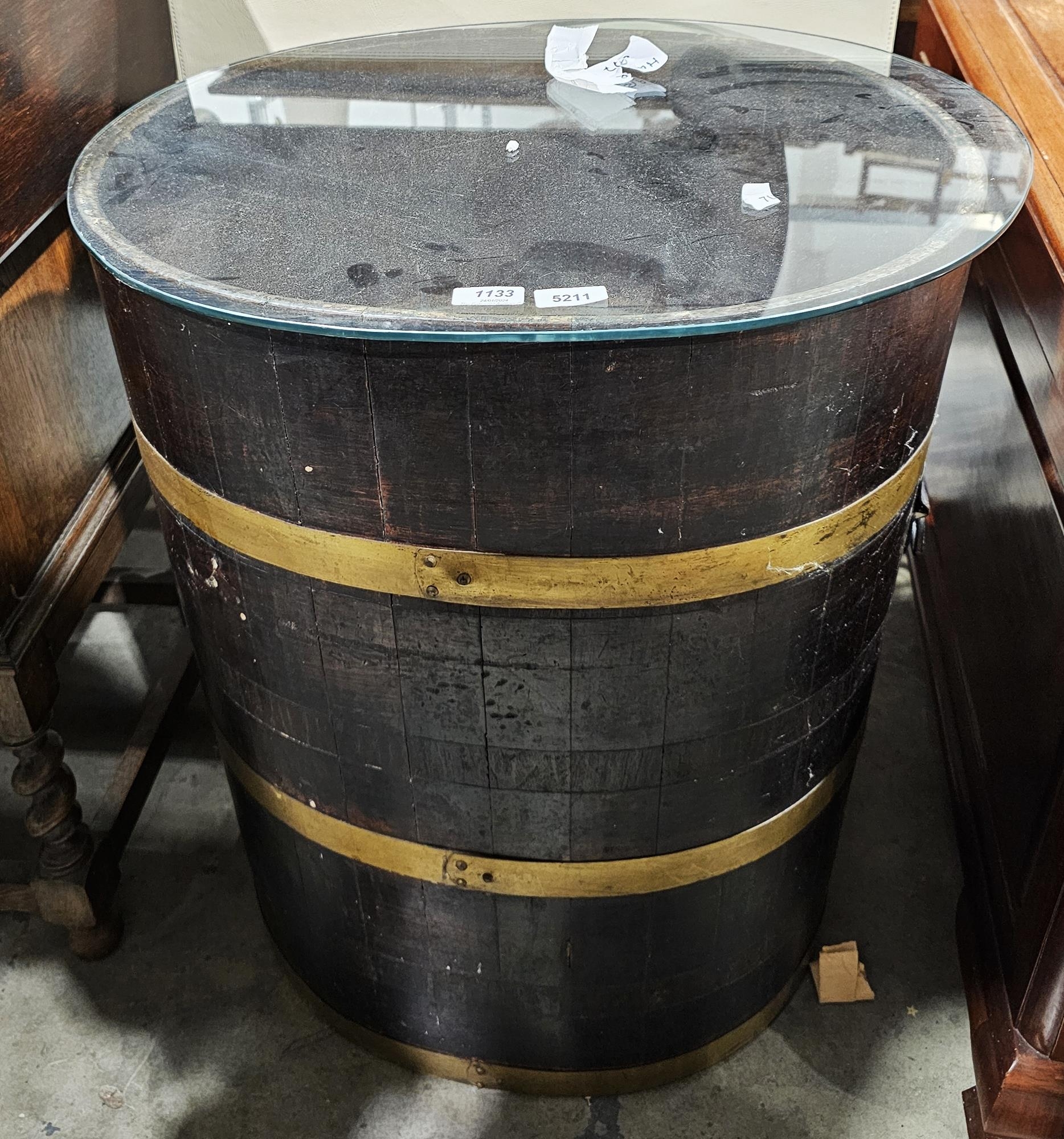 Antique coopered barrel adapted into a glass-topped occasional table of oval form, 70cm high x 56cm wide x 45cm deep