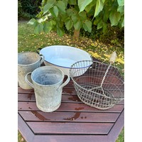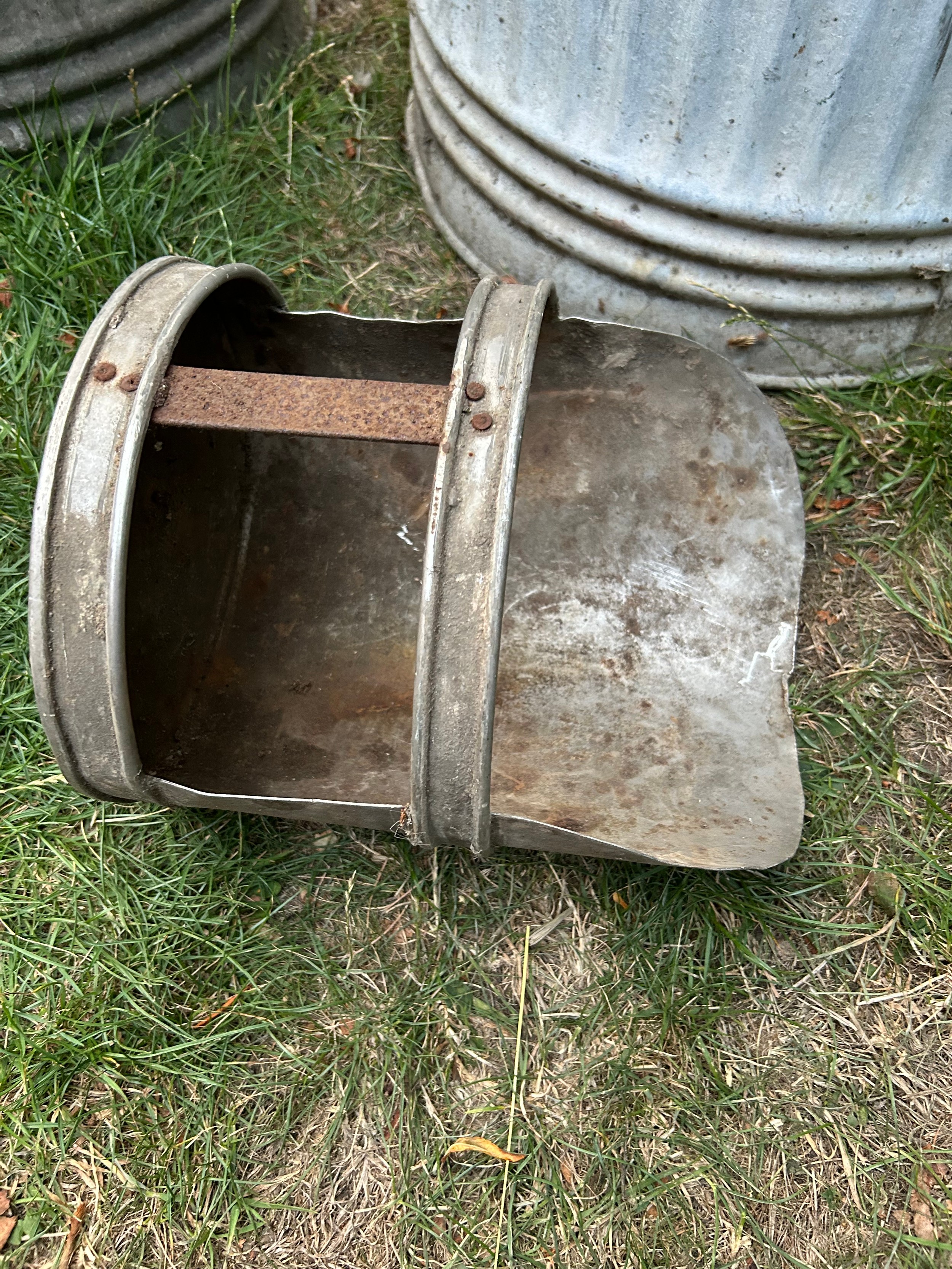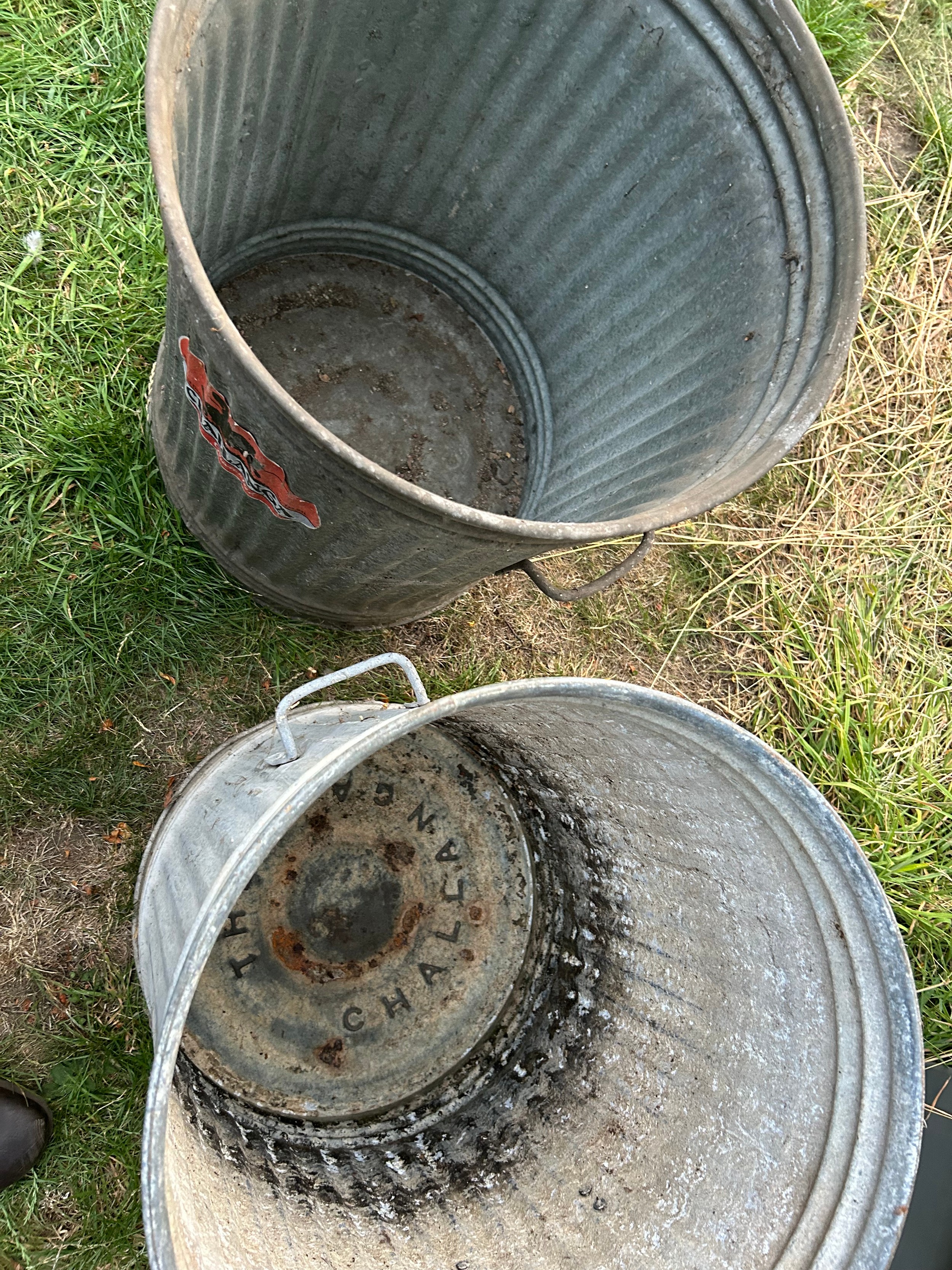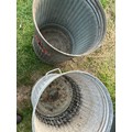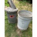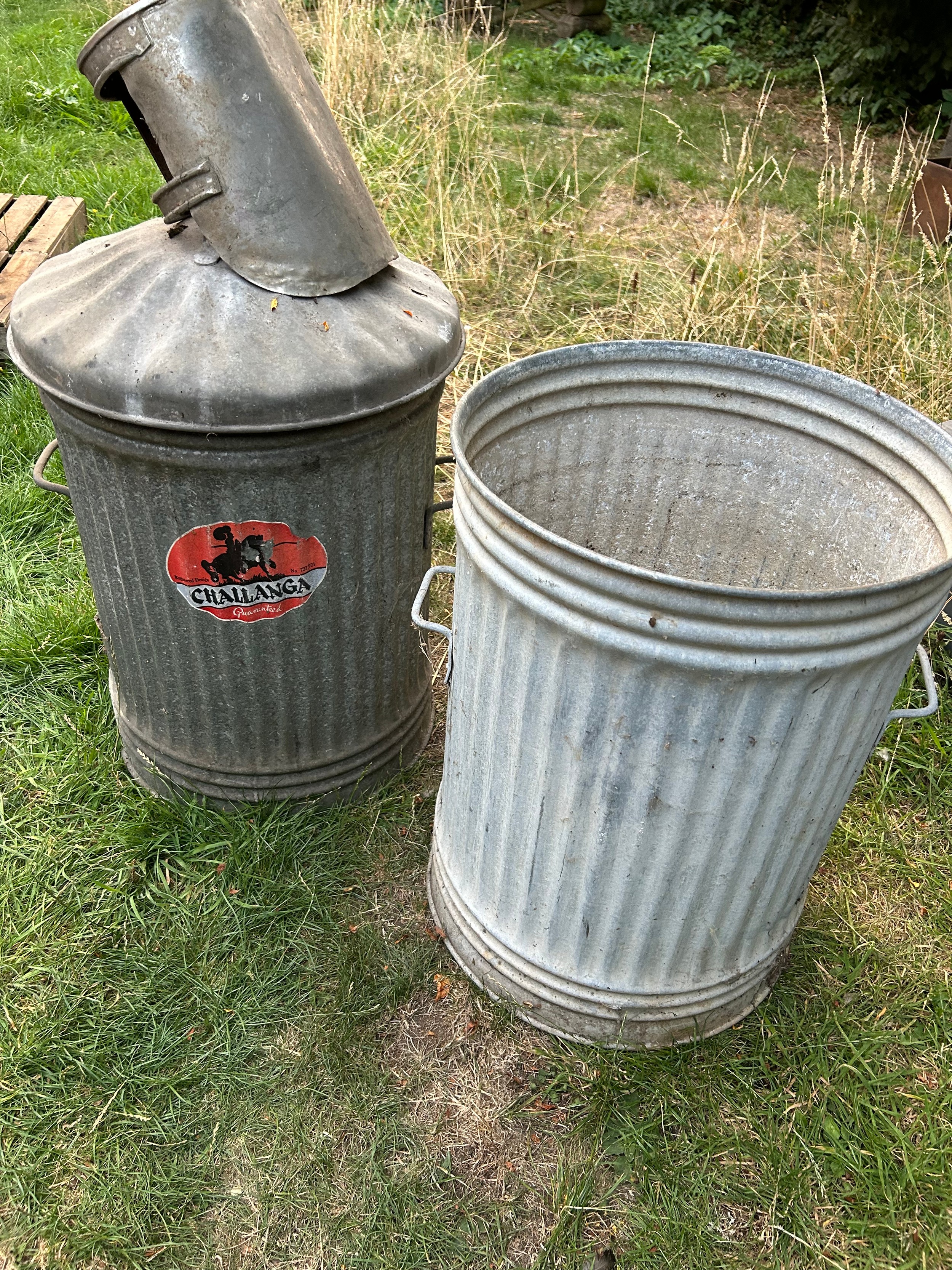 2 vintage galvanised dustbins by Challenga, one with lid and also a galvanised scoop