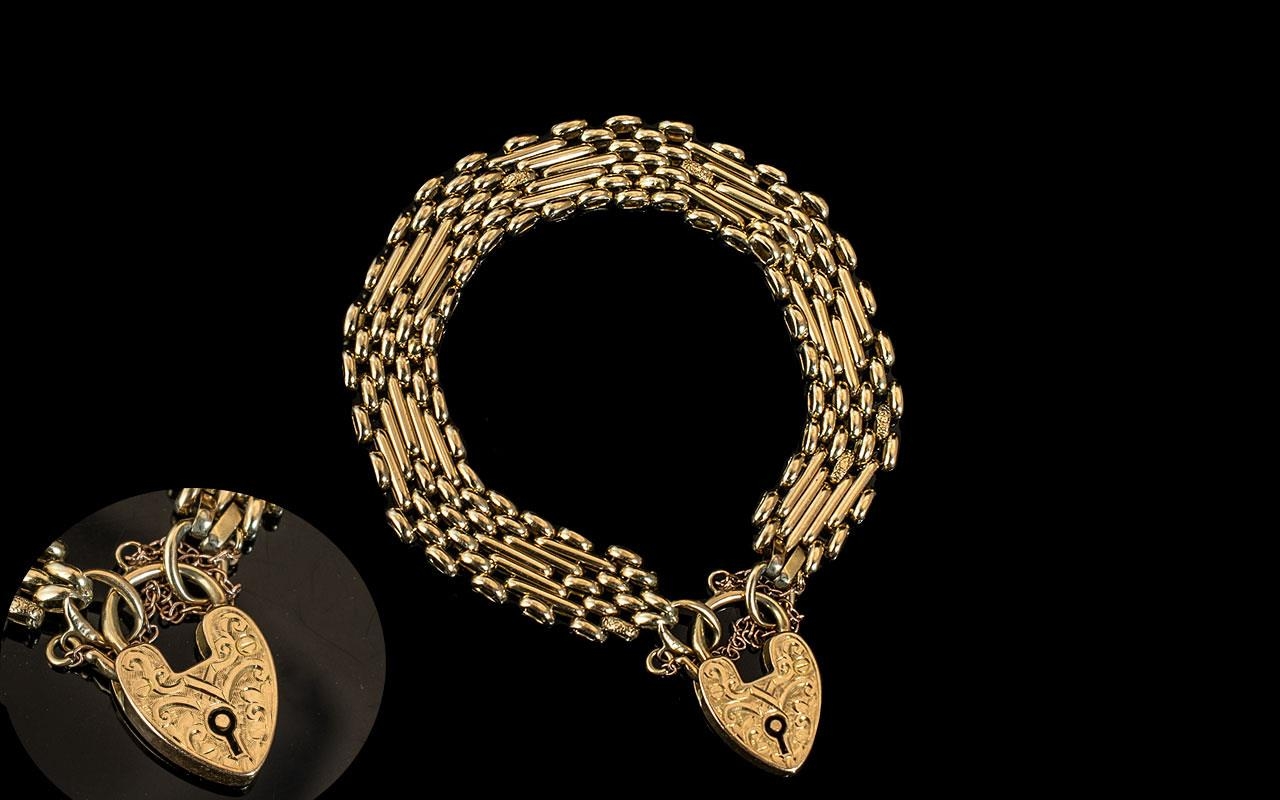 Antique Period Good Quality 15ct Gold Gate Bracelet - Superb Design, Excellent Padlock. Marked 15ct. Length 7'' (17.5cm) Weight 21.5 grams. Excellent Condition.