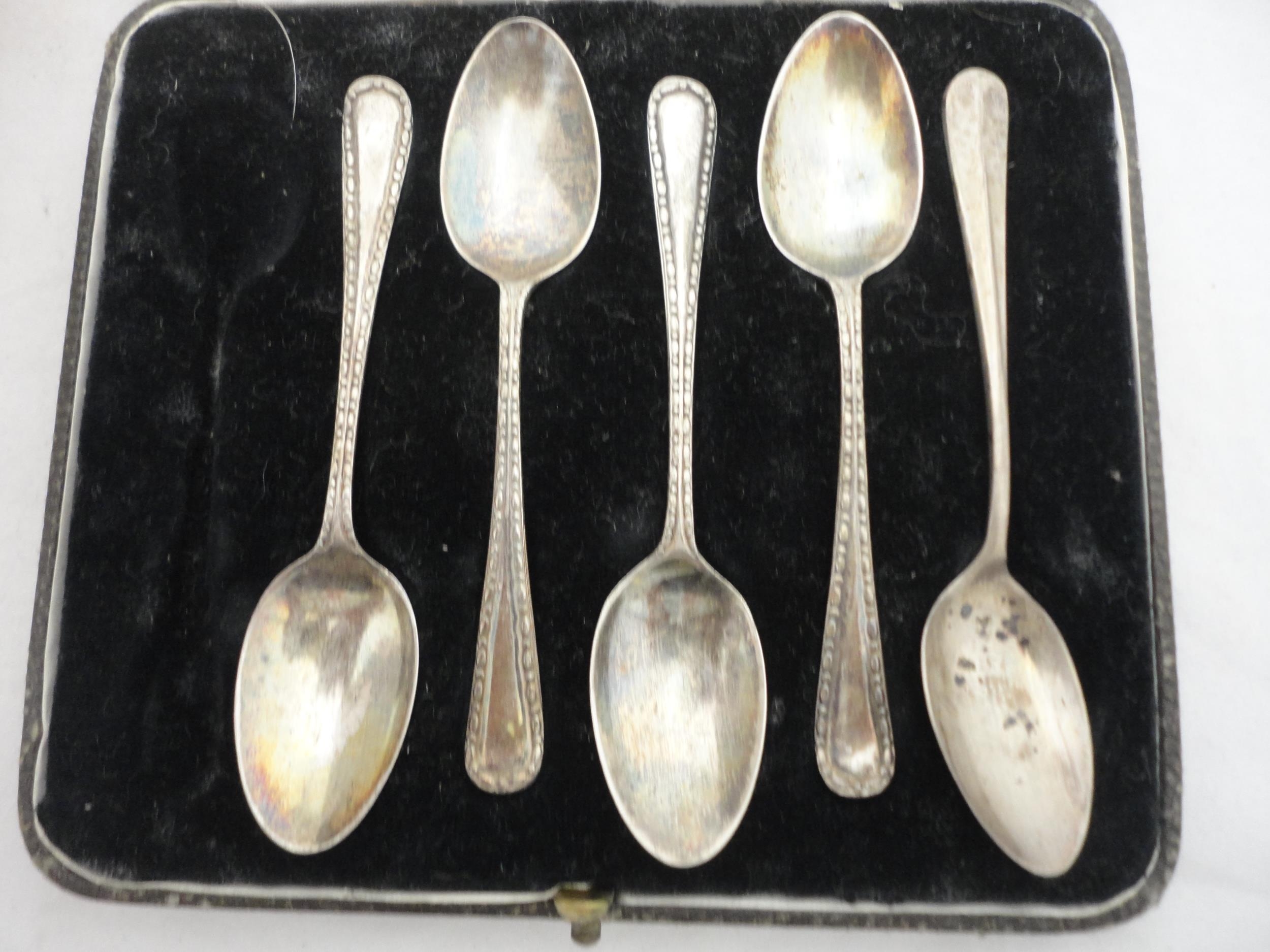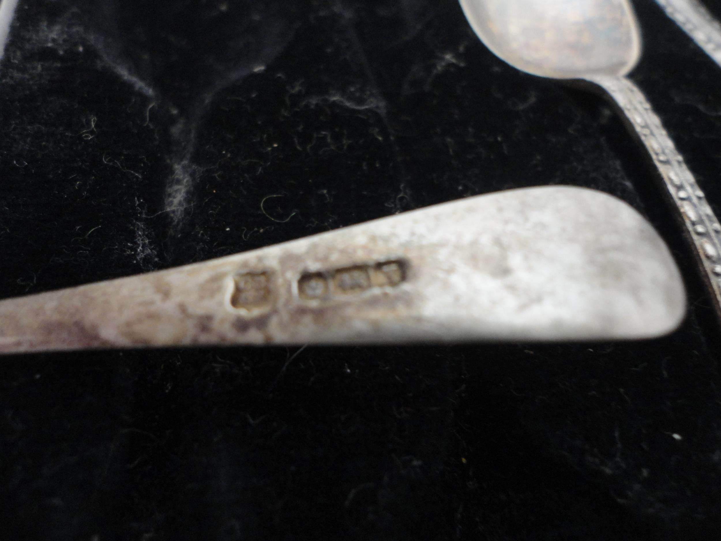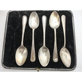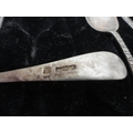 Five matching silver sugar spoons, cased.