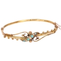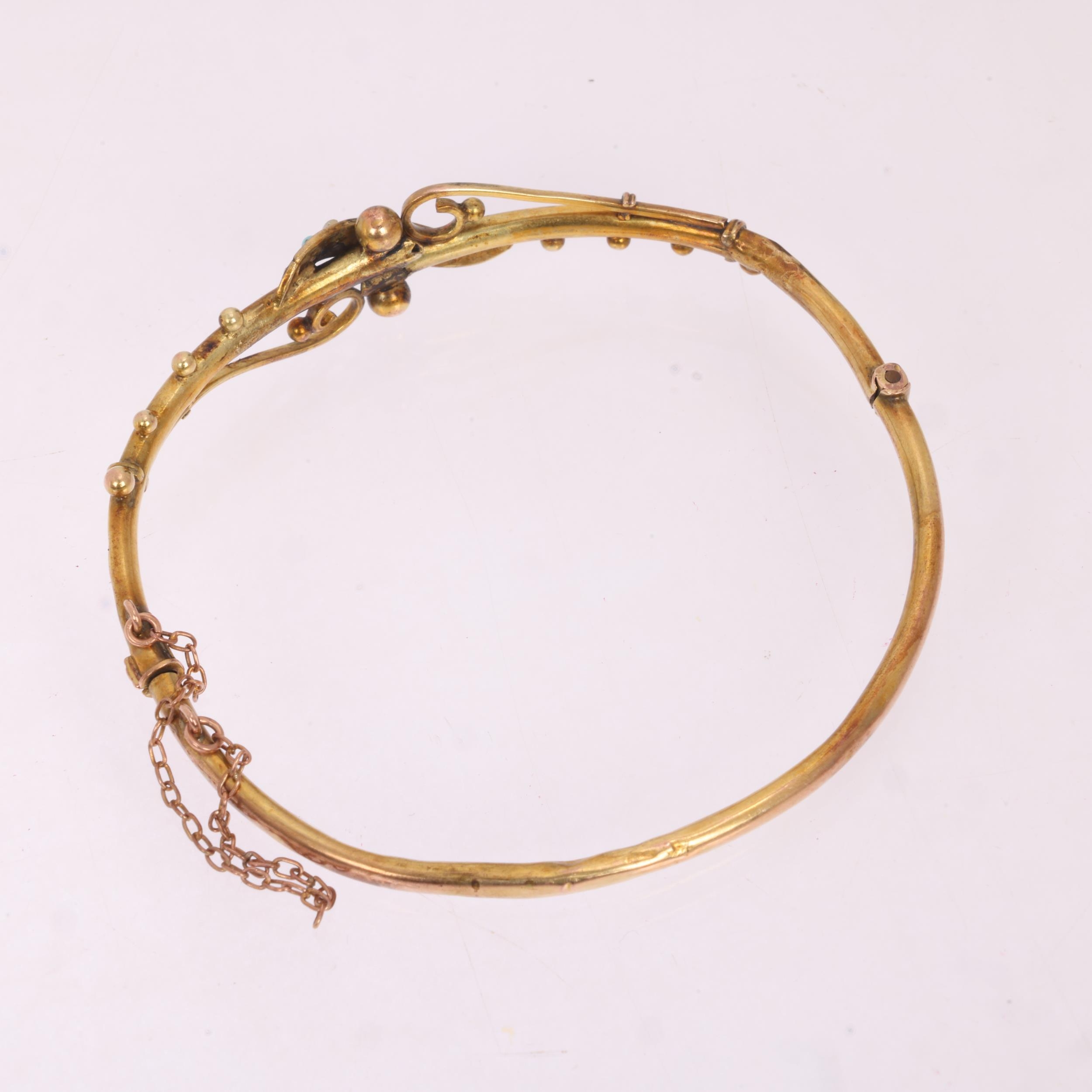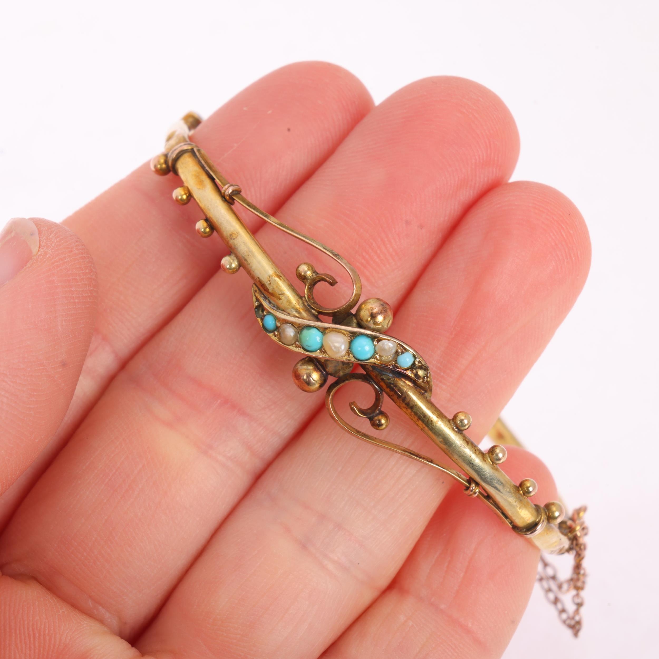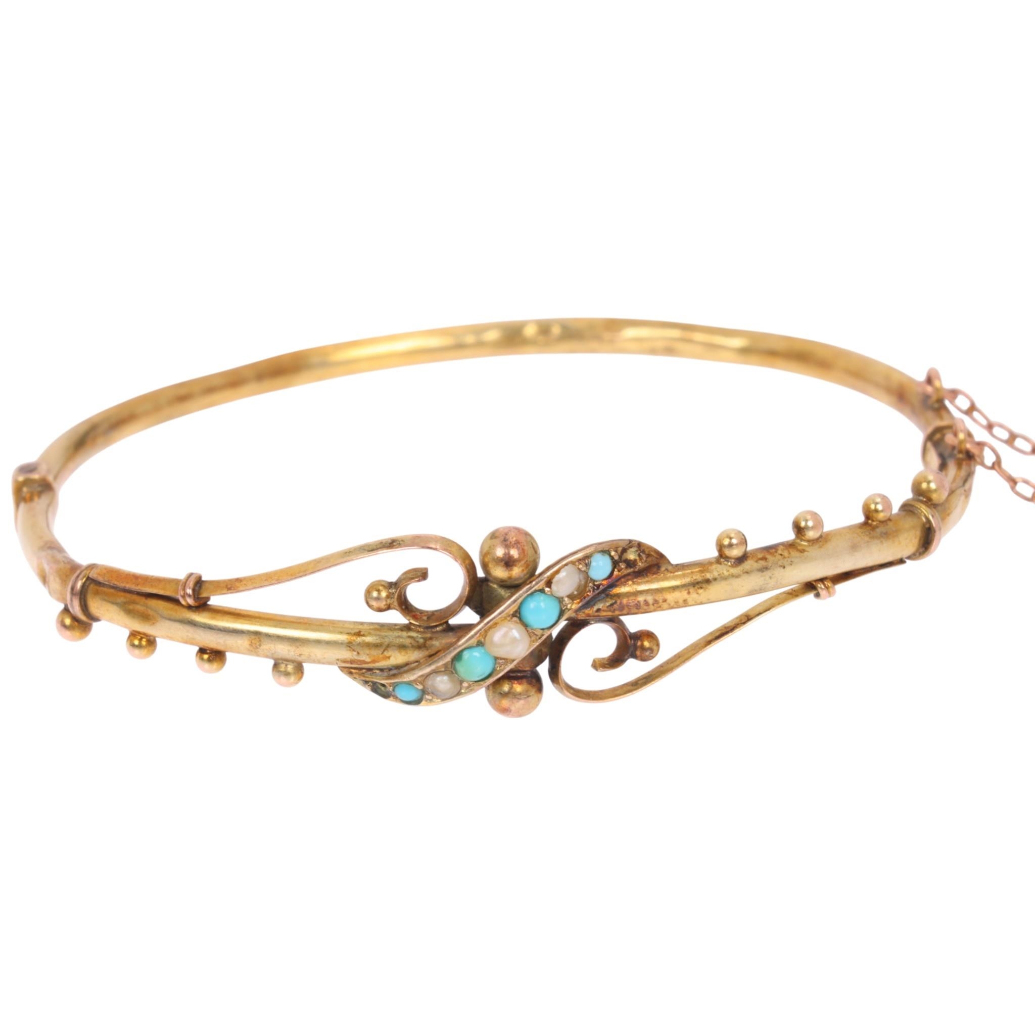 An Antique Victorian 9ct gold turquoise and pearl hinged bangle, plain scrollwork form, with beaded decoration, setting height 11.6mm, internal circumference 17cm, 4.2g