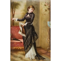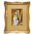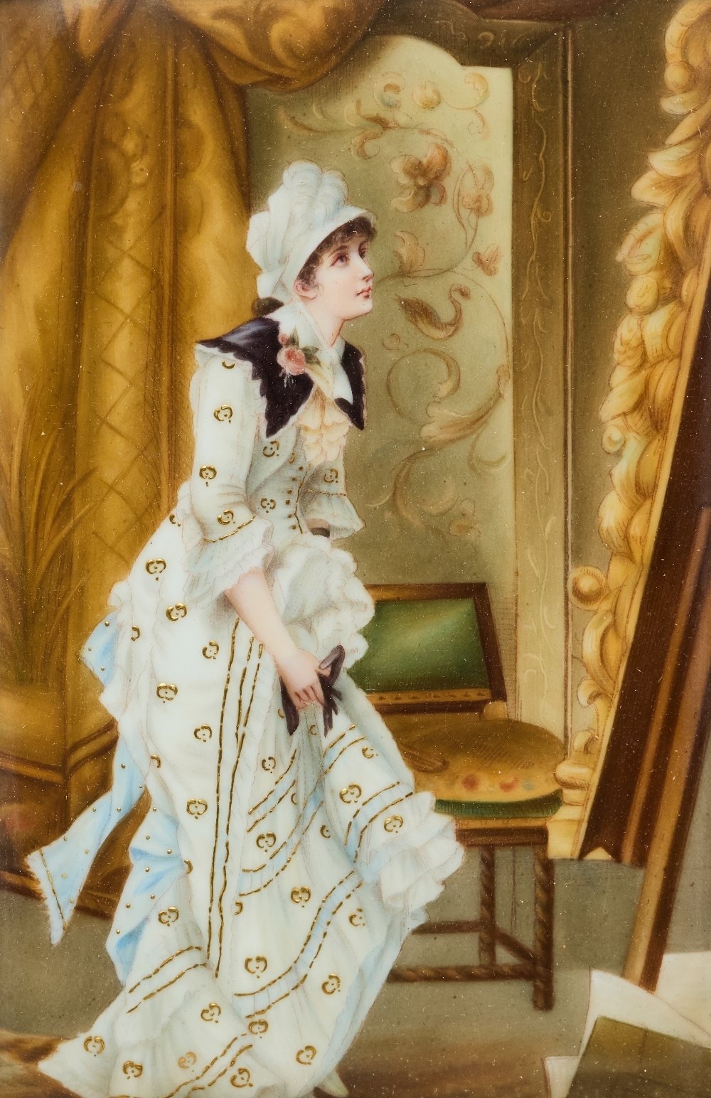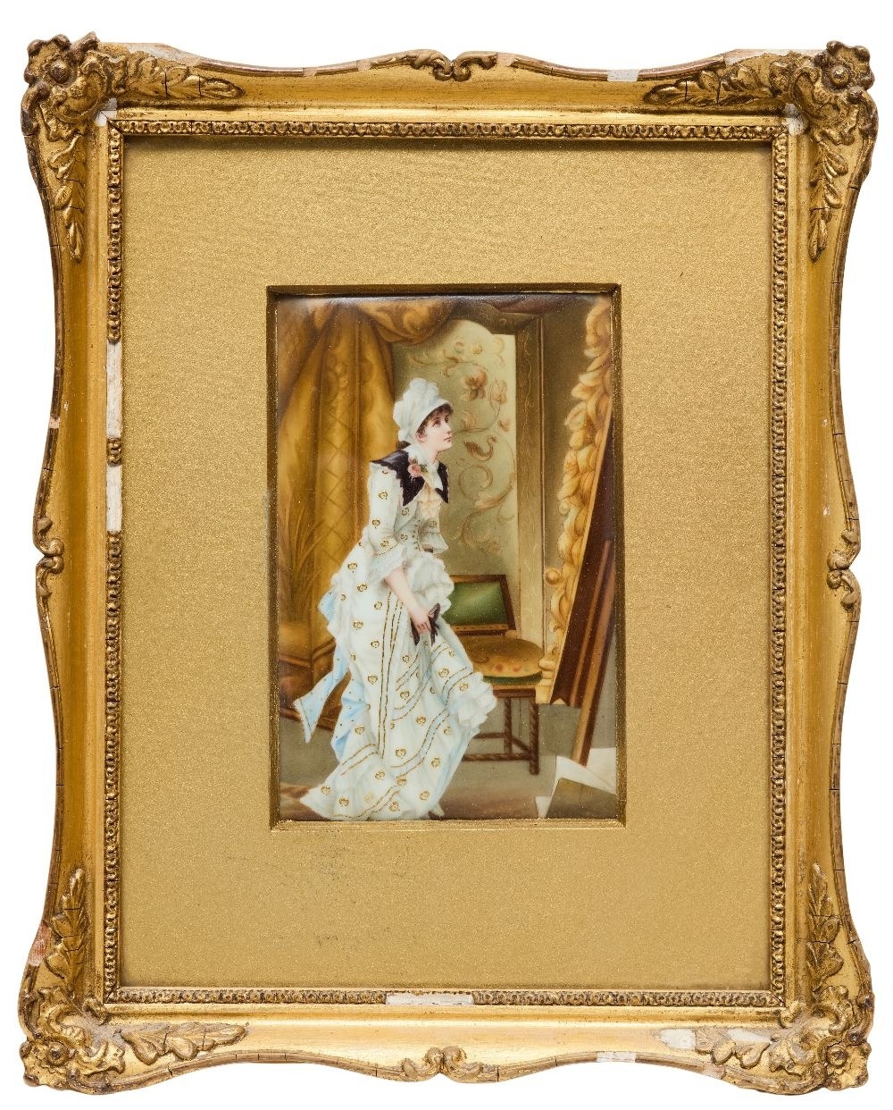 An English porcelain rectangular plaque of a lady admiring a painting, 19th century, held in a gilt mount and giltwood and gesso frame, the plaque 13.6 x 8.8cmÿ