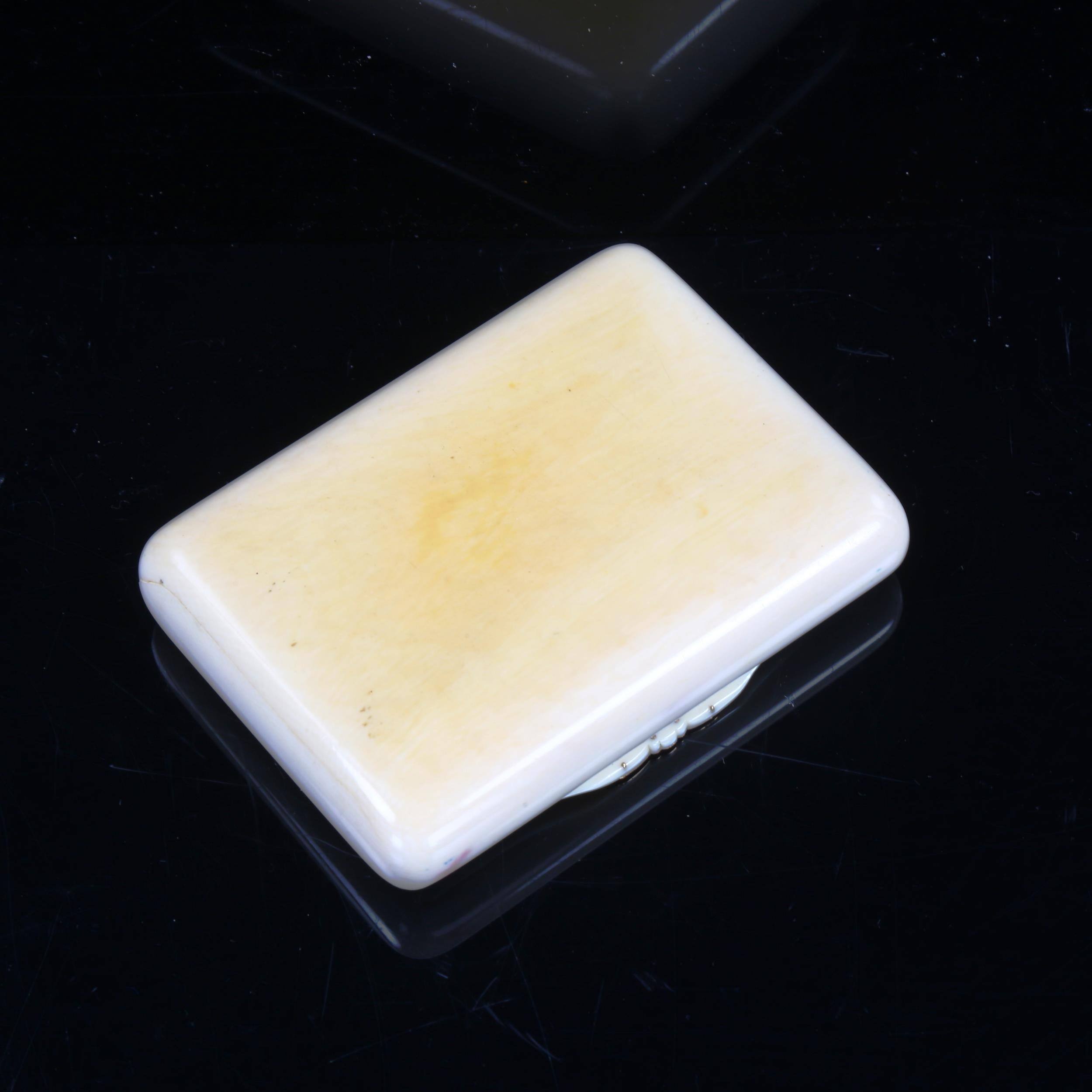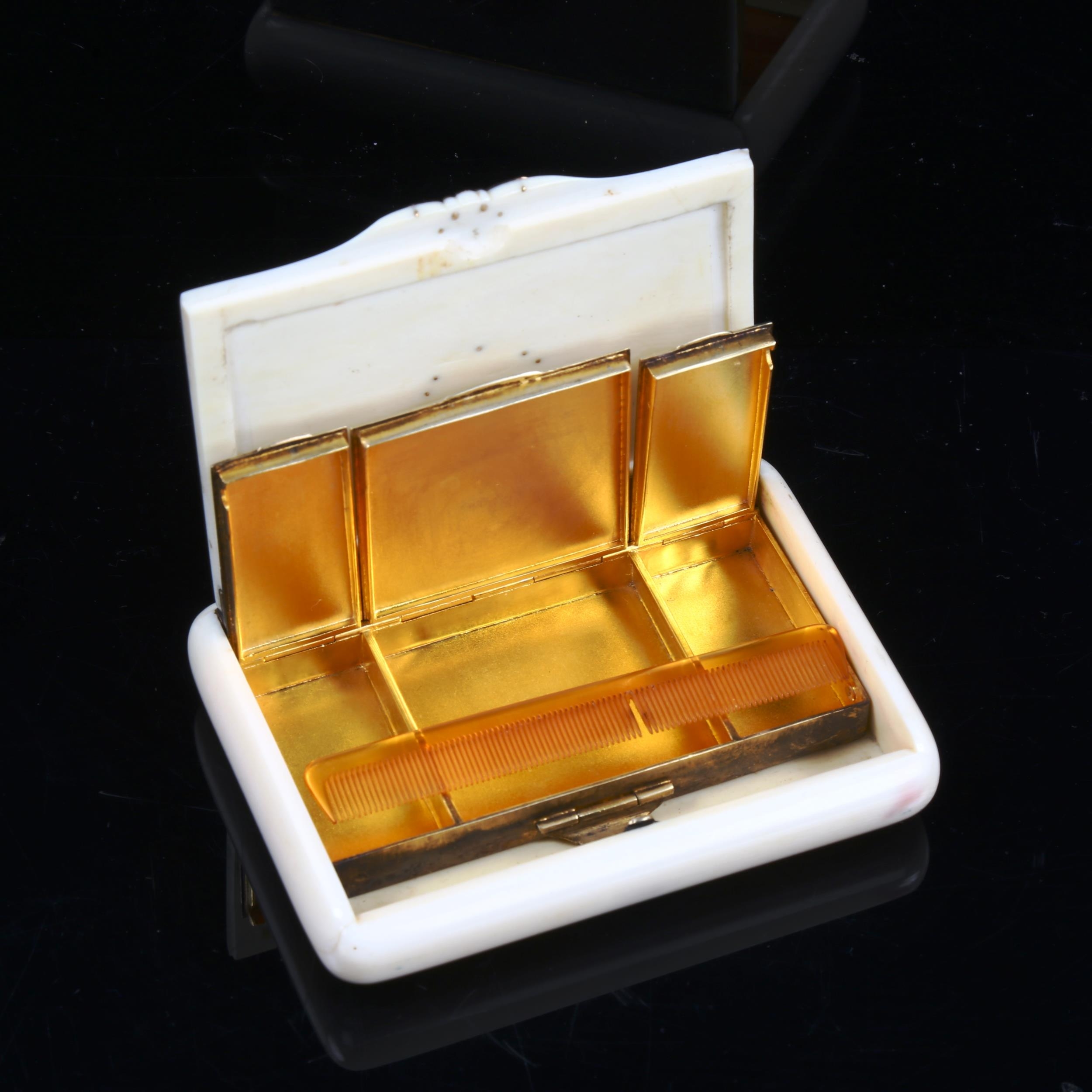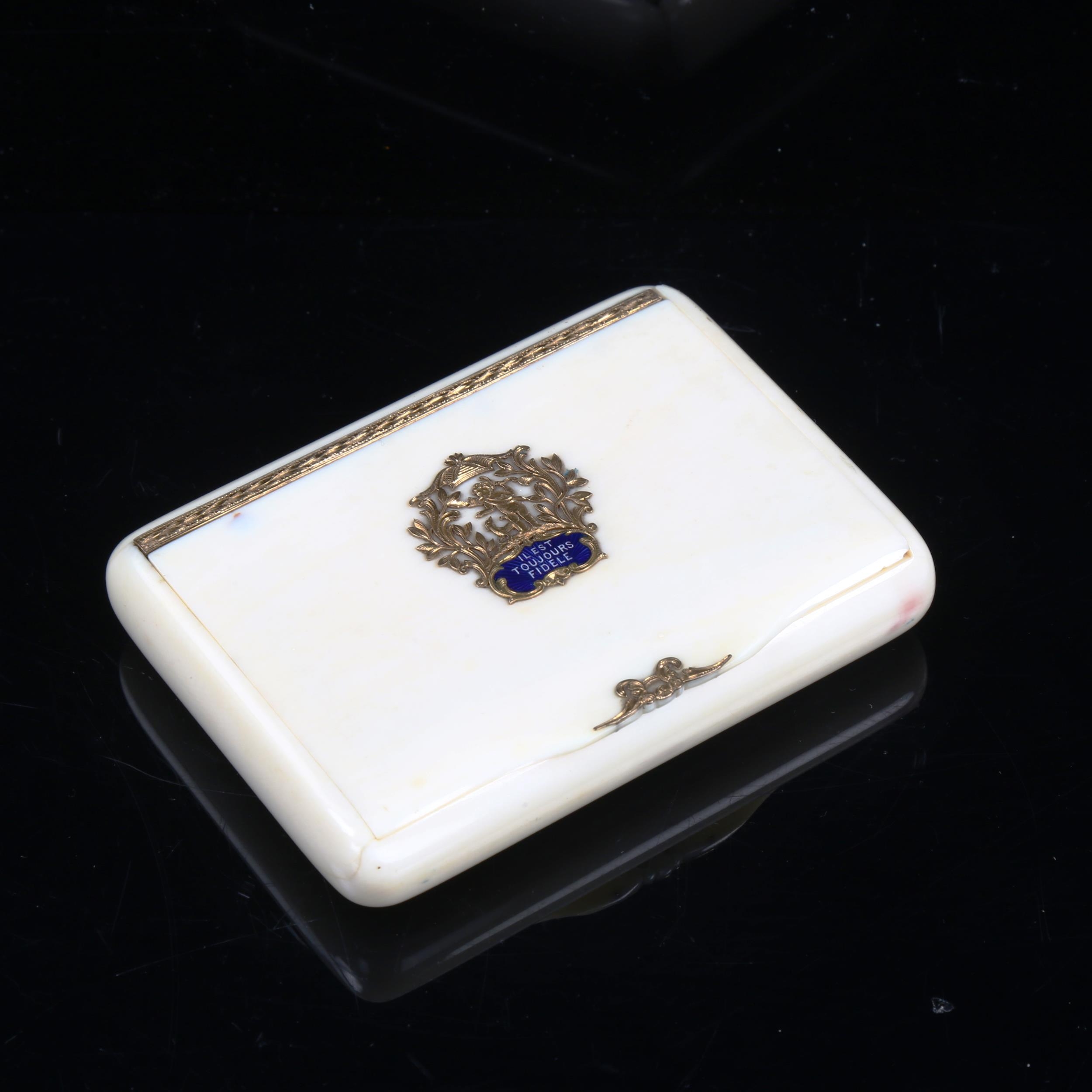 A 19th century French ivory gold and silver-gilt pocket vanity case, the hinged lid having an inset enamelled gold filigree plaque with motto "Il Est Toujours Fidele" (He is always faithful), the interior fitted with silver-gilt lidded compartments and miniature comb, width 9cm