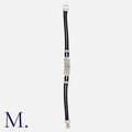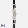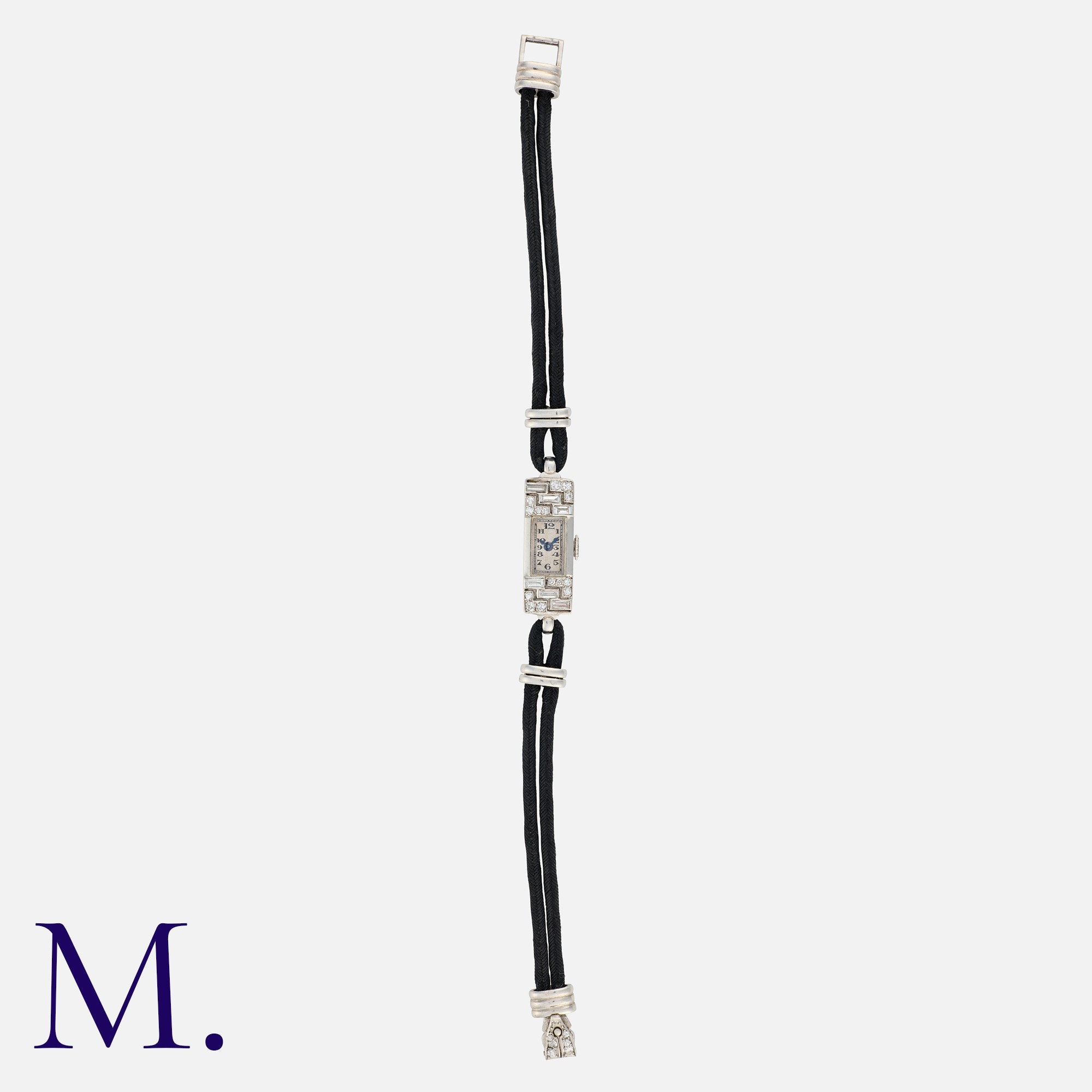 An Art Deco Diamond Cocktail Watch in platinum and 18K white gold, set with round-cut and baguette-cut diamond accents to a rectangular case with manual wind and black cord strap. French marks for platinum and 18ct gold.
