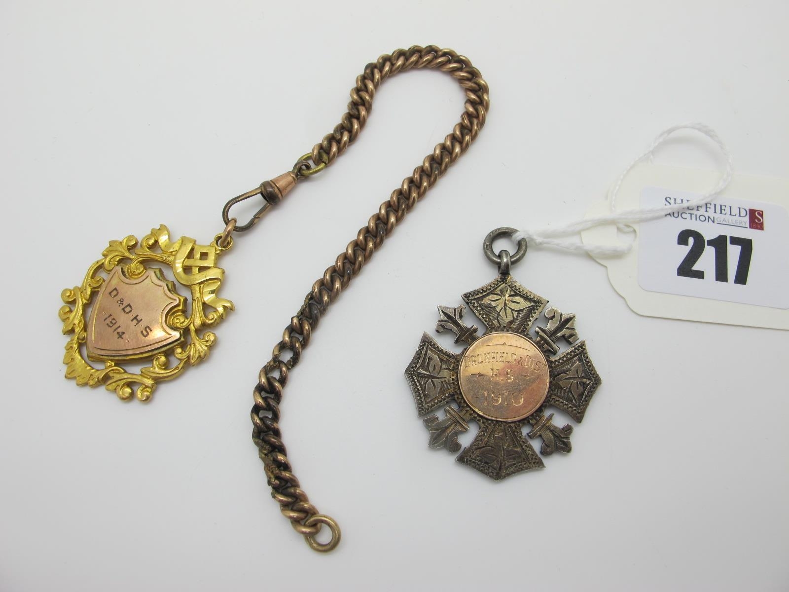 A Gold Plated Curb Link Part Chain, suspending an openwork medallion pendant, inscribed and dated "1814"; together with a hallmarked silver medallion pendant, "Dronfield & Dist H.S. 1910" "G. Wright Y. B. Average 1119 yDS".