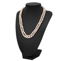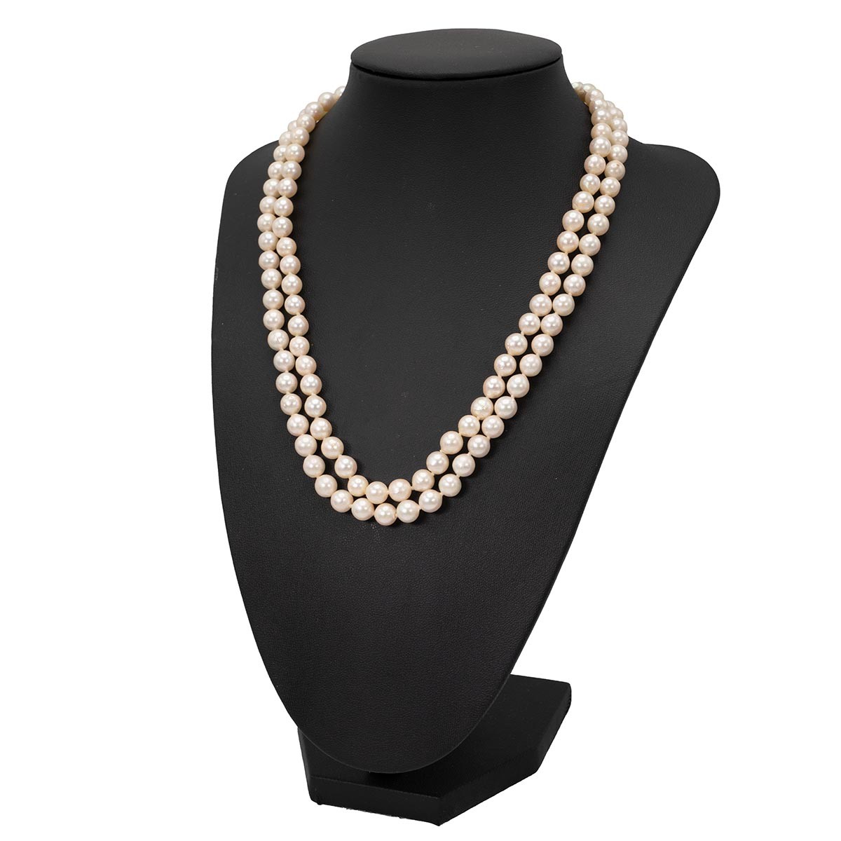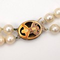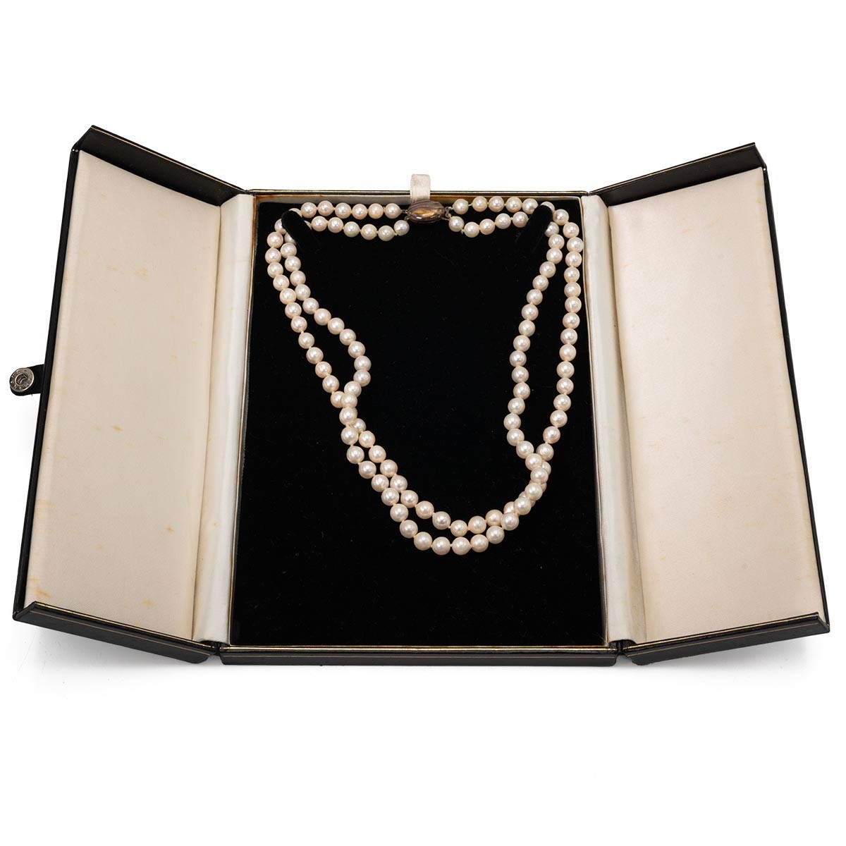 Two strand pearl knotted necklace with 9ct push-pull gold clasp, L43cm, in original fold box.
