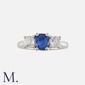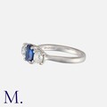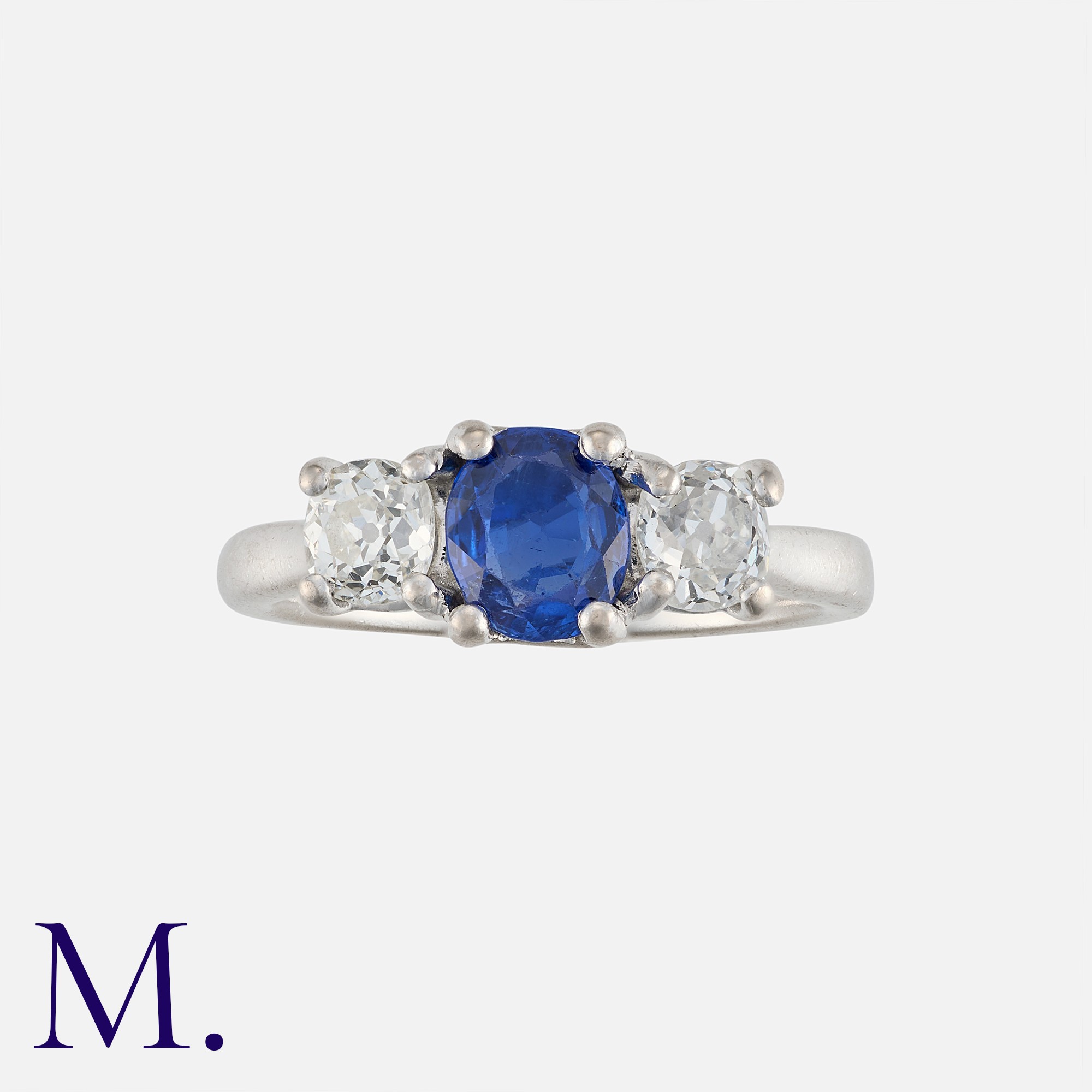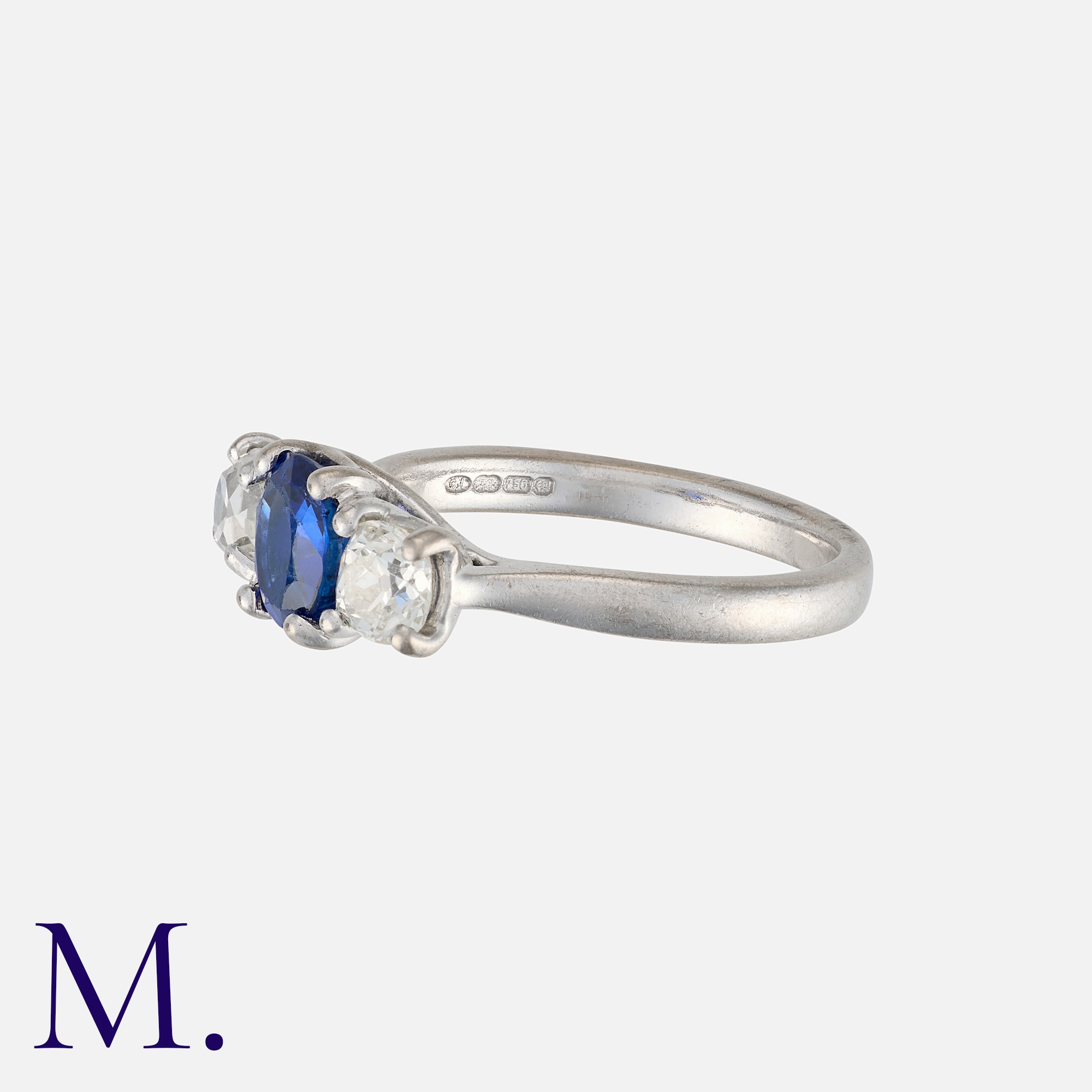 A Sapphire and Diamond 3-Stone Ring in 18K white gold with an oval cut sapphire to the centre with old cut diamonds either side weighing approximately 0.60ct in total. Hallmarked for 18ct gold.