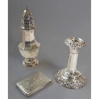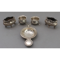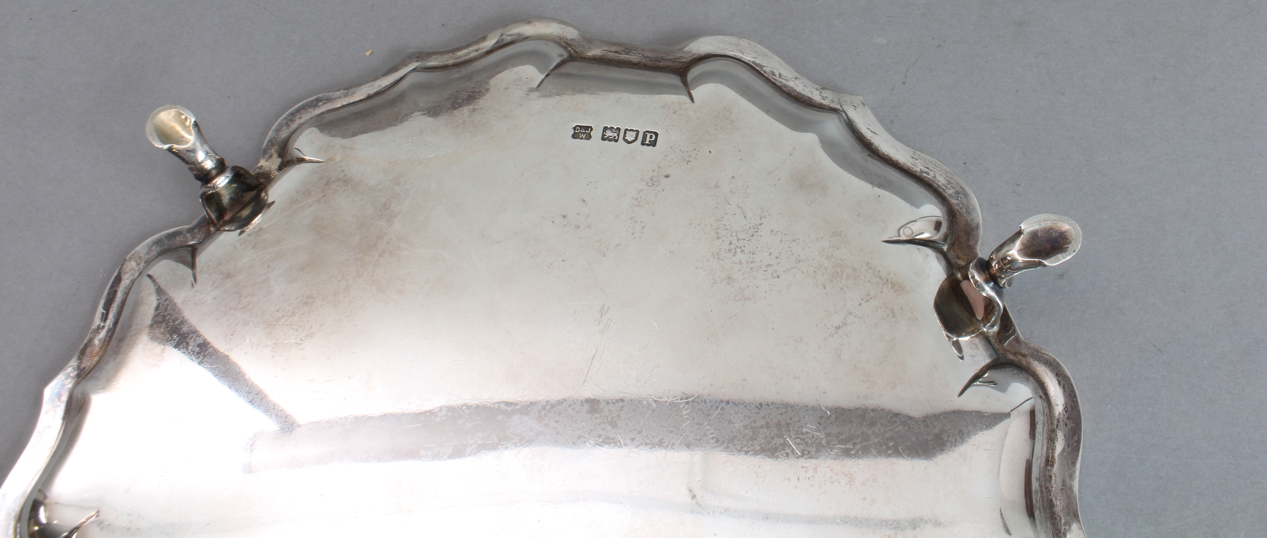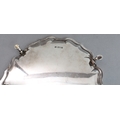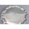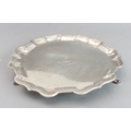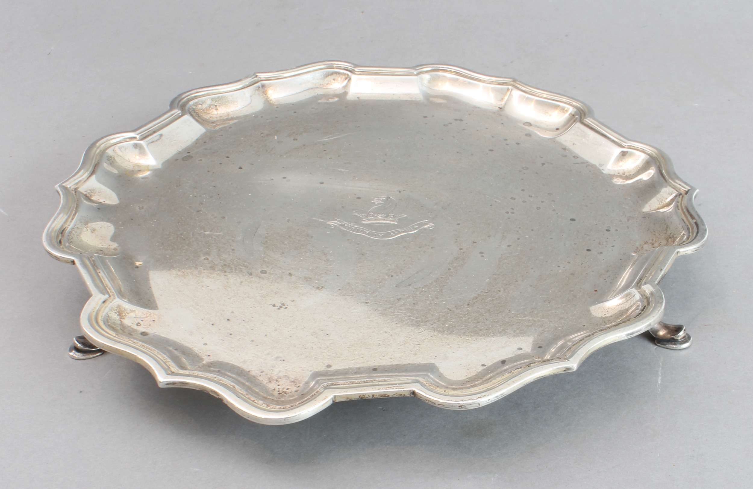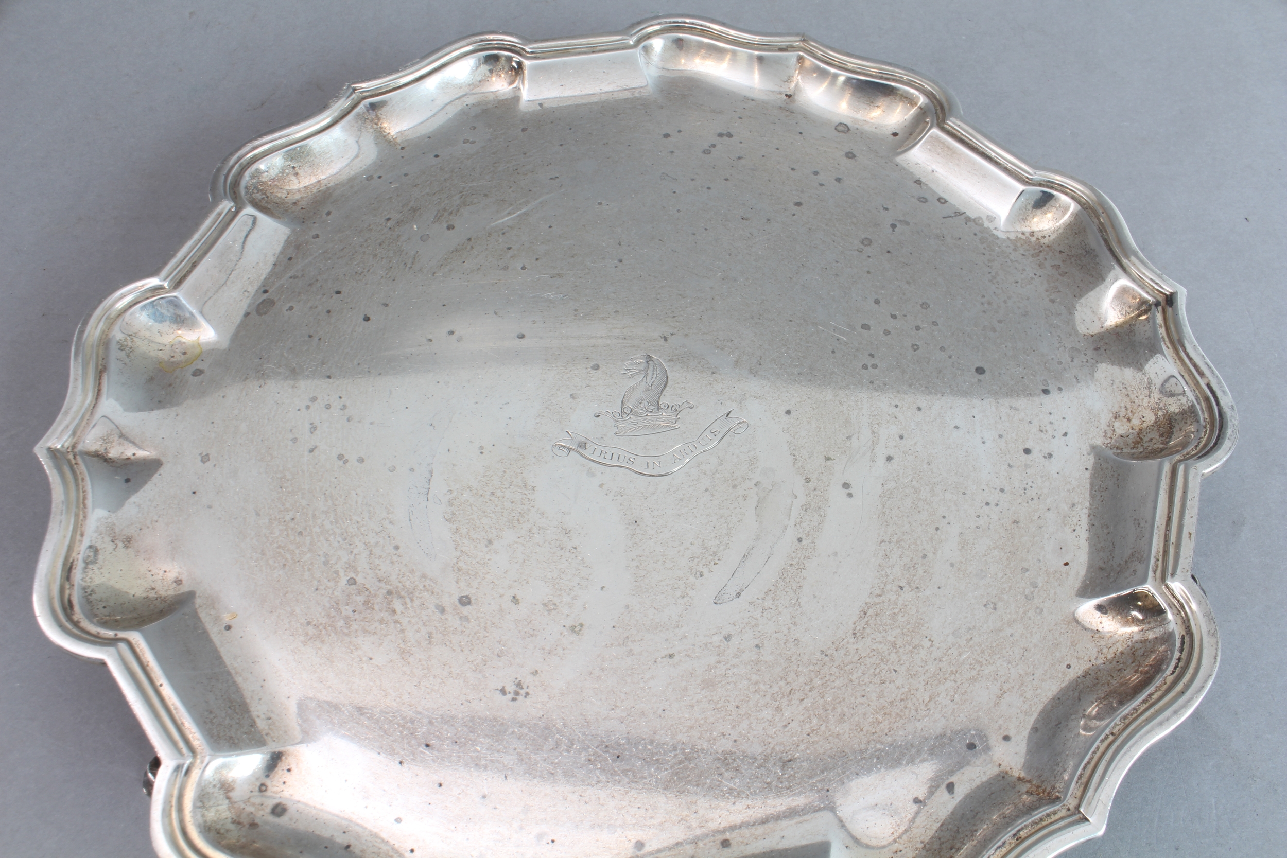 A heavy Georgian-style (later) hallmarked silver salver; engraved armorial with Latin motto 'Virtus in Arduis'; raised border in 18th century style; three shaped feet; maker's mark of D. & J. Wellby, assayed London 1910. (21 cm in diameter). (Approx. 353 g)