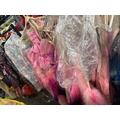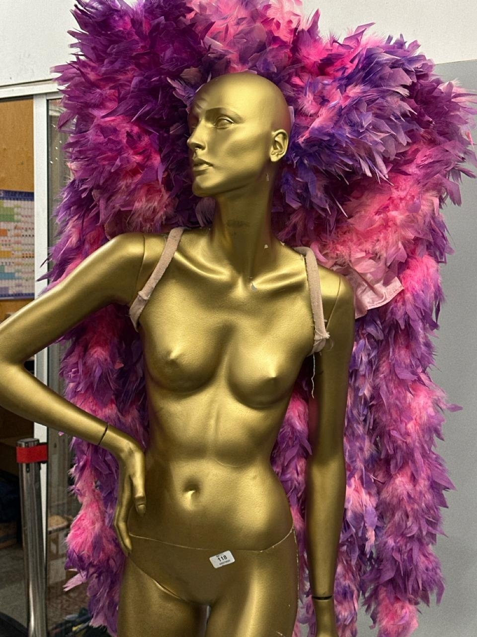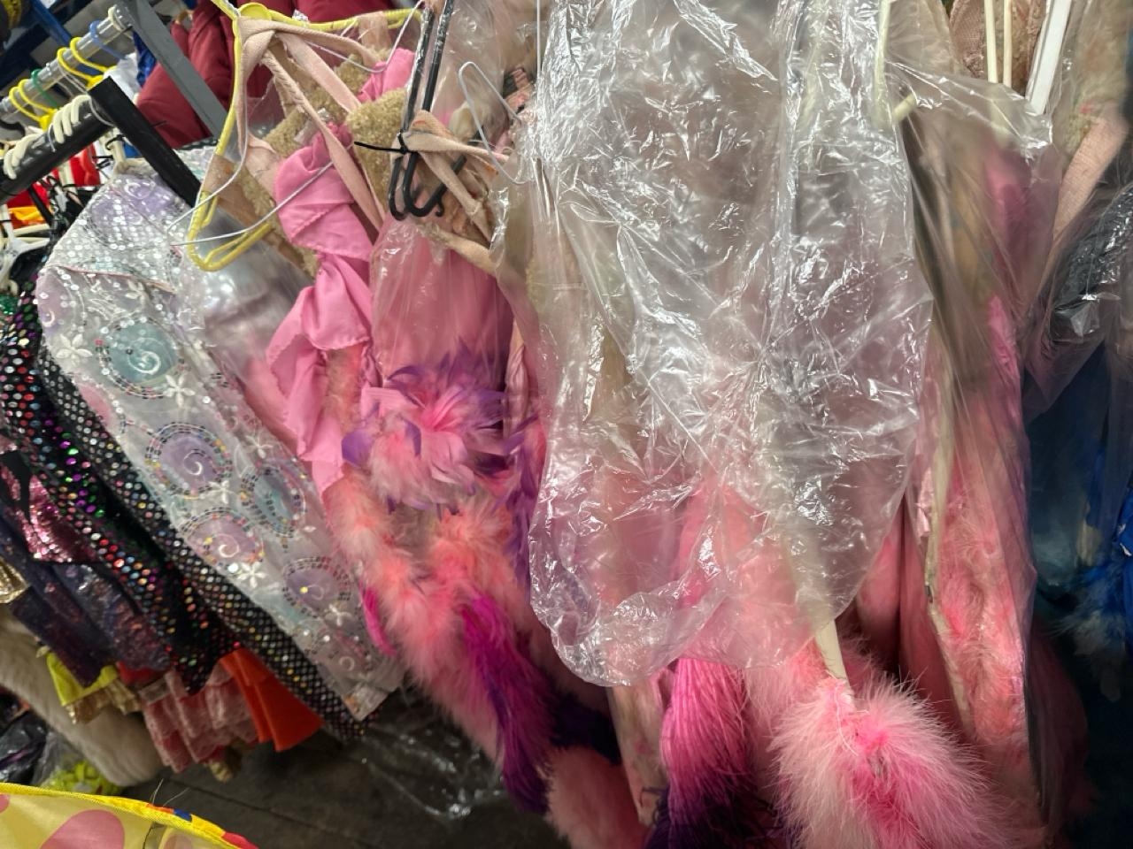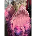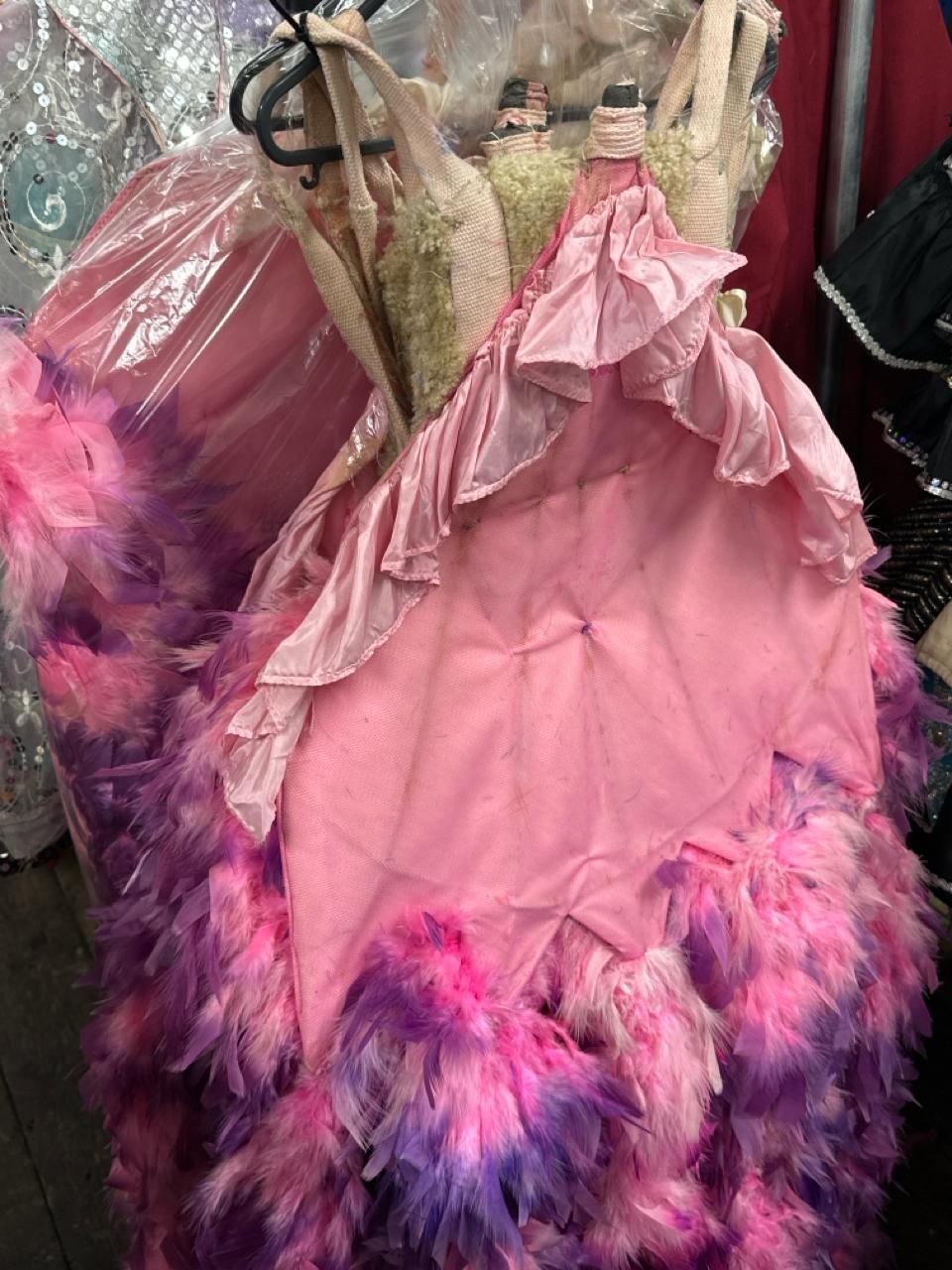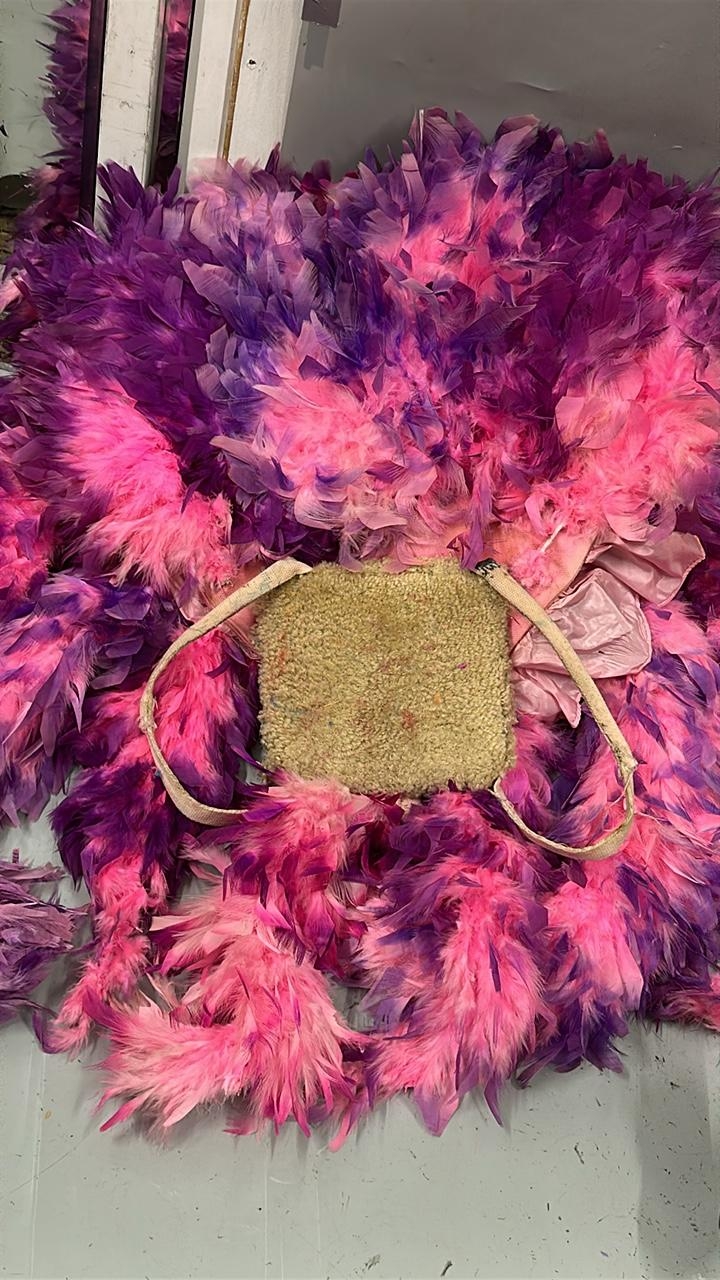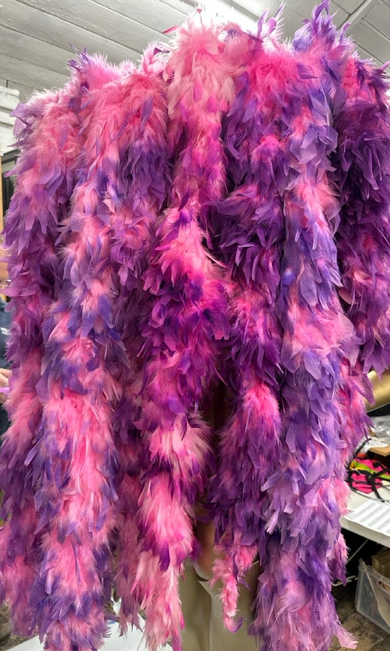 Fourteen stage used showgirl pink and purple feather back pieces / Rail 4