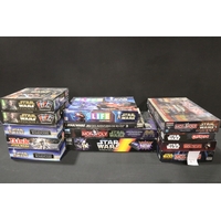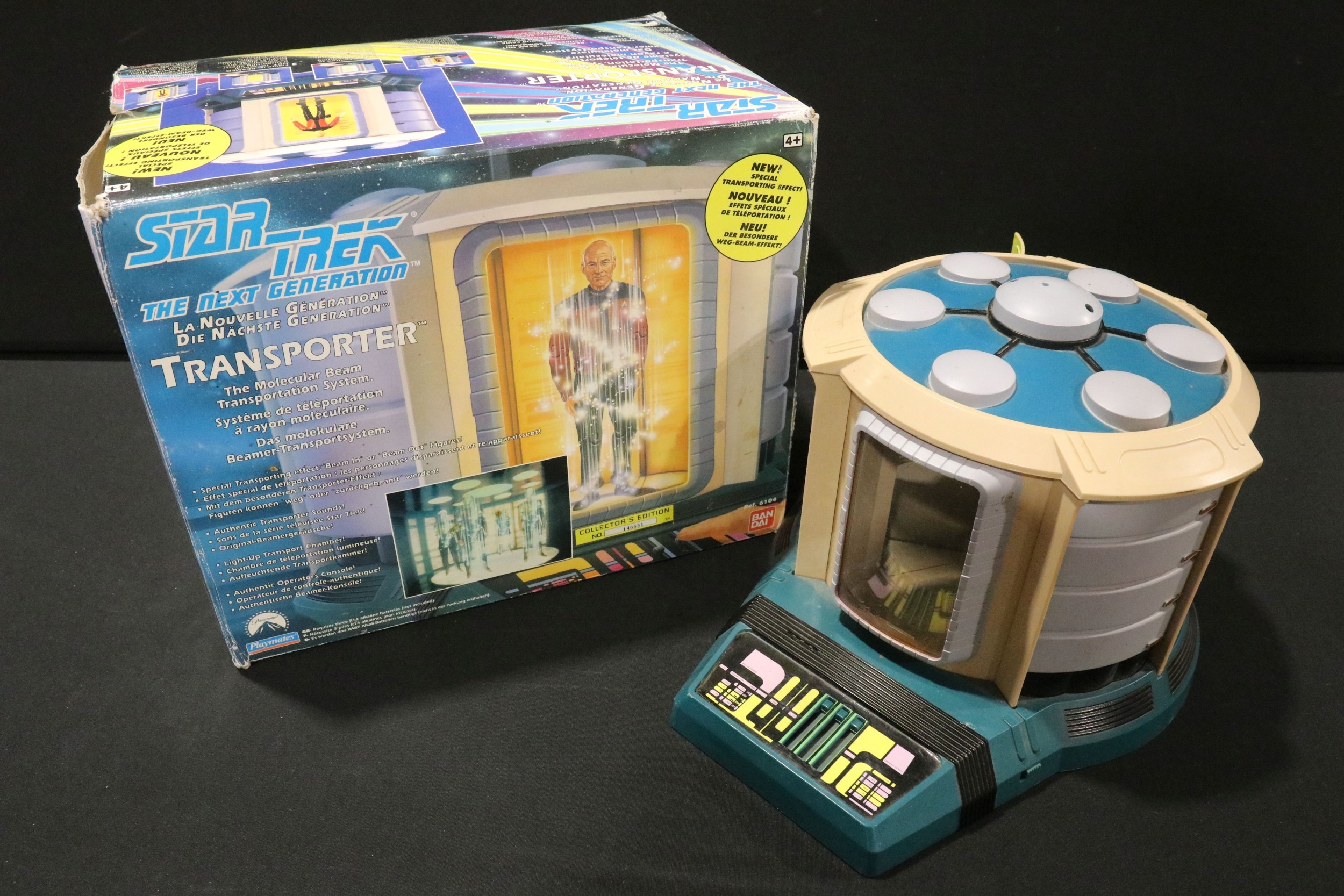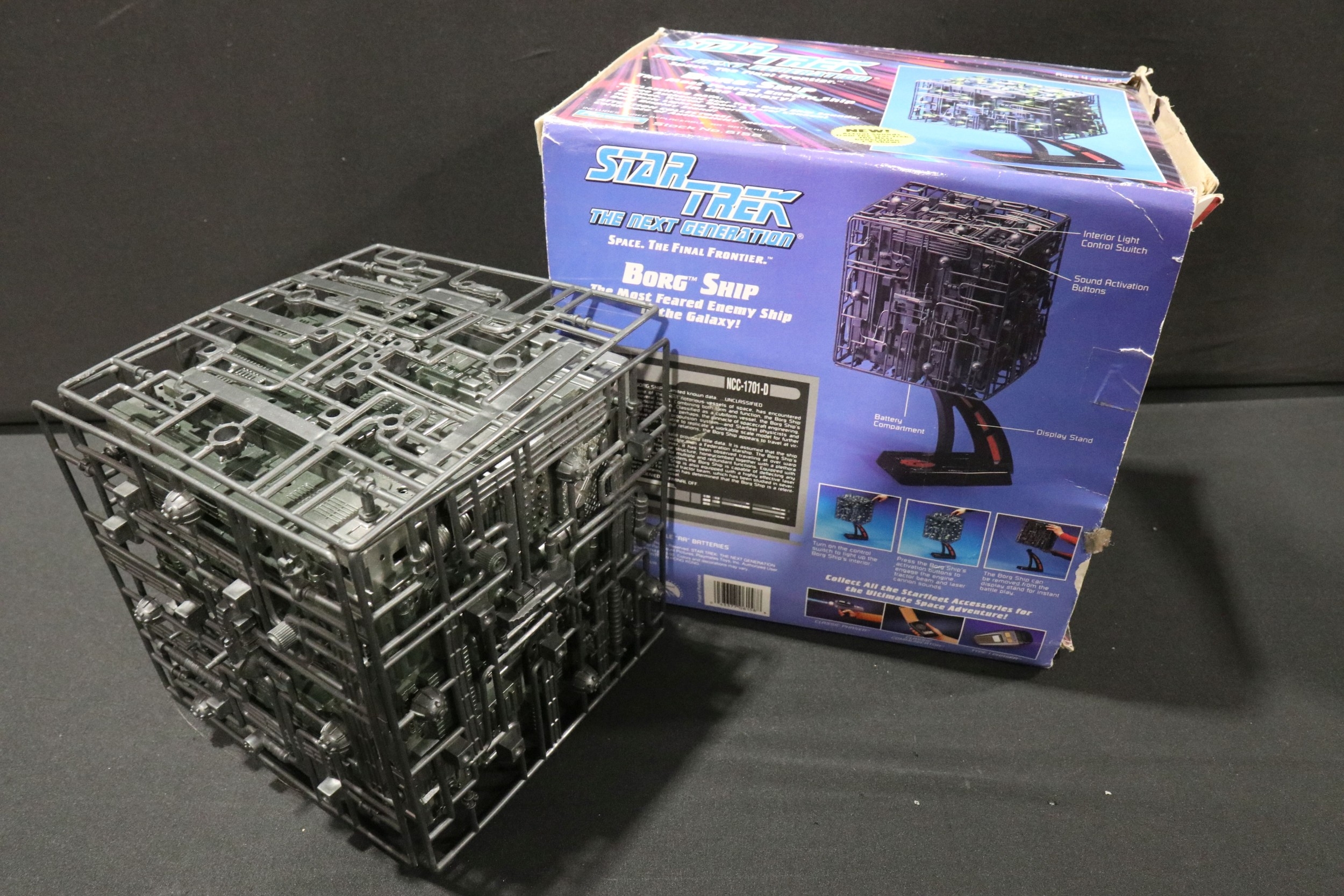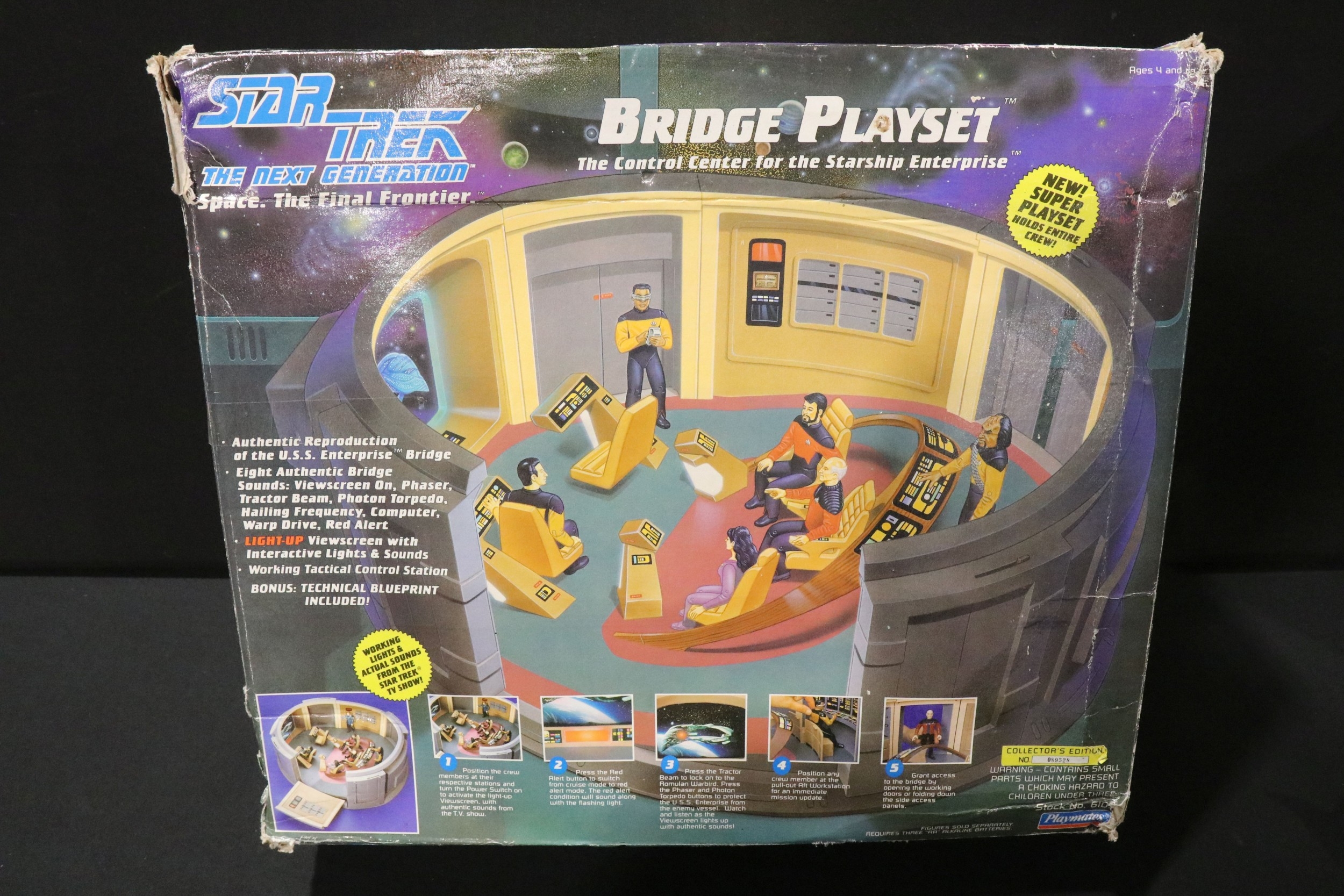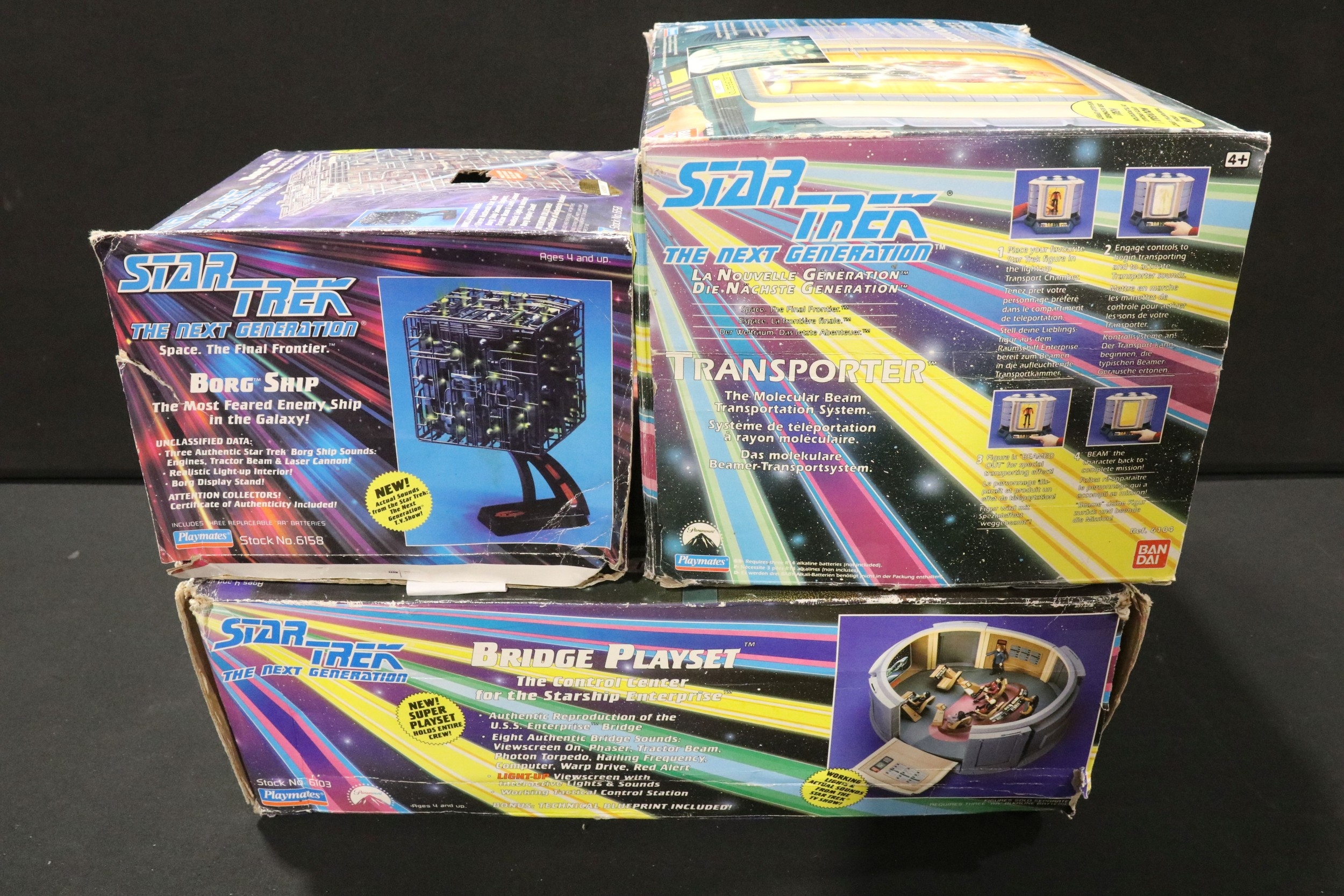 Three boxed Playmates Bandai Star Trek The Next Generation play sets to include Bridge Playset, Borg Ship and Transport, boxes tatty