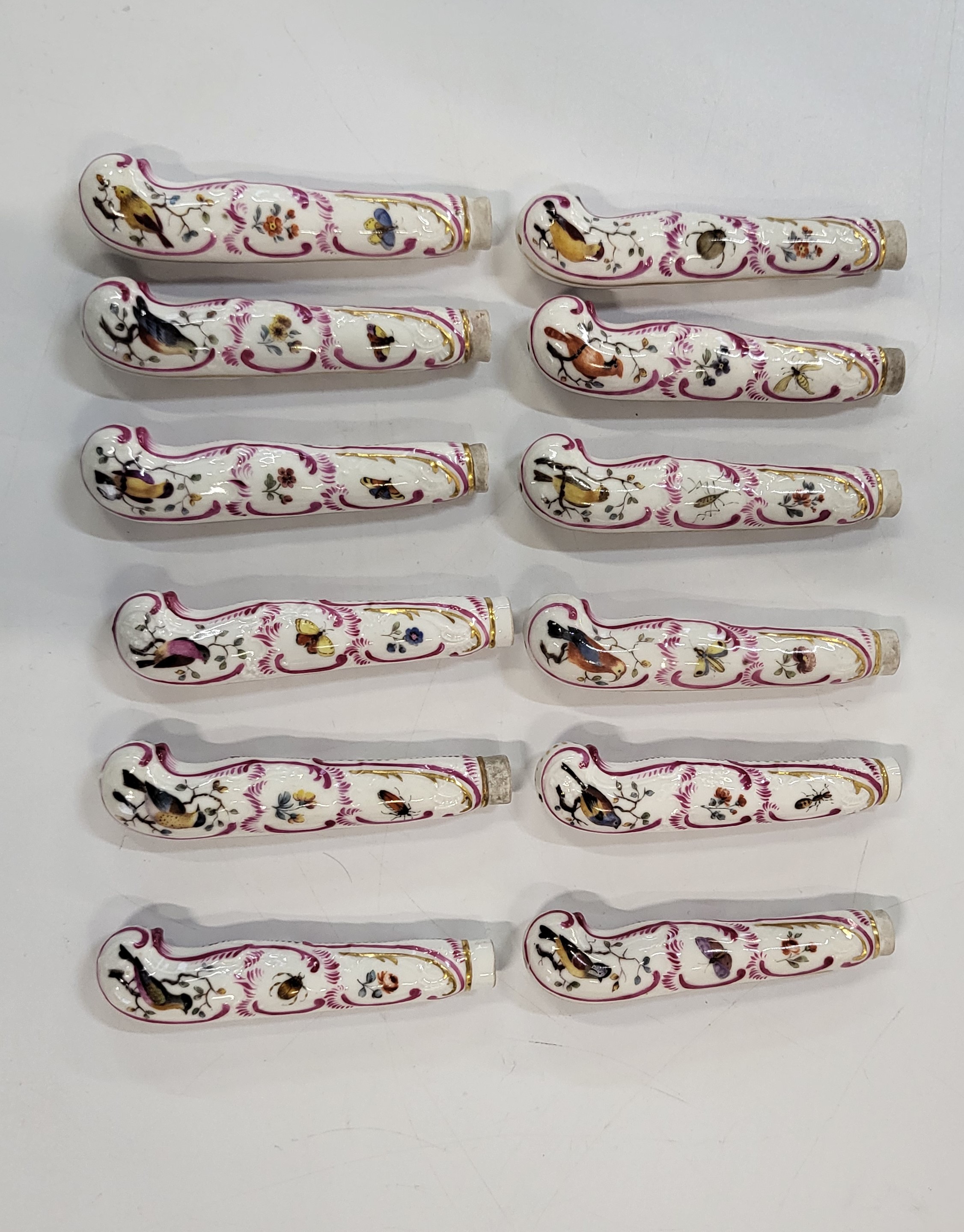 Twelve continental pistol grip cutlery handles with bird designs. (12)
