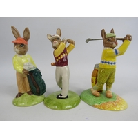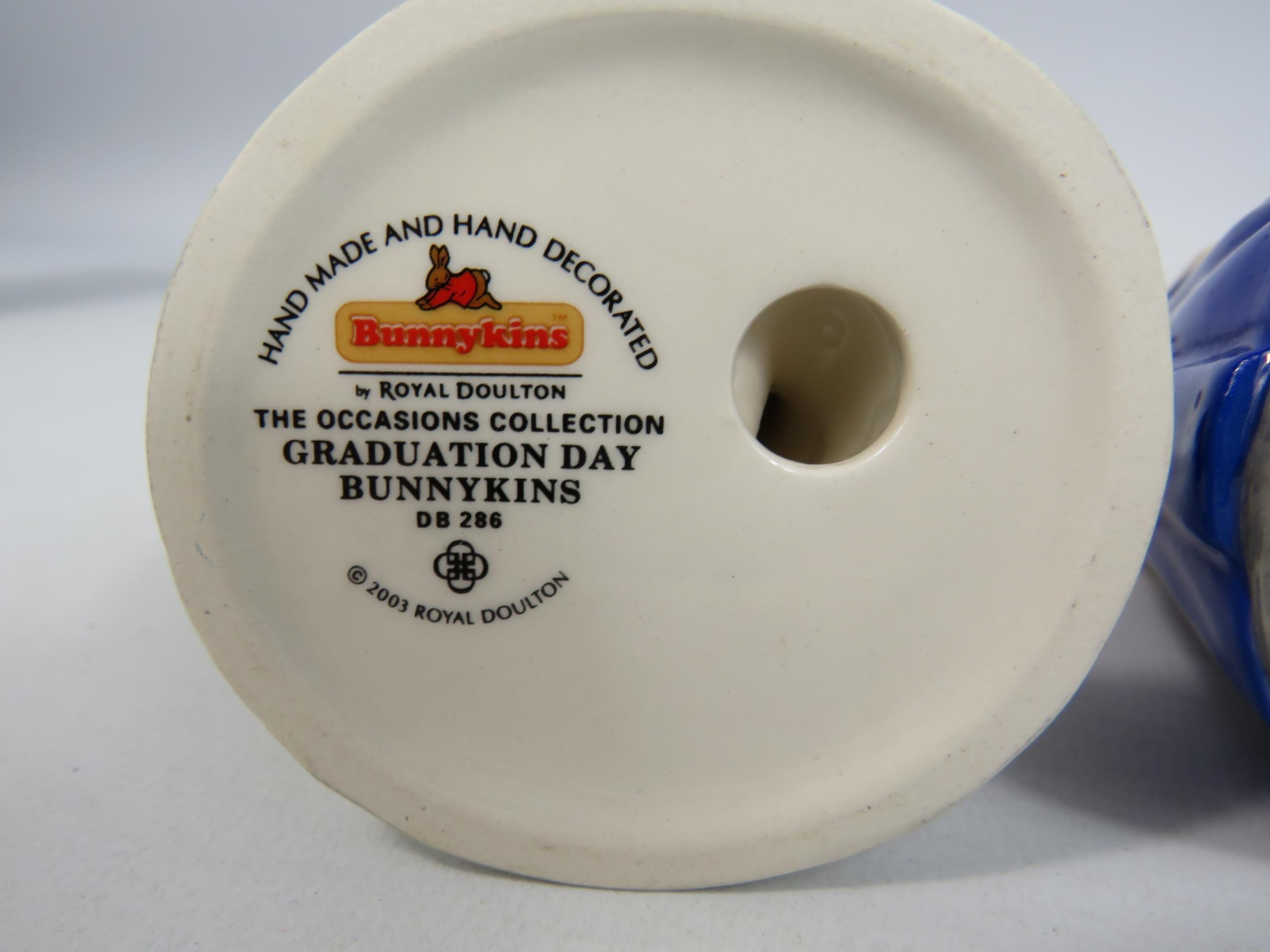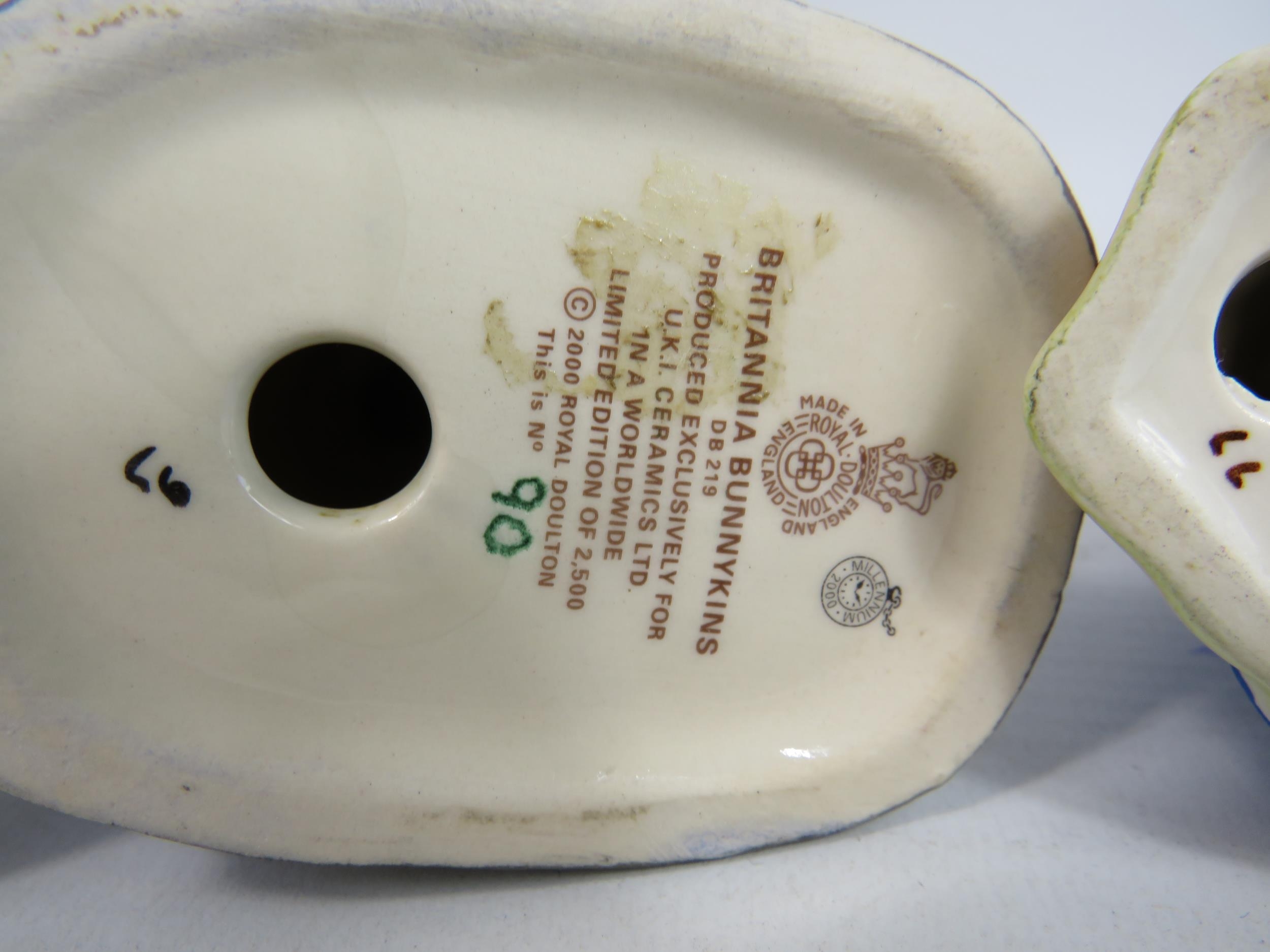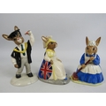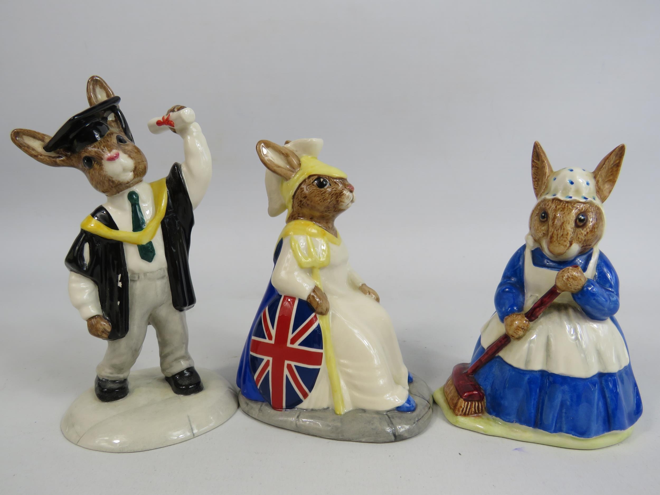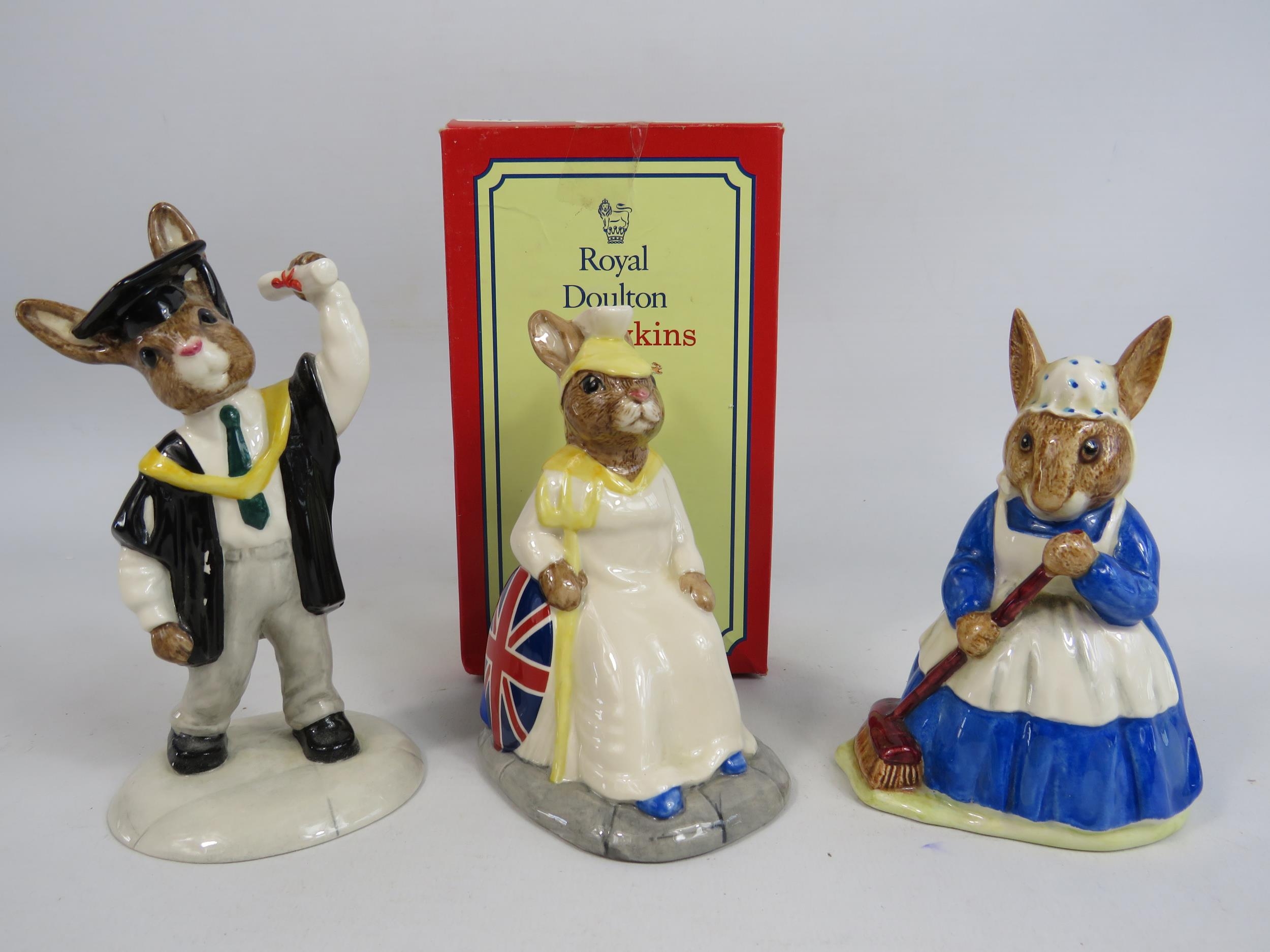 3 Royal Doulton Bunnykins figurines, Britannia limited edition 90 of 2500 with box, Mrs Bunnykins clean sweep and Graduation day.