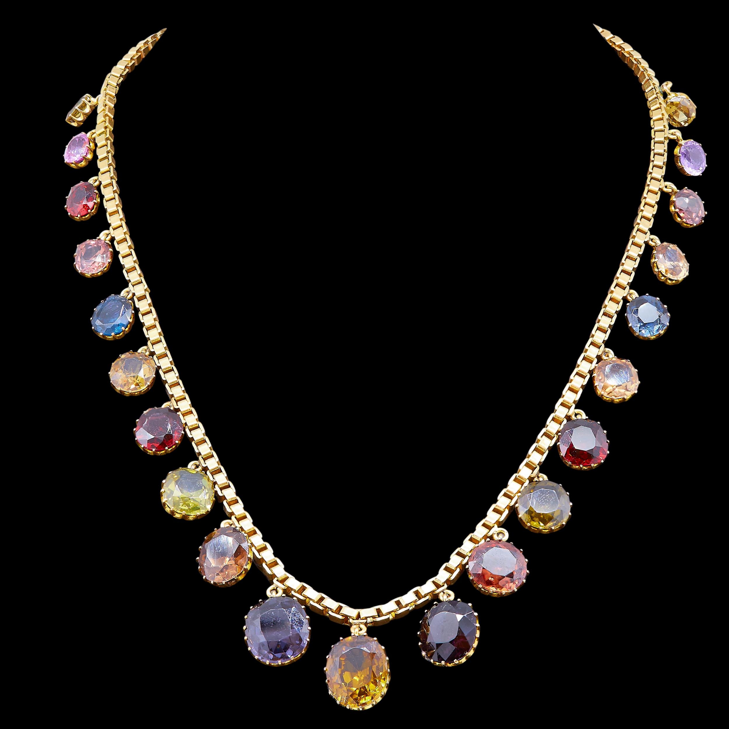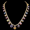 MULTI-GEMSTONE DROP NECKLACE, in 18 ct. gold. The necklace set with 21 multi gemstone drops, graduated in size. Gemstones including Sapphire, citrine, peridot, and amethyst. L. 46 cm. 21.6 grams.