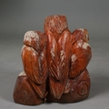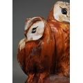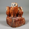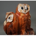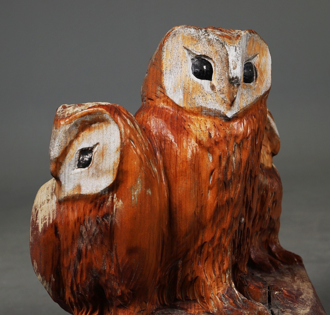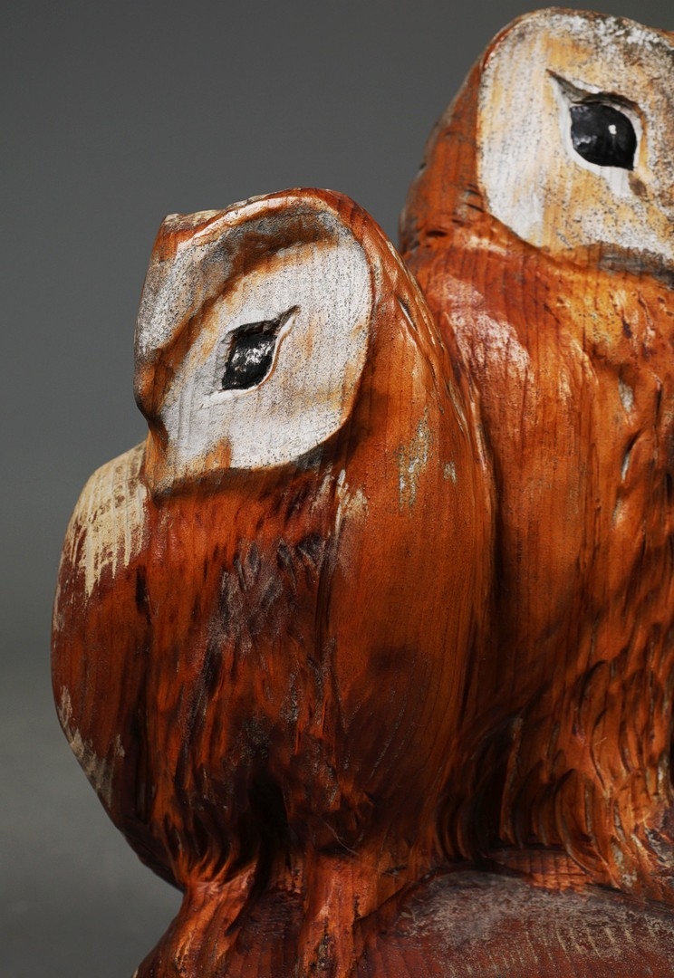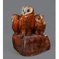 CONTEMPORARY SCHOOL SCULPTURL OWL FAMILY. carved wood, painted detail, 62cm H approx.