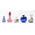 A group of five small glass vases and bottles including a ribbed pale green iridescent bottle with loop handle, 9cm; a Kosta Boda vase [78215], 6cm; one similar,[?3985]; 8cm; and two others [5].