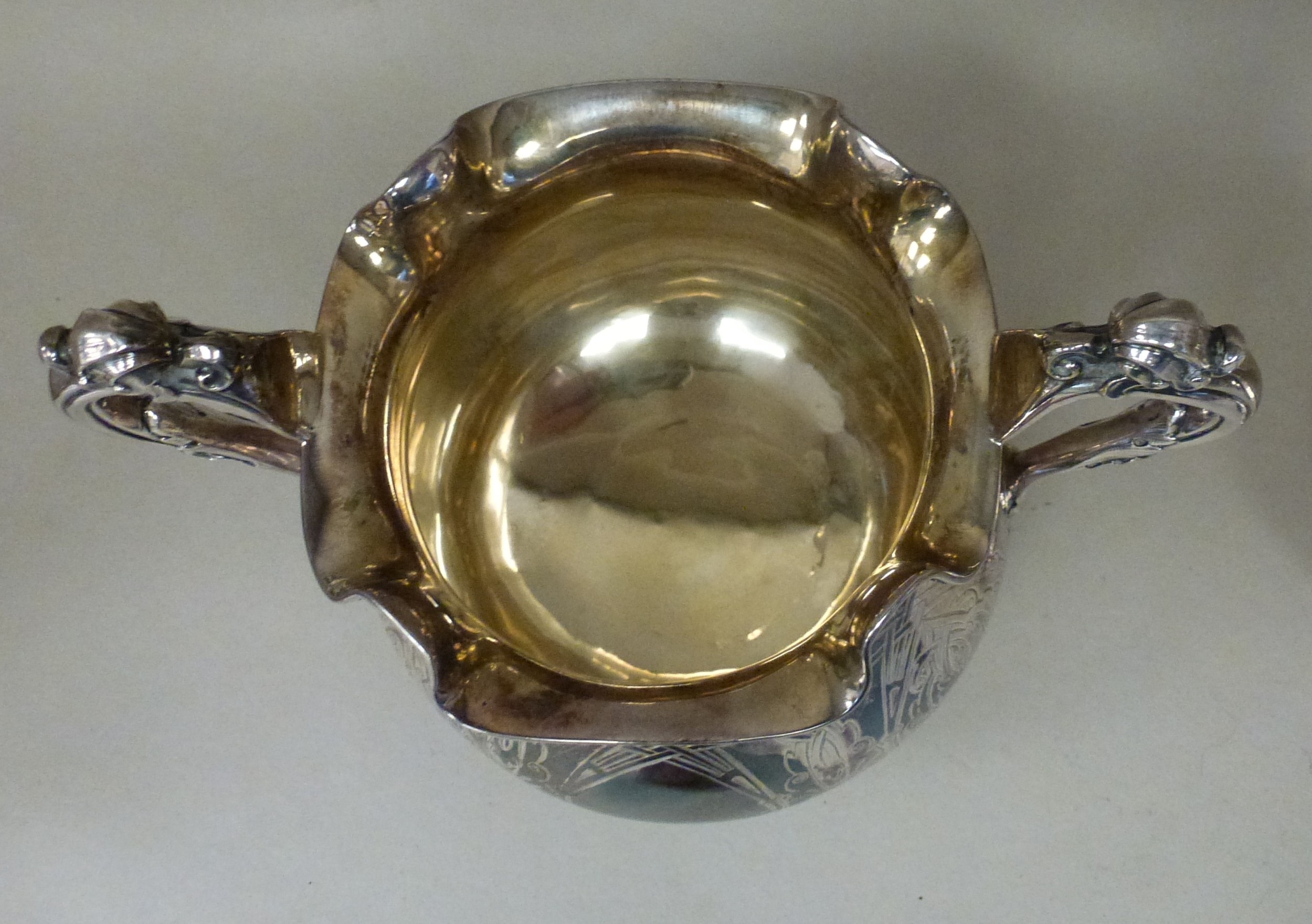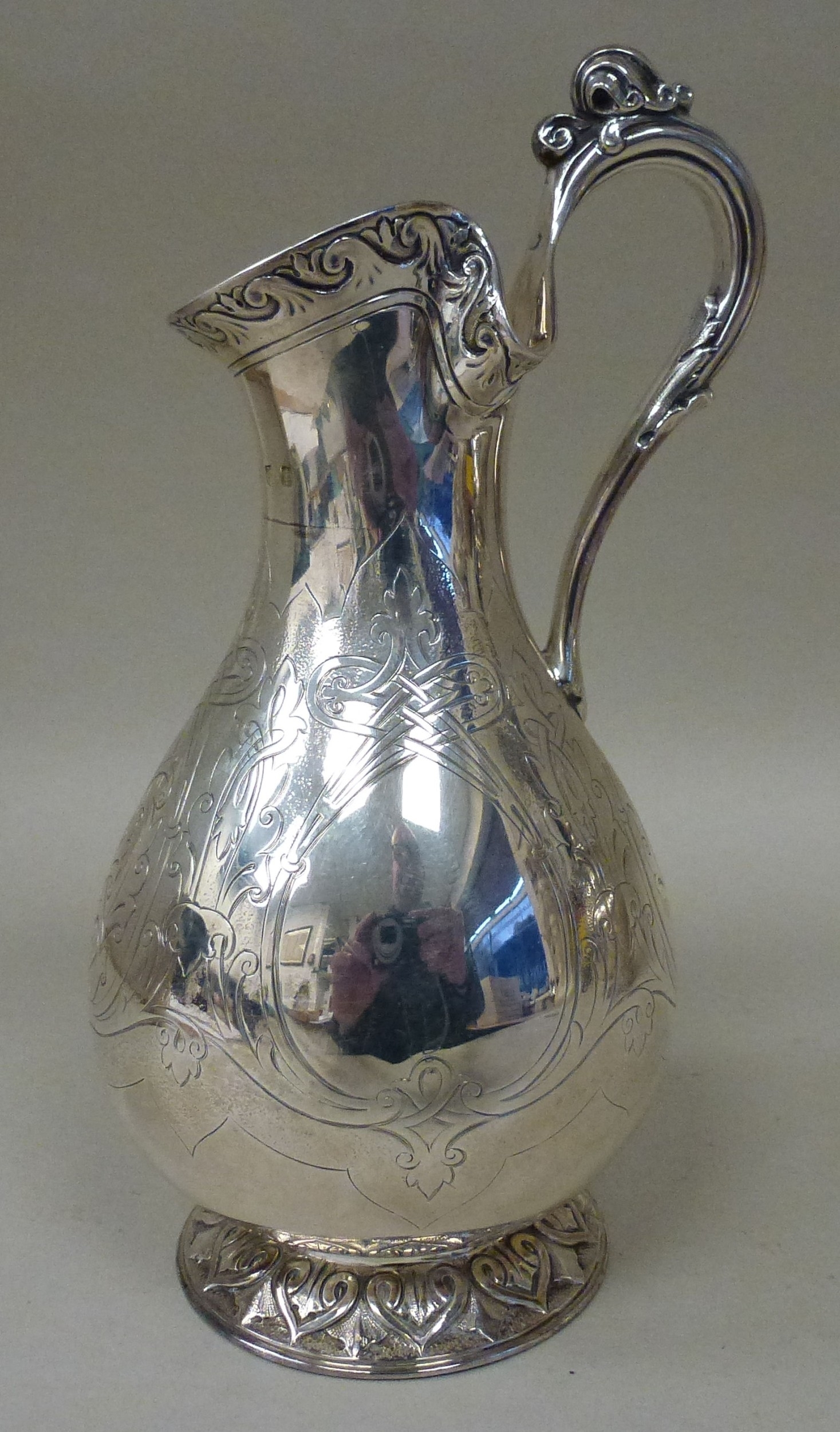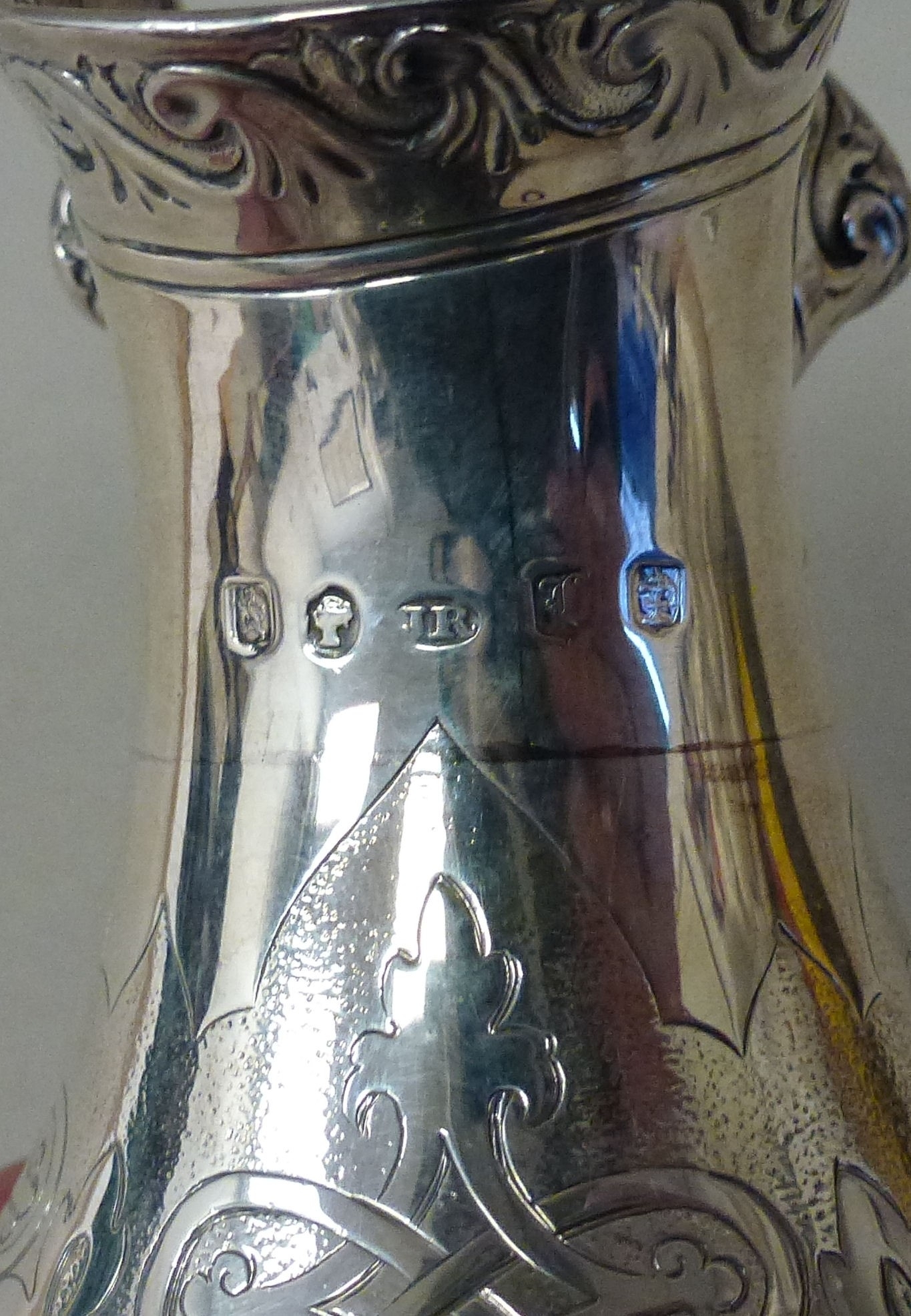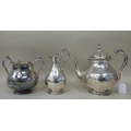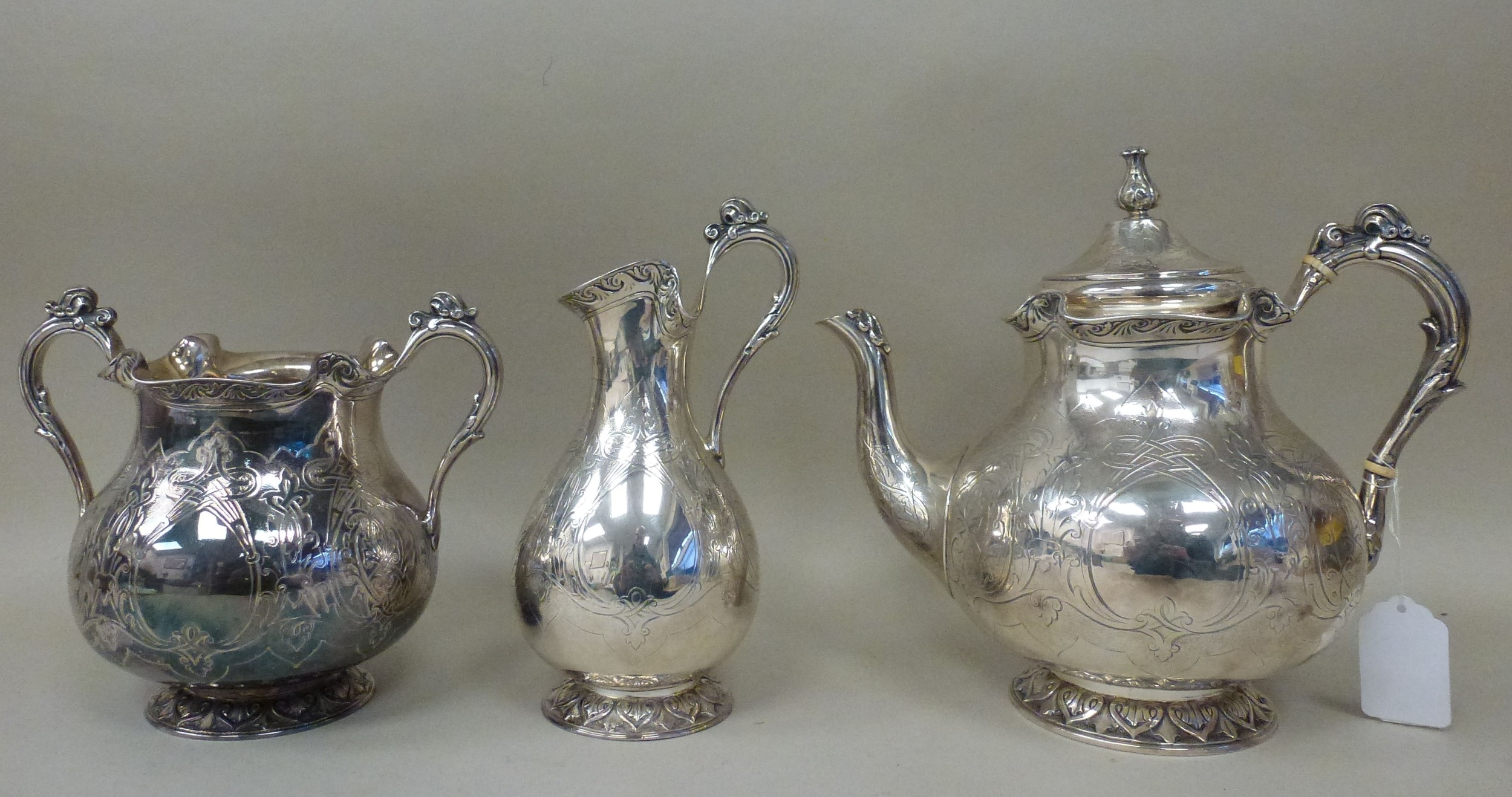 A mid Victorian silver three piece tea set, comprising a teapot, sugar basin and milk jug with scrolled ornament Glasgow 1856 (approx. combined gross weight 1535grms)