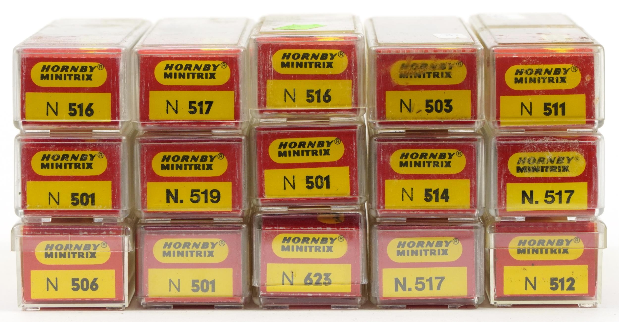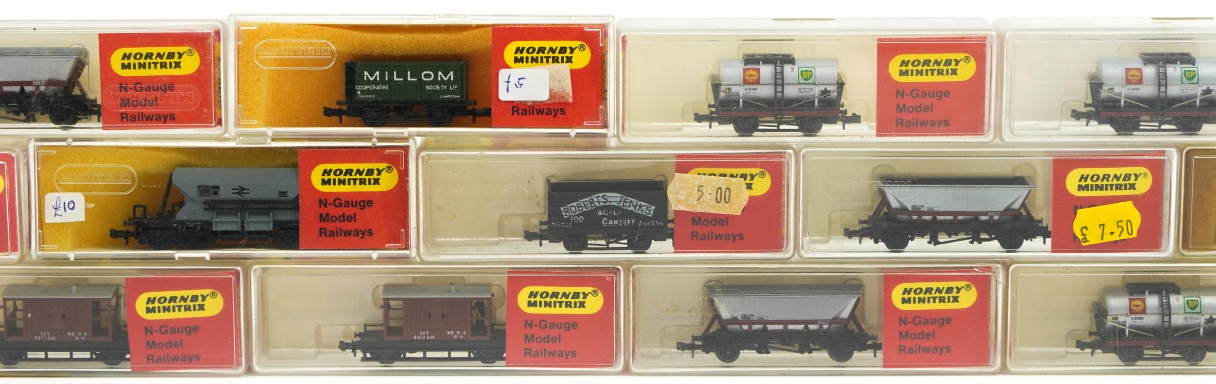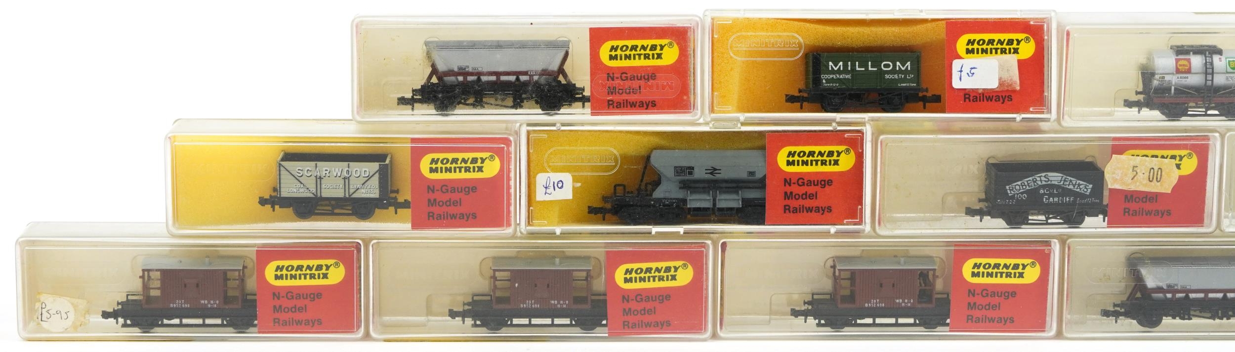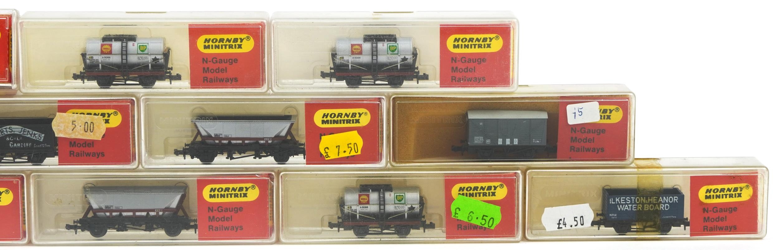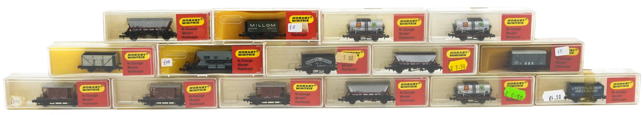 Fifteen Hornby Minitrix N gauge model railway tankers and wagons with cases