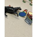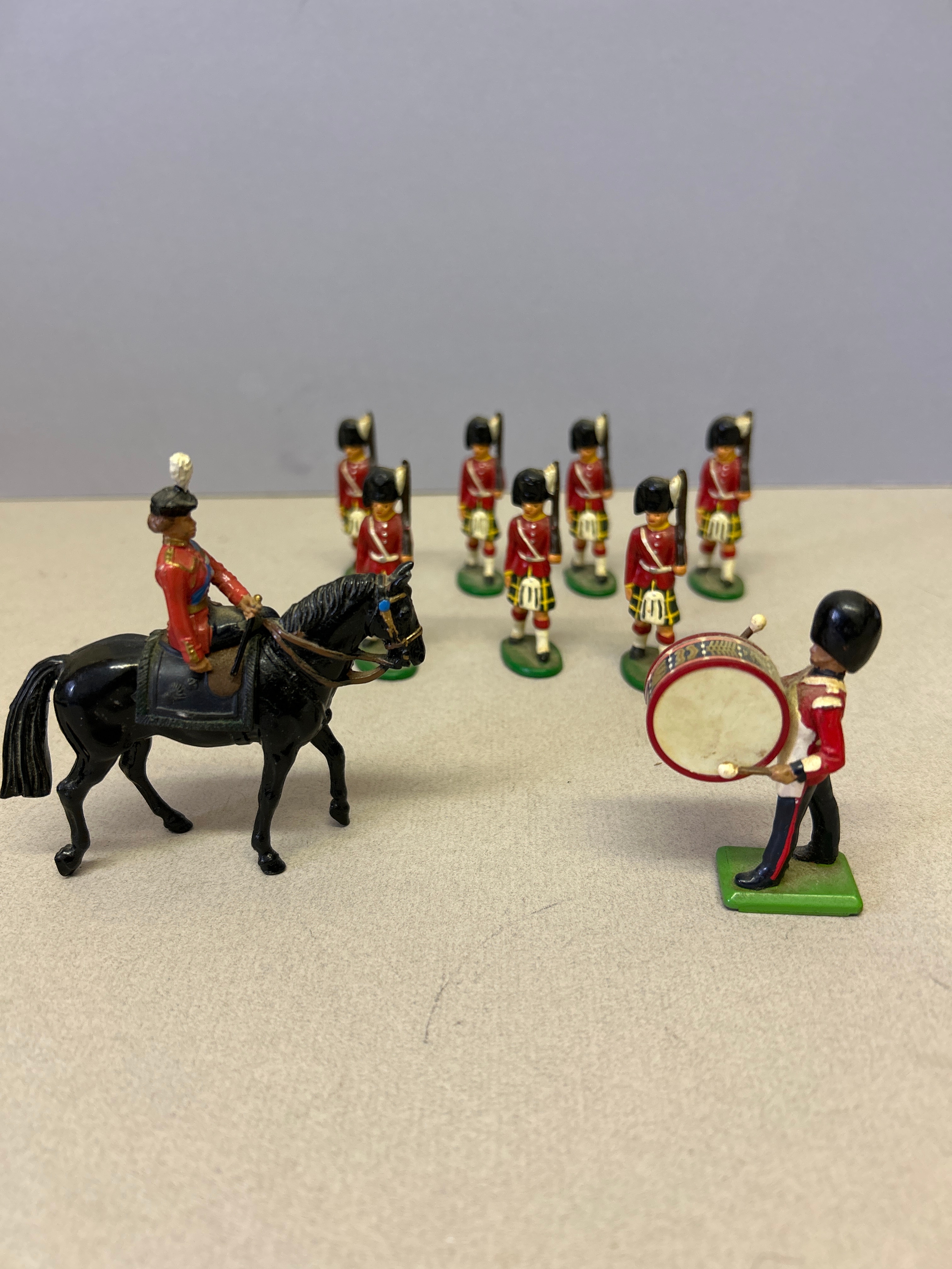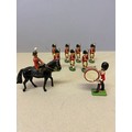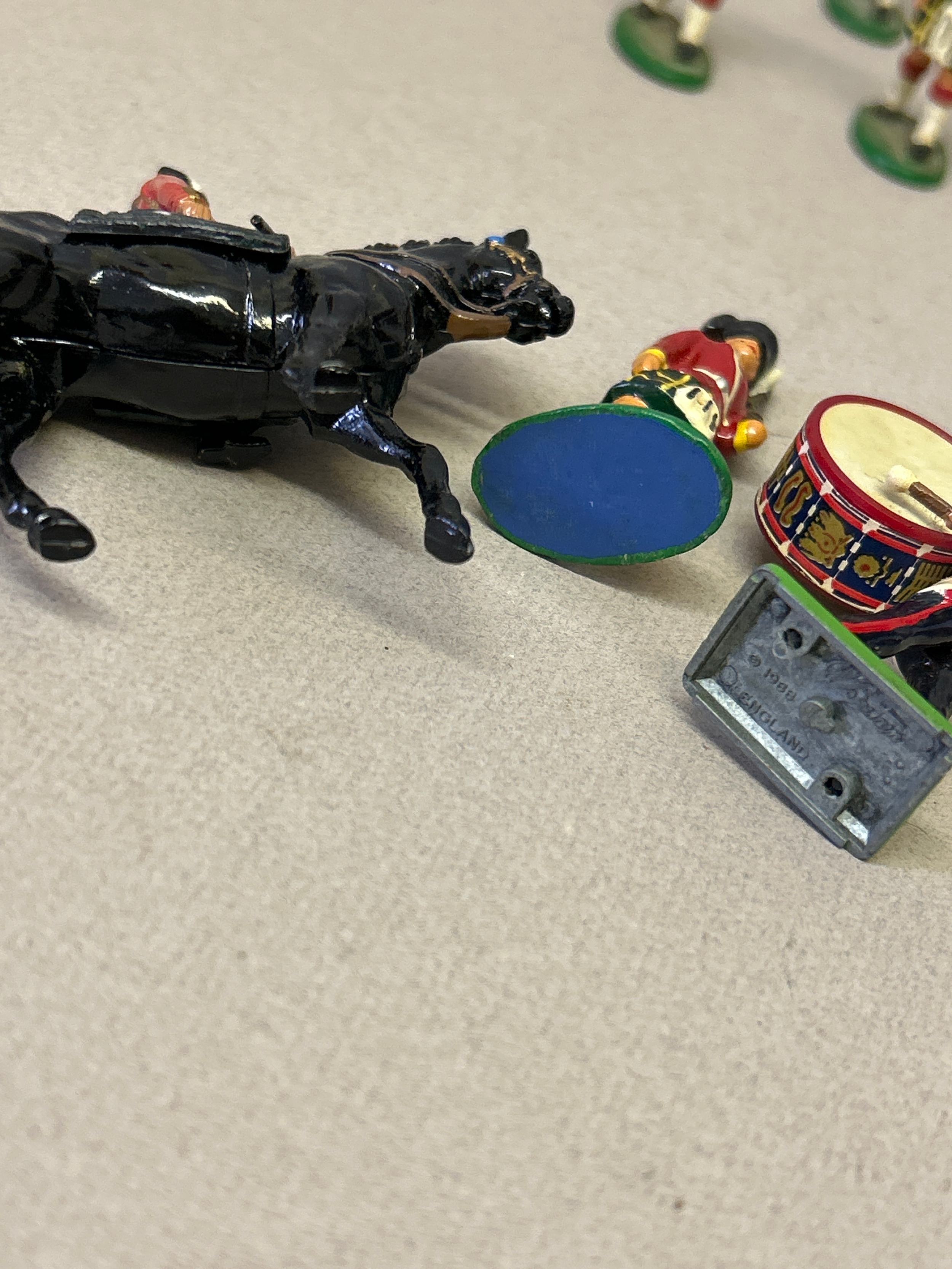 Queen Elizabeth II on horseback and bandsmen handpainted model figures, probably all Britains but only the Bass Drummer marked.