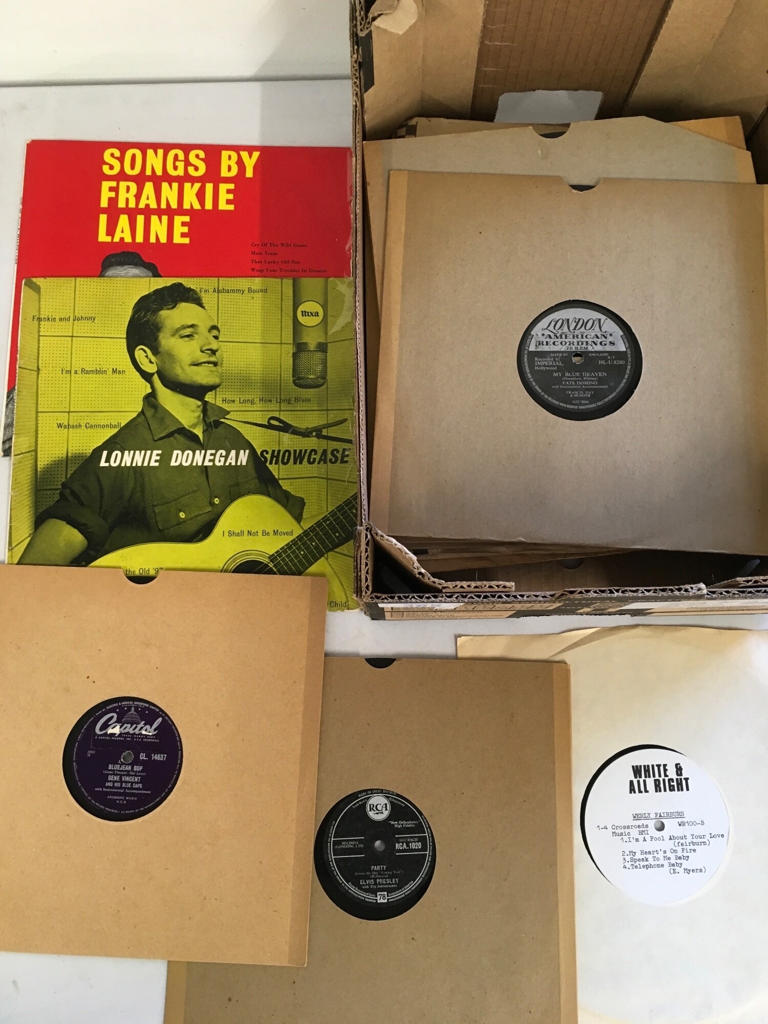 A box of 78s and 10" records by various artists including Gene Vincent, Elvis Presley and others.