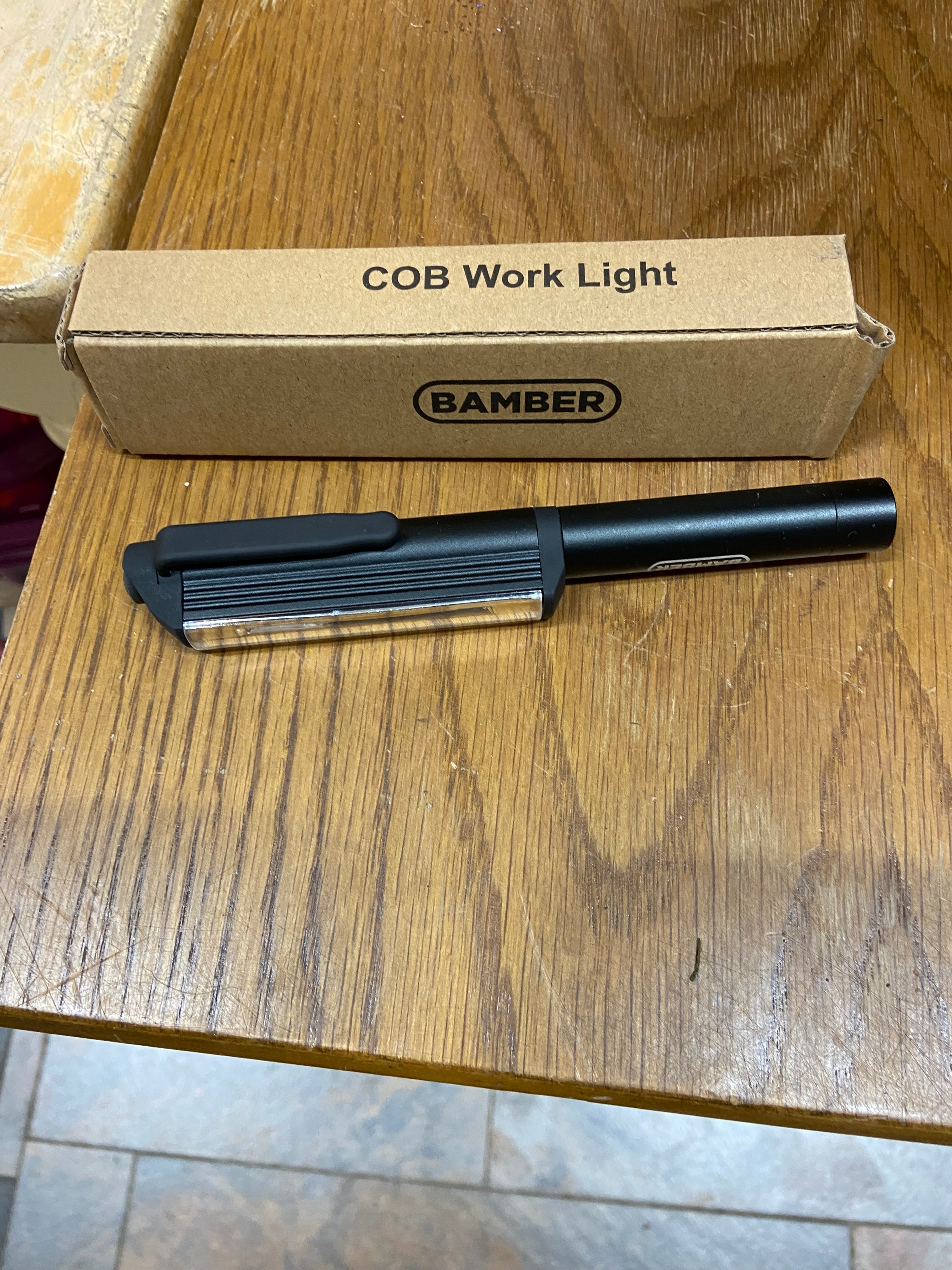 A Bamber COB work light, pen-style, in black plastic casing, with retail carton.