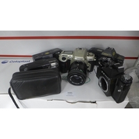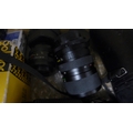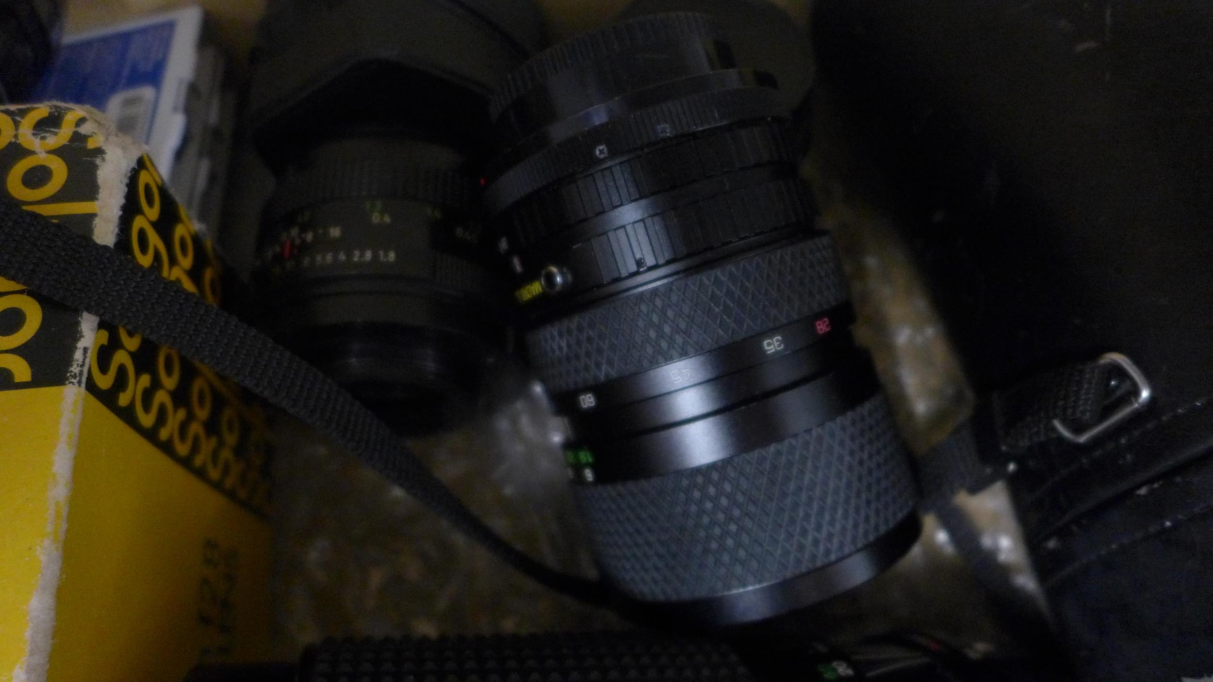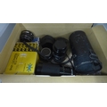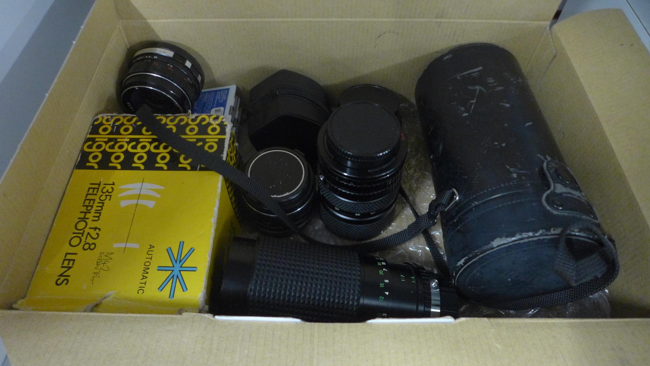 A quantity of camera lenses including zoom lens, auto zoom, Pentacon auto, Canon zoom lens, etc., and other camera equipment including camera filters and a box of telephoto lenses