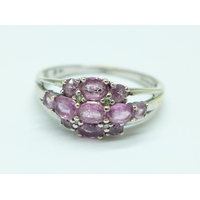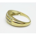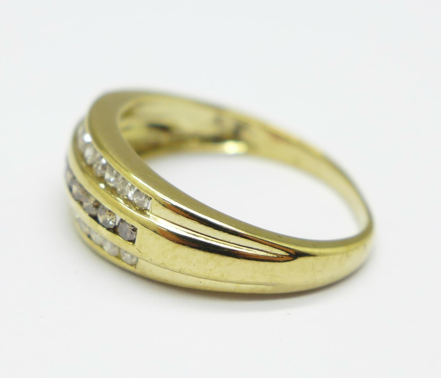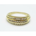 A 9ct gold, three row, white diamond and cognac coloured diamond ring, 2.9g, O