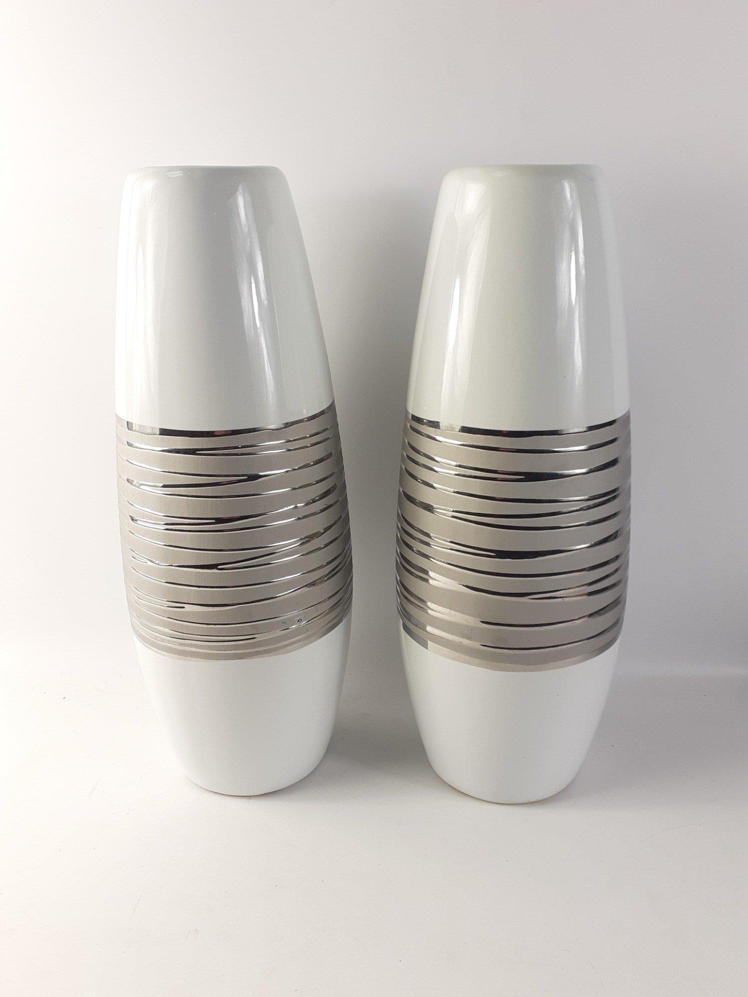 A very attractive pair of 40cm tall vases. White glaze with silver striping. Both in good condition.