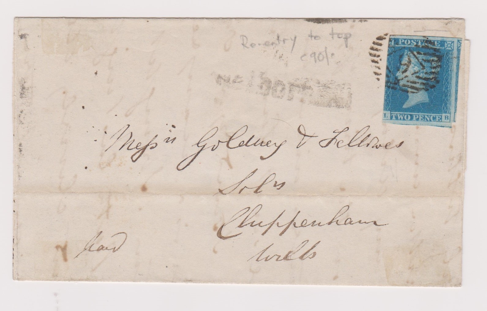 Great Britain 1848-Large part of letter posted Edinburgh to Chippenham-cancelled with town numeral strike on SG13-2d pale blue 3 good margins