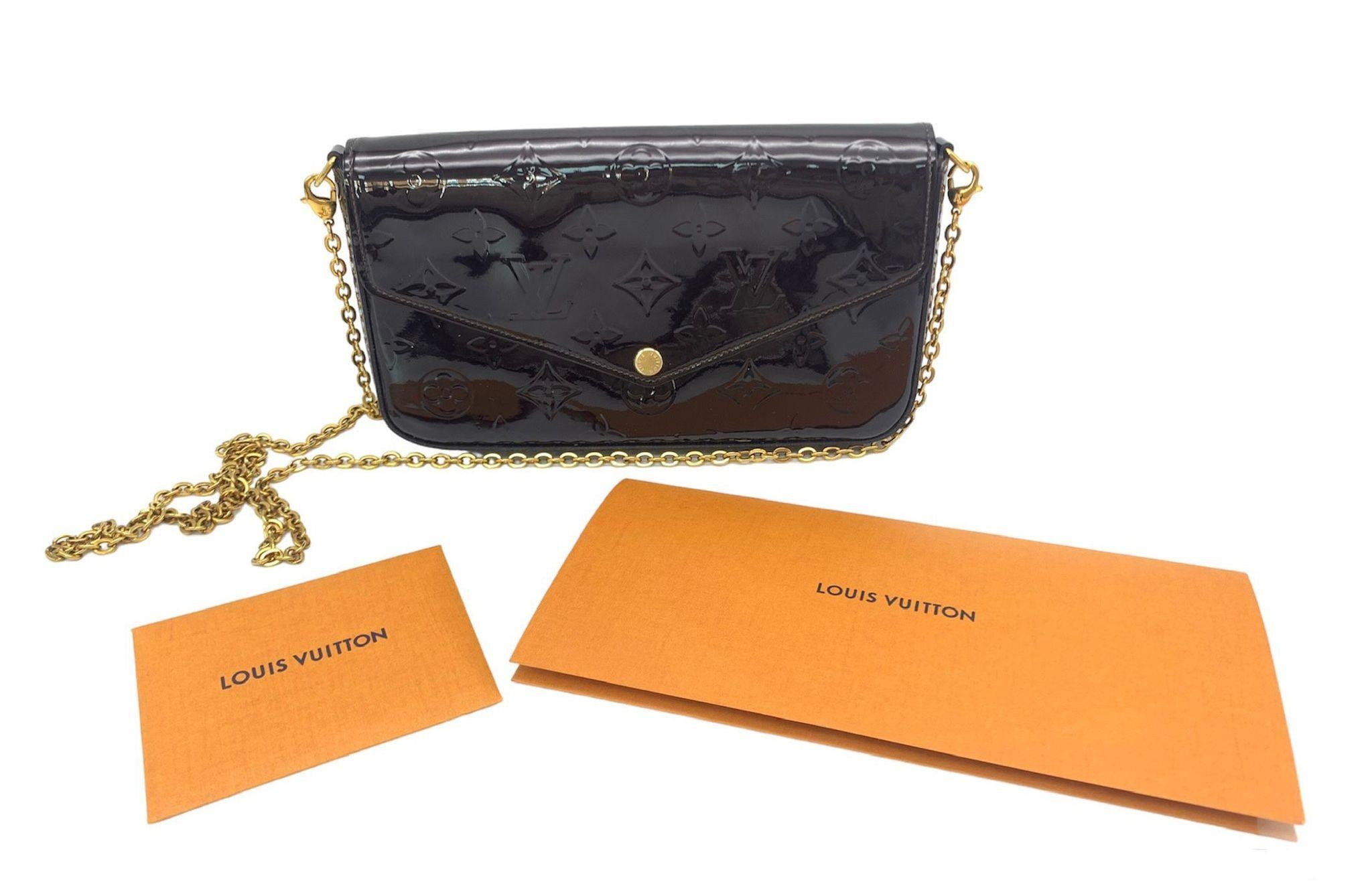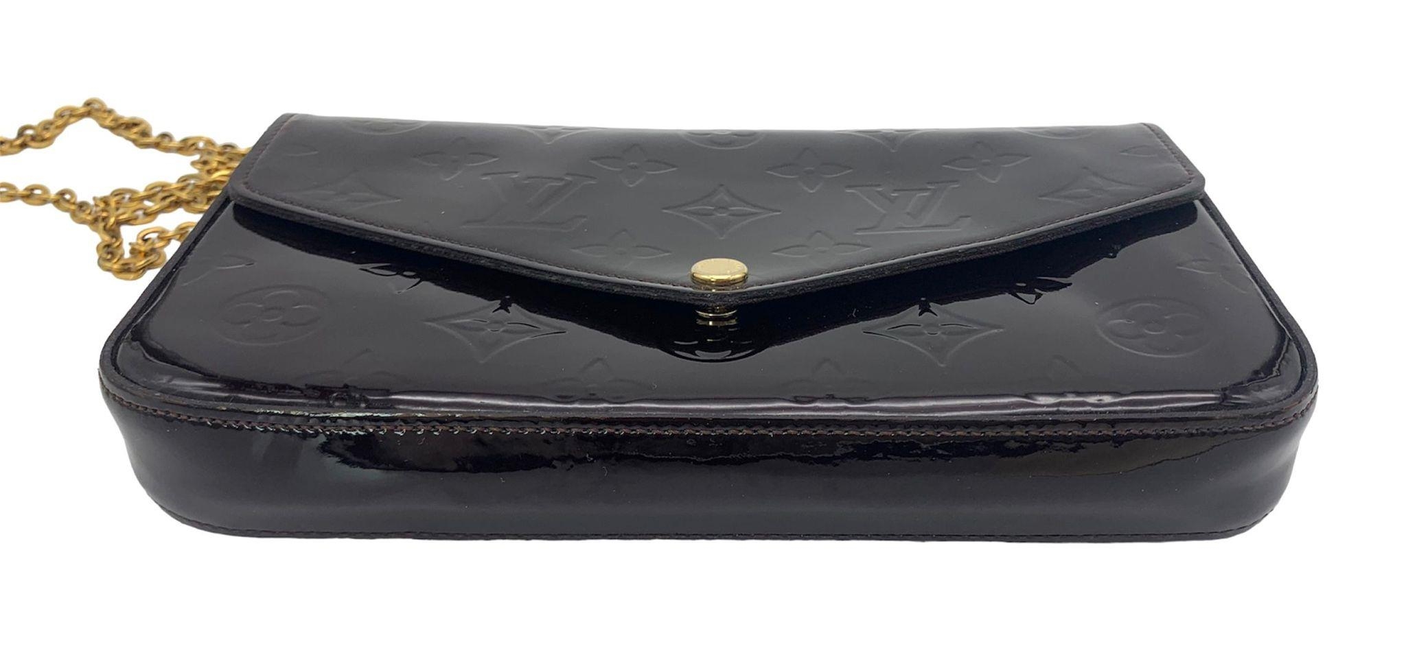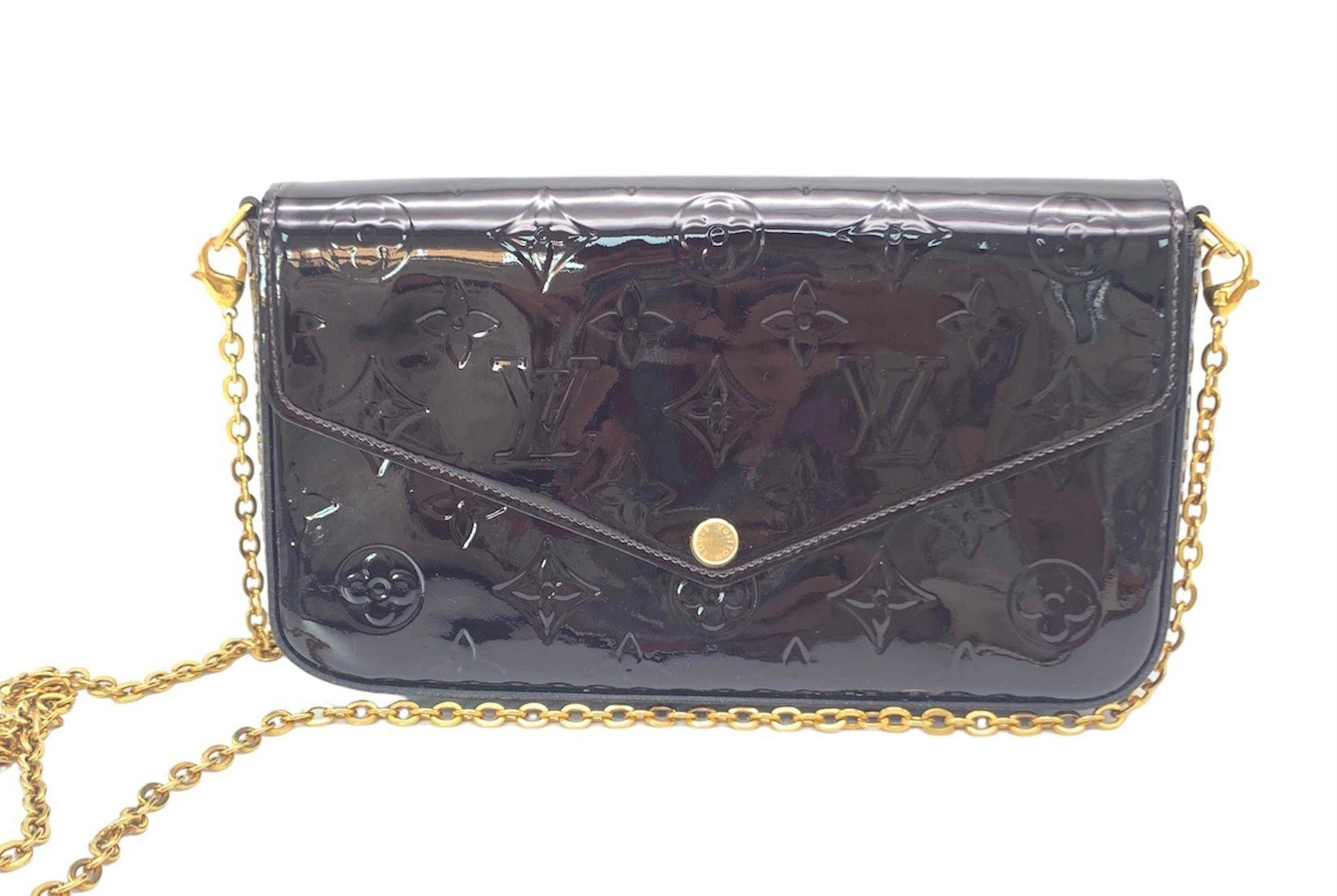 A Louis Vuitton Burgundy Patent Leather Bag. Monogram exterior with gilded handle. Textile interior with open compartment. Comes with the original receipt. In very good condition but please see photos. 21cm x 12cm. Ref: 13540