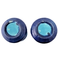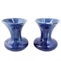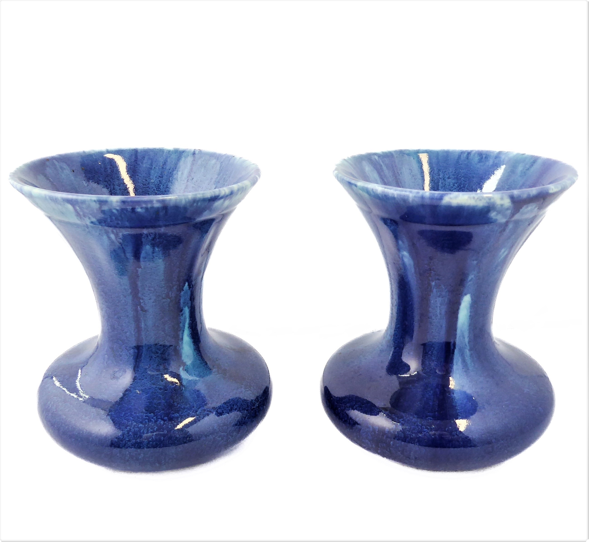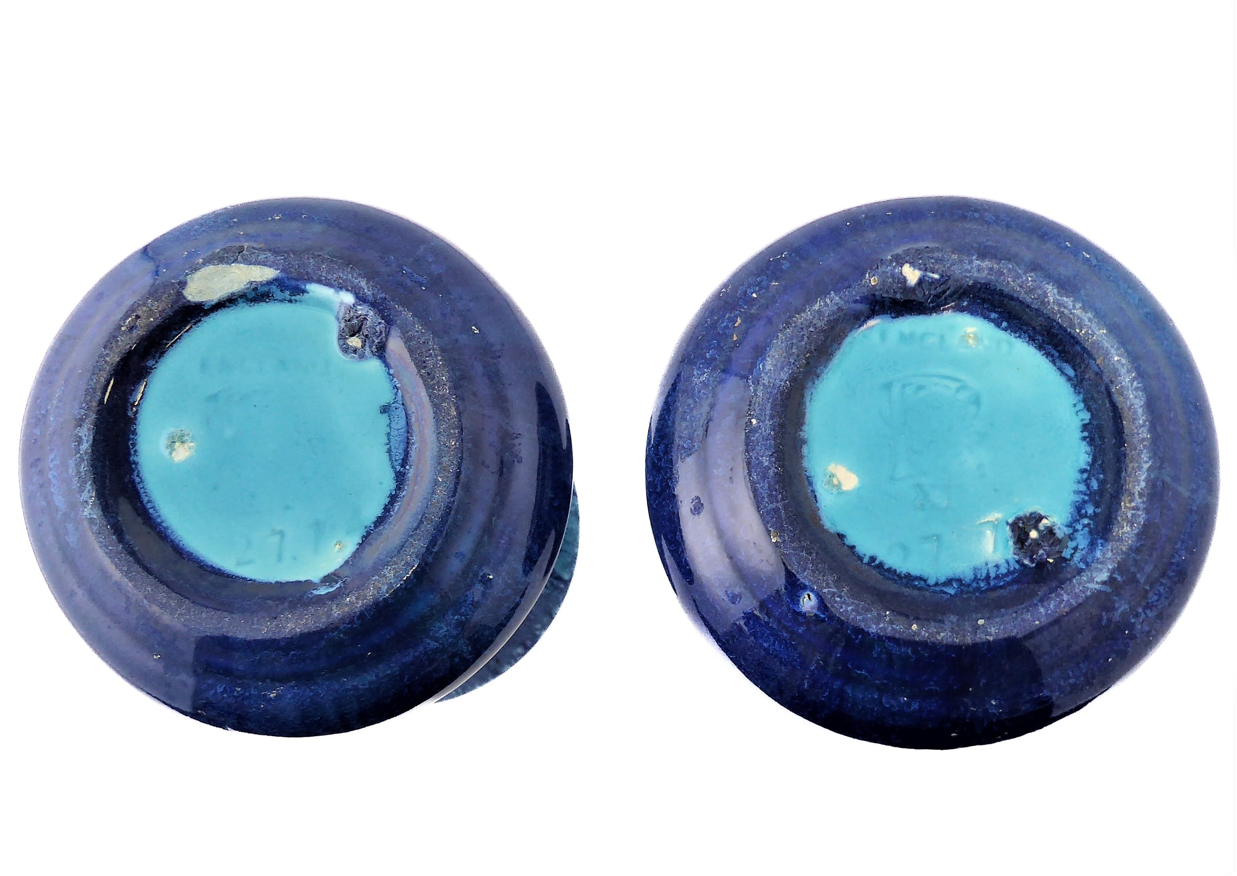 A pair of Art Deco period Pilkingtons 'Lancastrian' blue-glaze ceramic vases: squat spherical form and with wide waisted necks; stilt marks and impressed marks to the underside. (11.5 cm high)