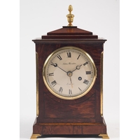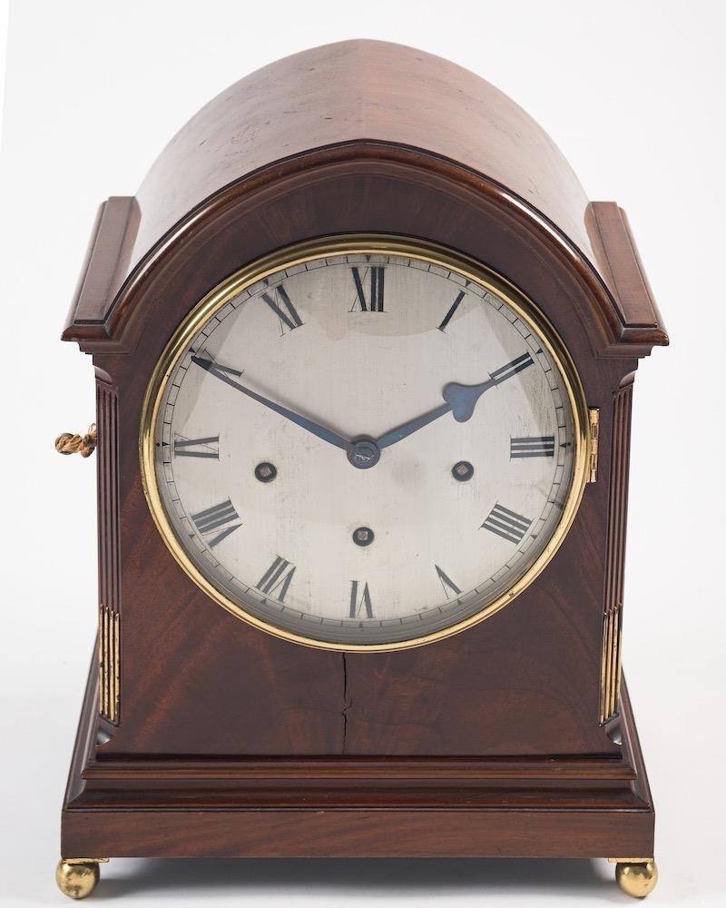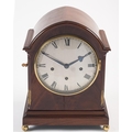 Richard & Co, a mahogany quarter chiming bracket clock: the eight-day duration, three-train movement striking the hours on a bell and the quarter hours on a further four gongs, the backplate stamped with the initials R&C within an oval being for Richard & Co. of Paris, the eight-inch silvered brass convex dial engraved with black Roman hour numerals and with blued steel spade hands, the mahogany arched top case having fluted canted corners with brass stops and standing on brass ball feet, height 39cm. *Notes For details of Richard et Cie see lot 1257