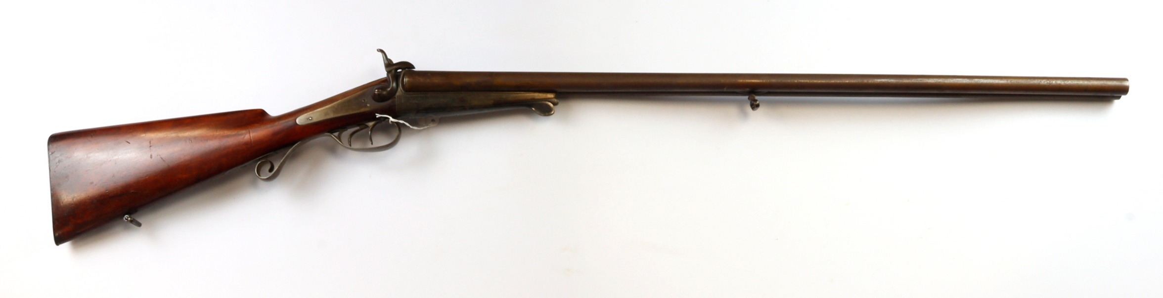 Swedish 16-Bore Pinfire Shotgun by Husqvarna, circa 1870, with 31 in. sighted barrels, centre rib marked 'HUS QVARNA VAPENFABRIK', plain back-action locks, underlever break, butt with cheek-rest, butt-plate and sling-swivels, scrolled trigger-guard, butt with inlaid wood repairs behind hammers, actions correctly with audible clicks on half and full cock. Obsolete calibre. No licence required.