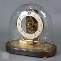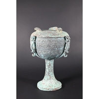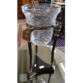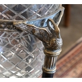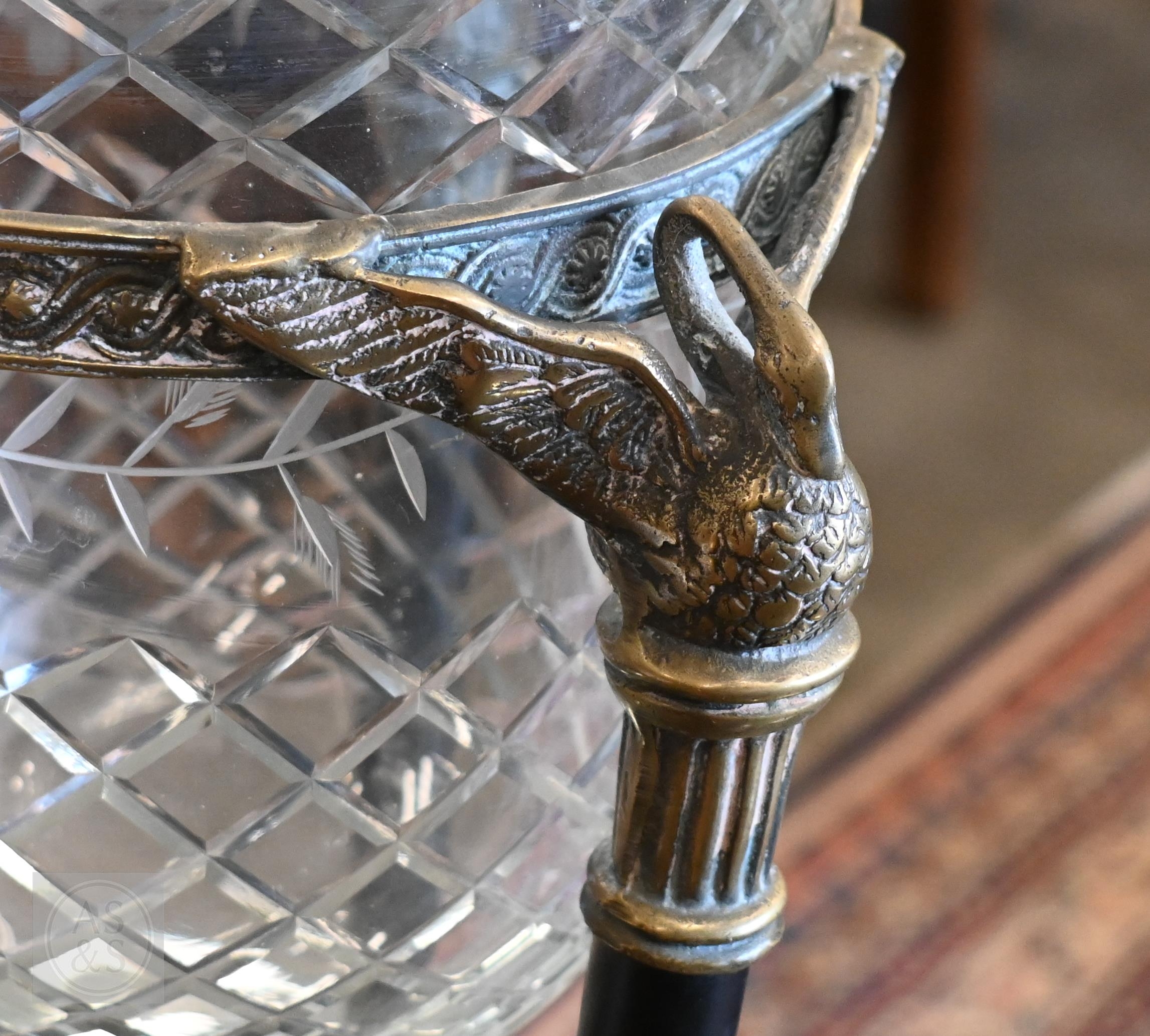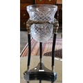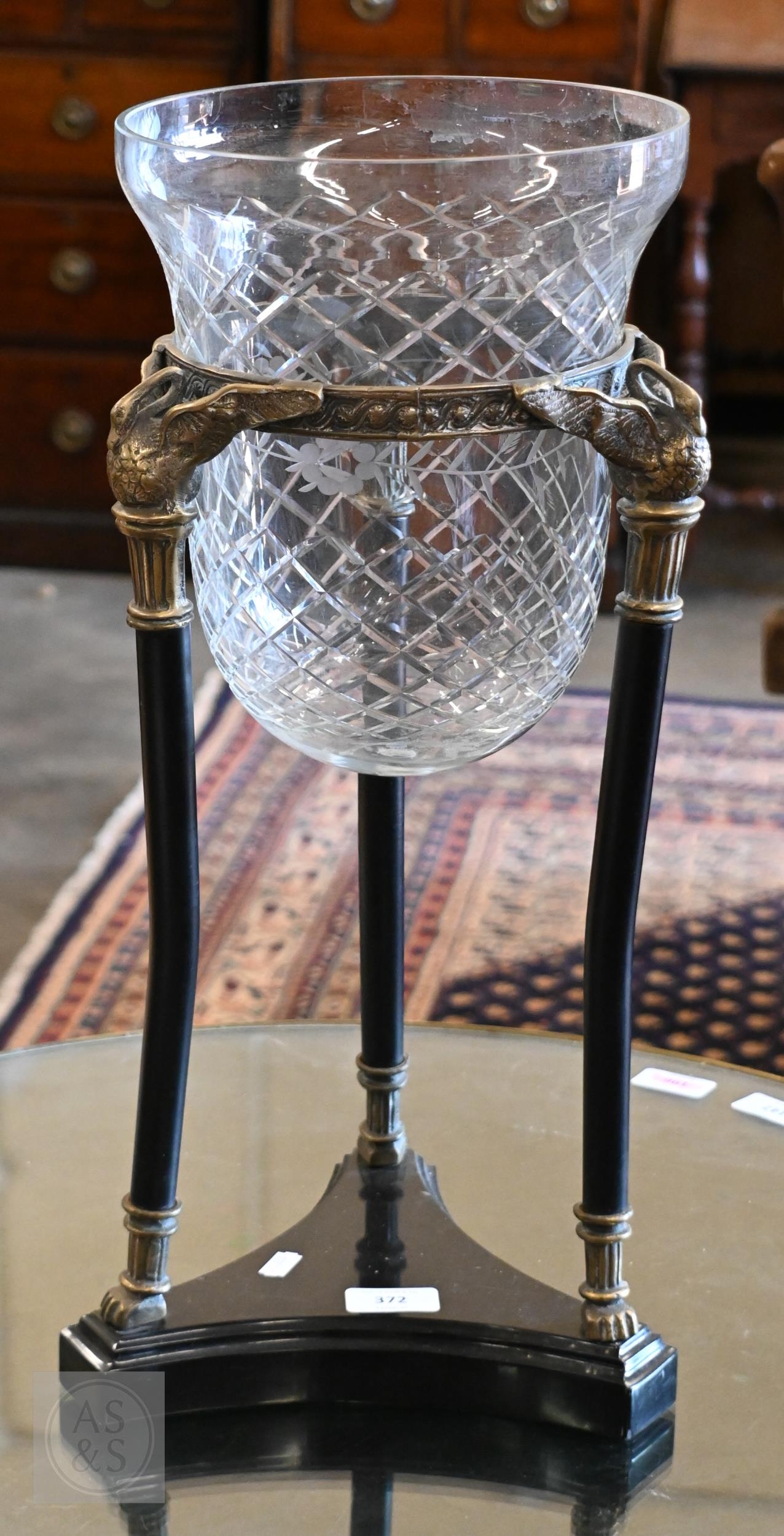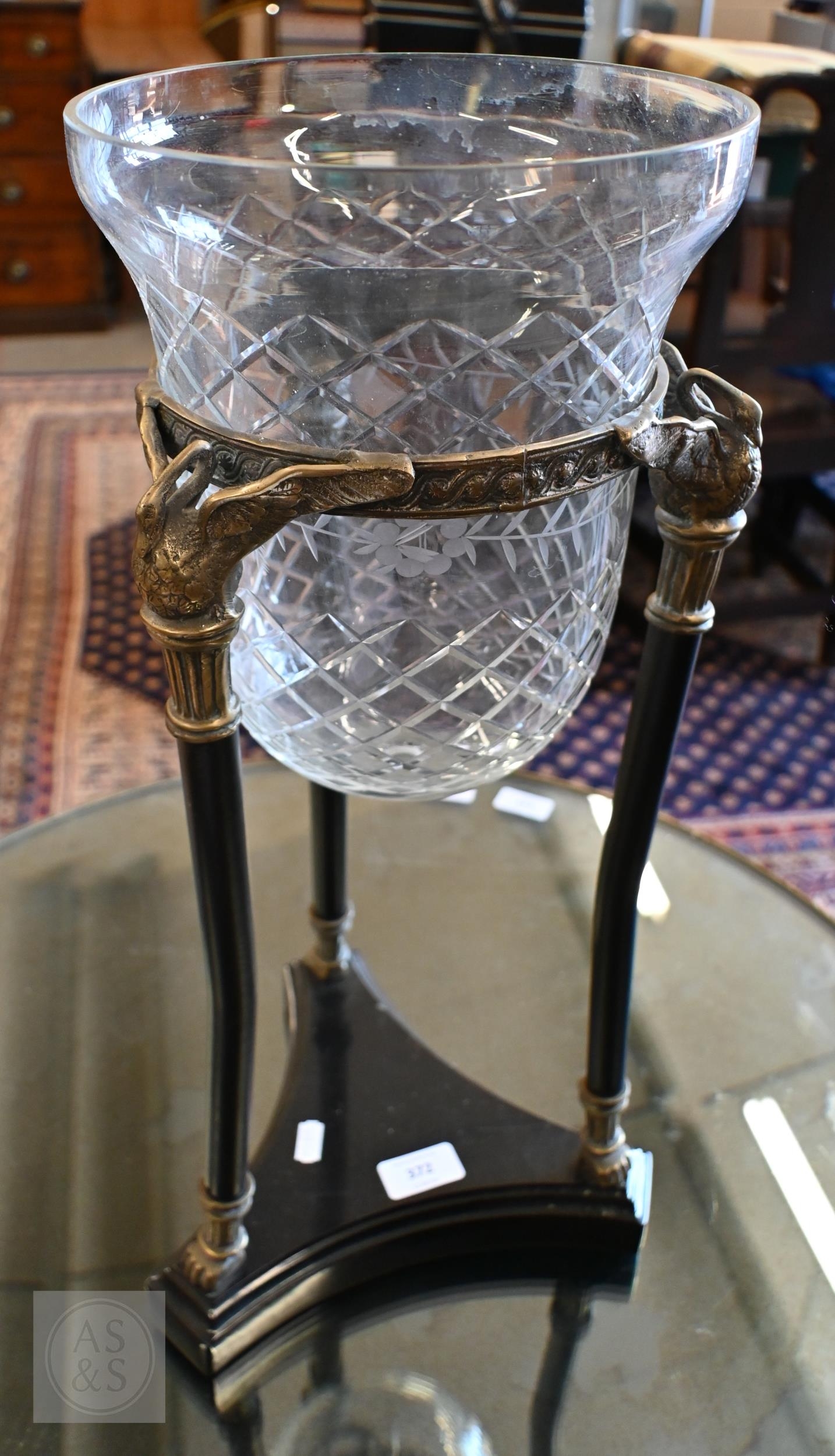 A cut and etched glass bowl on brass and slate tripod base, 52 cm