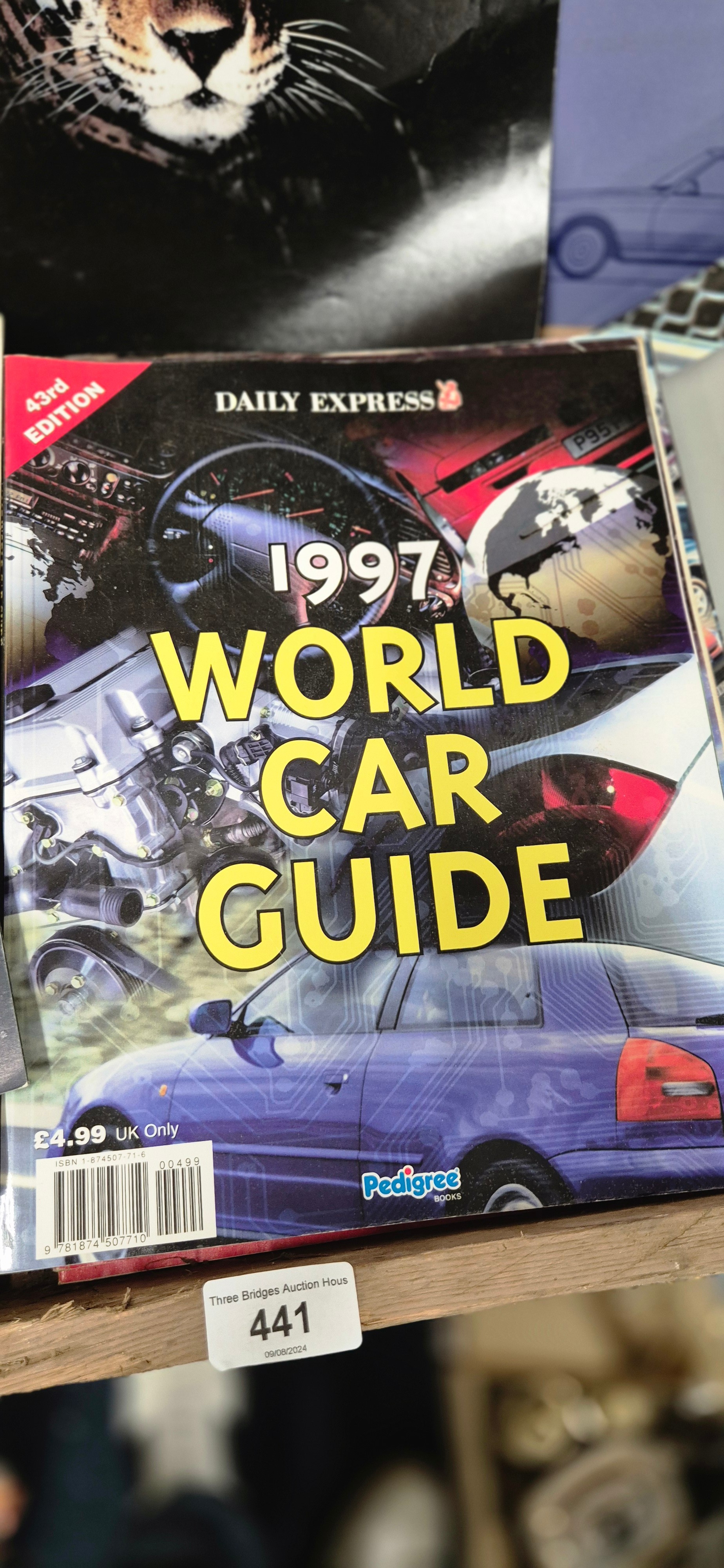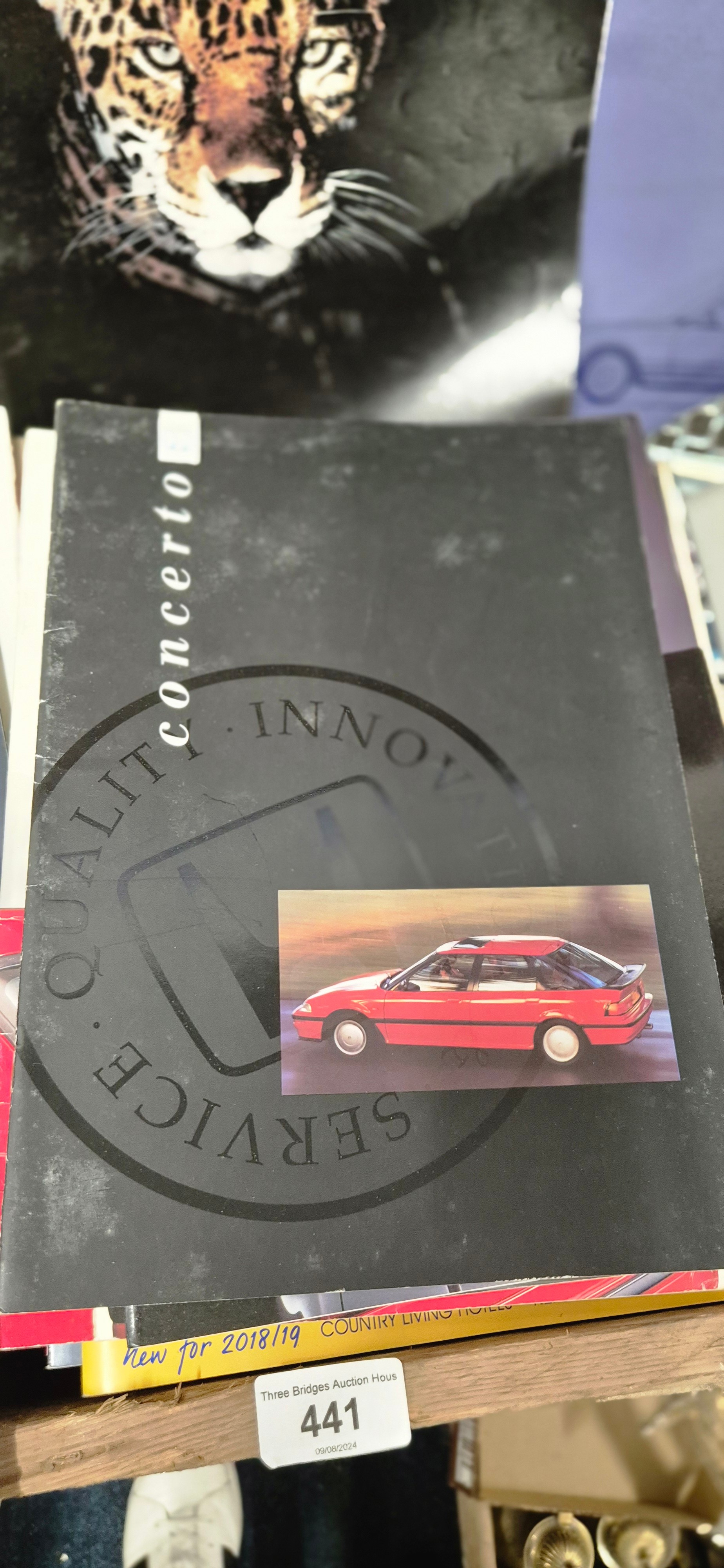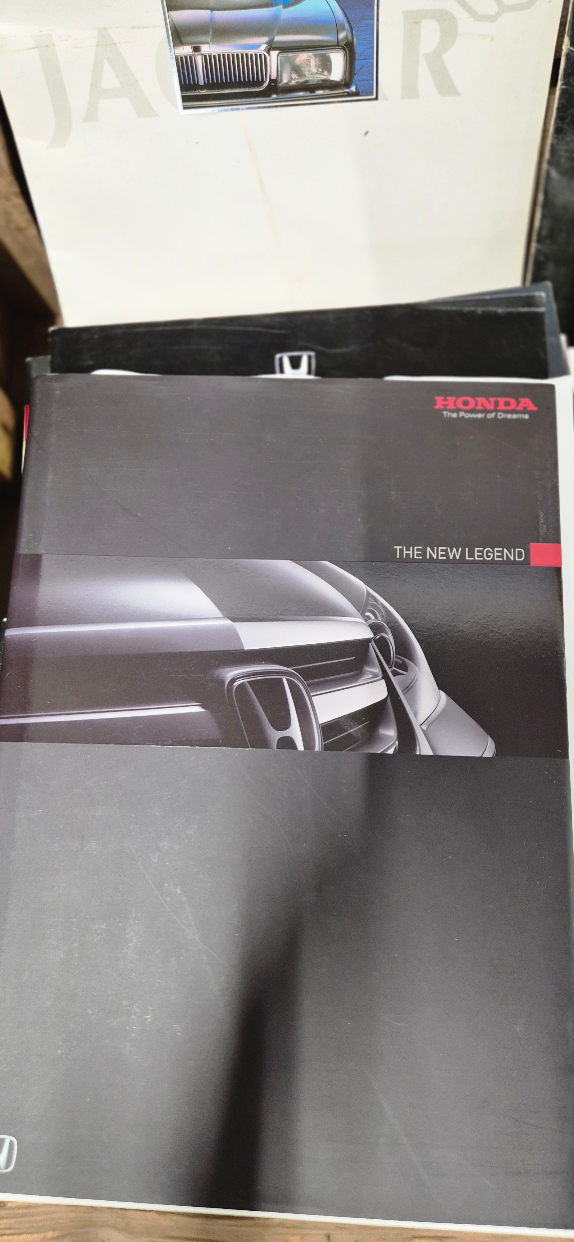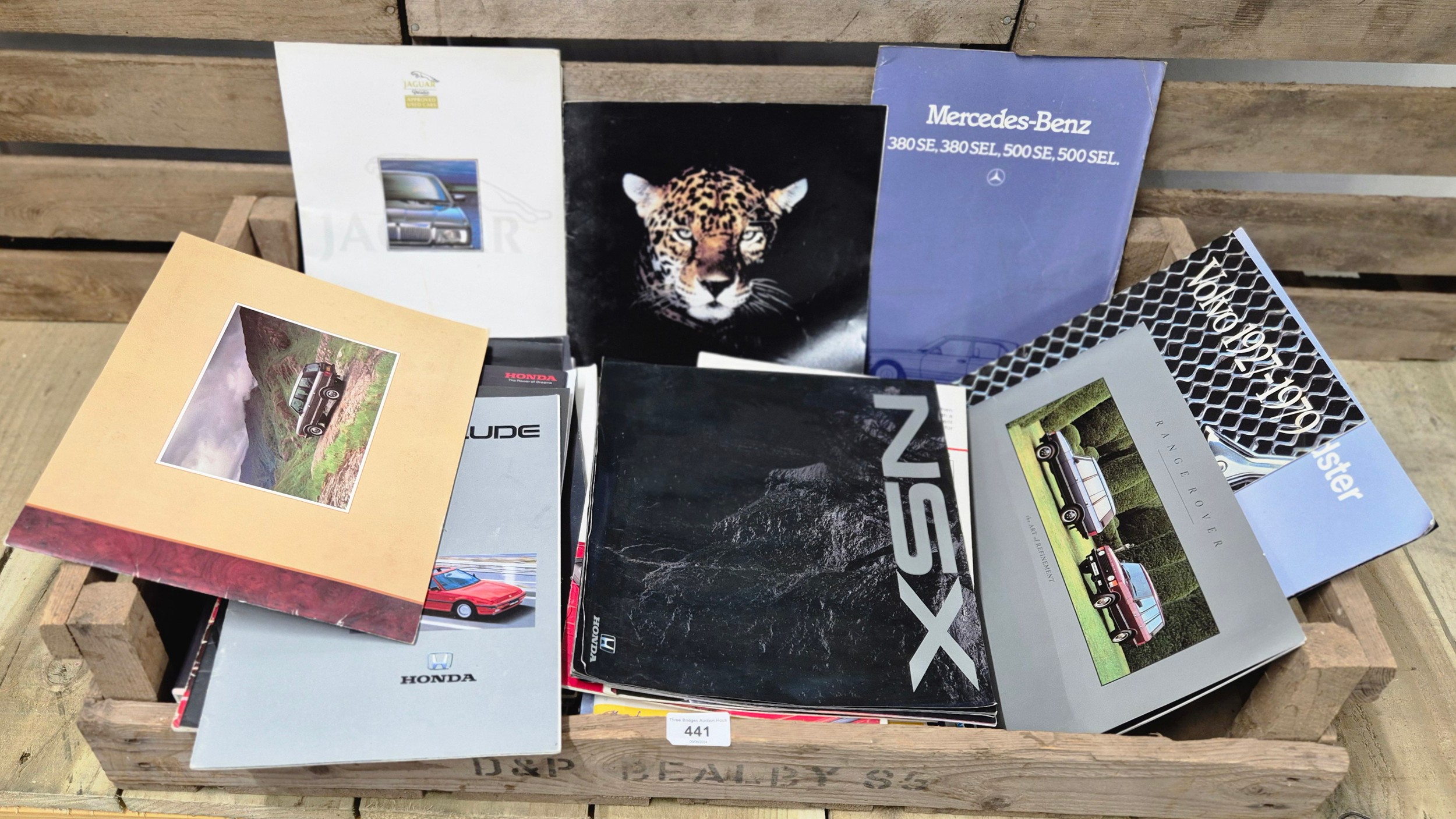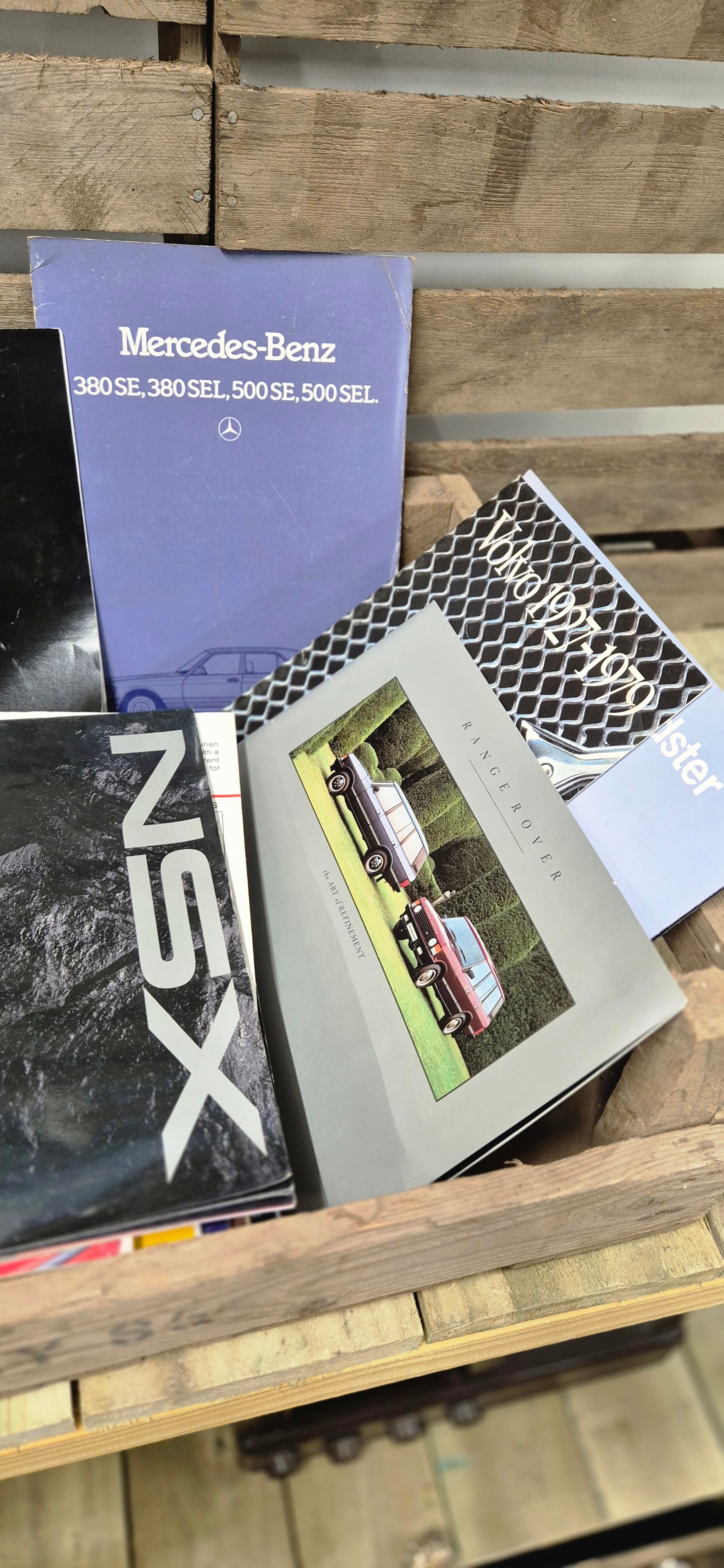A Crate of vintage car brochures to include Honda, Land Rover, Jaguar and many more